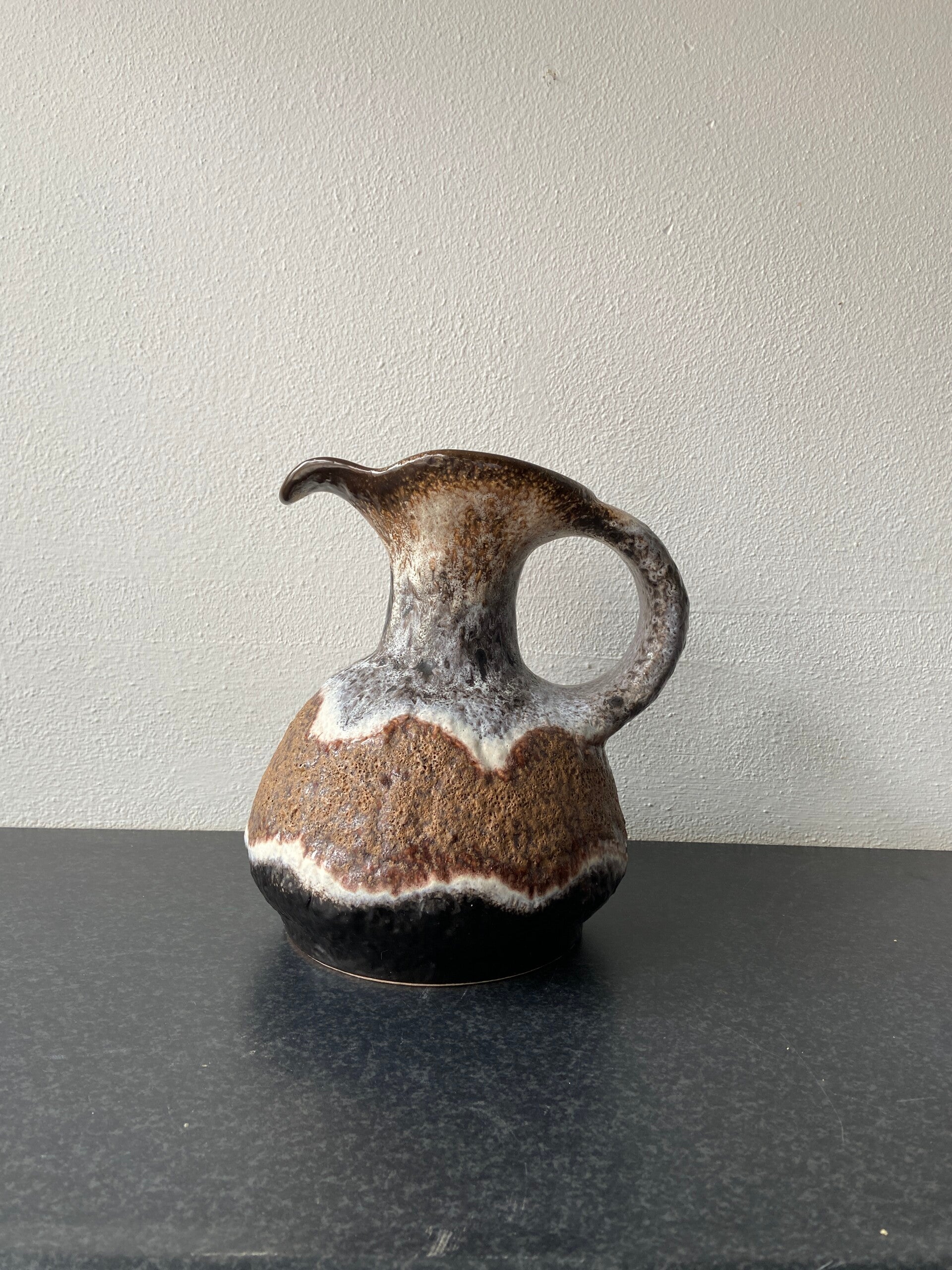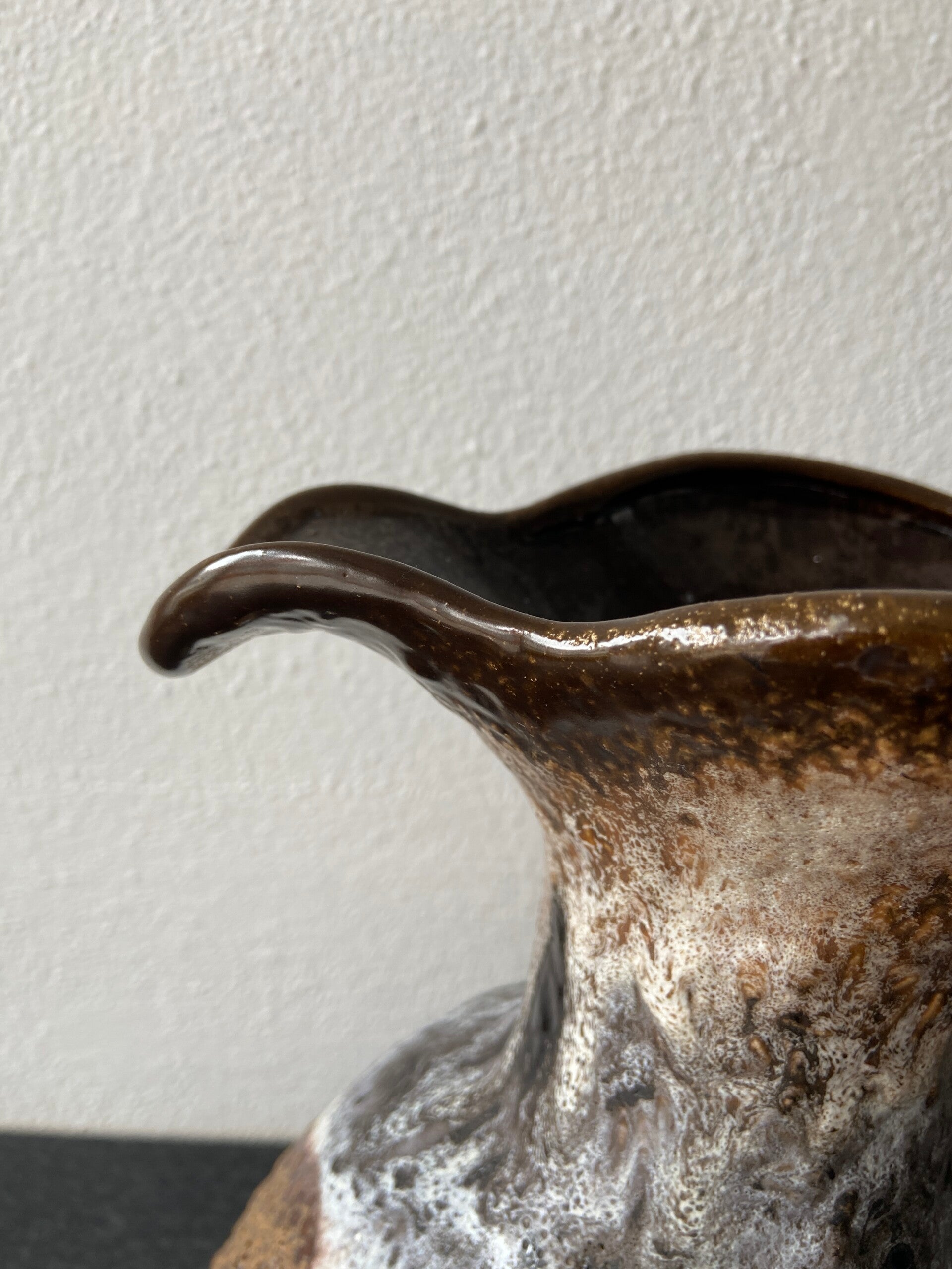 Zeldzame West Germany vaas in een brutalistische uitvoering! De vaas is gemaakt van bruin, caramel en wit keramiek met fat lava accenten. De binnenkant is donkerbruin geglazuurd.