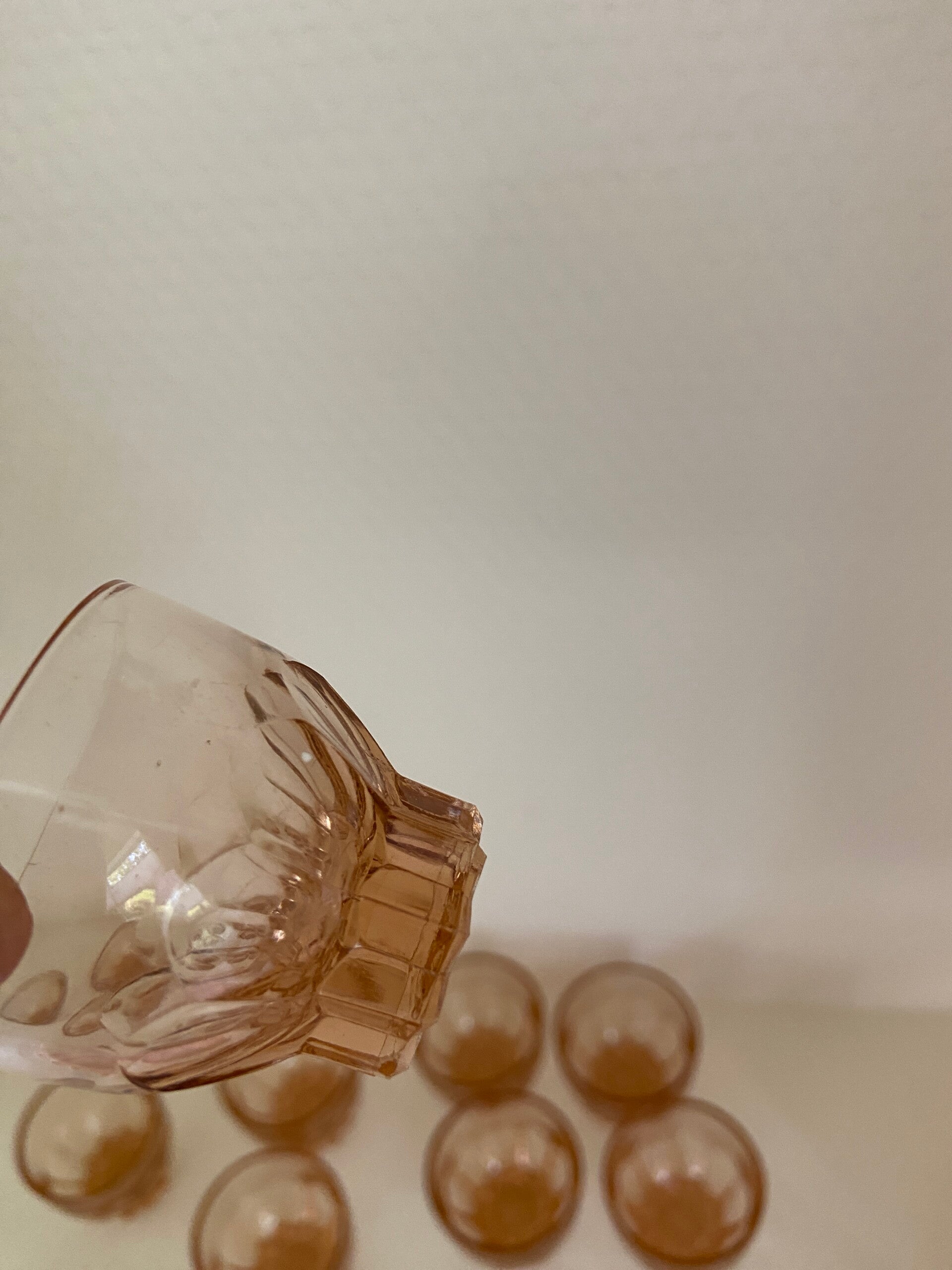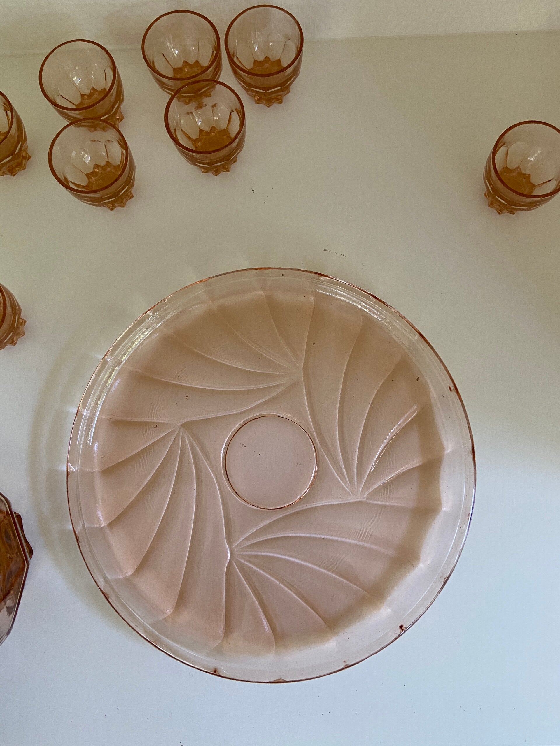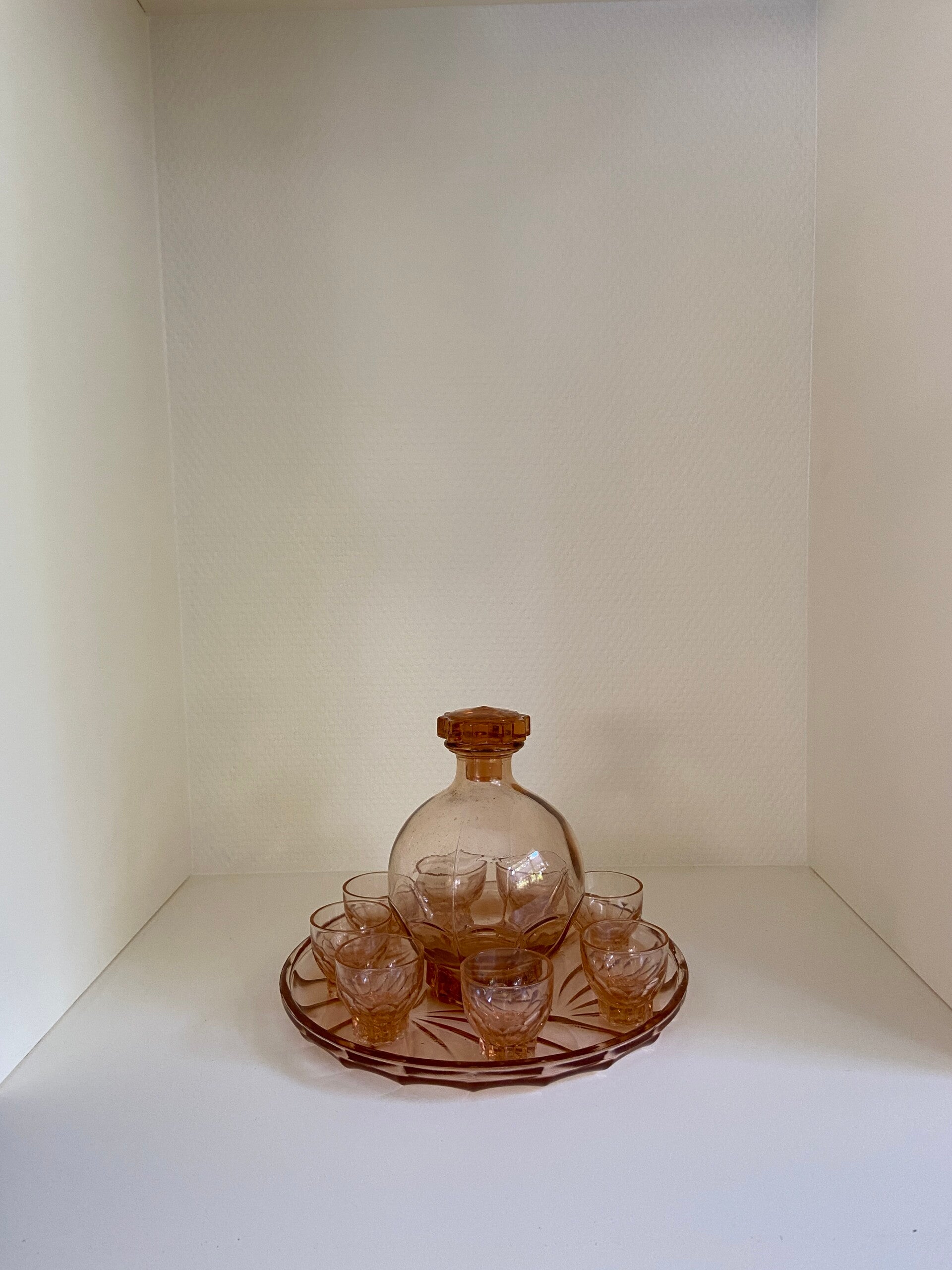 Deze prachtige set bestaat uit een likeurfles met stop, 8 kleine glaasjes en een serveerblad. De set verkeert in zeer mooie staat.