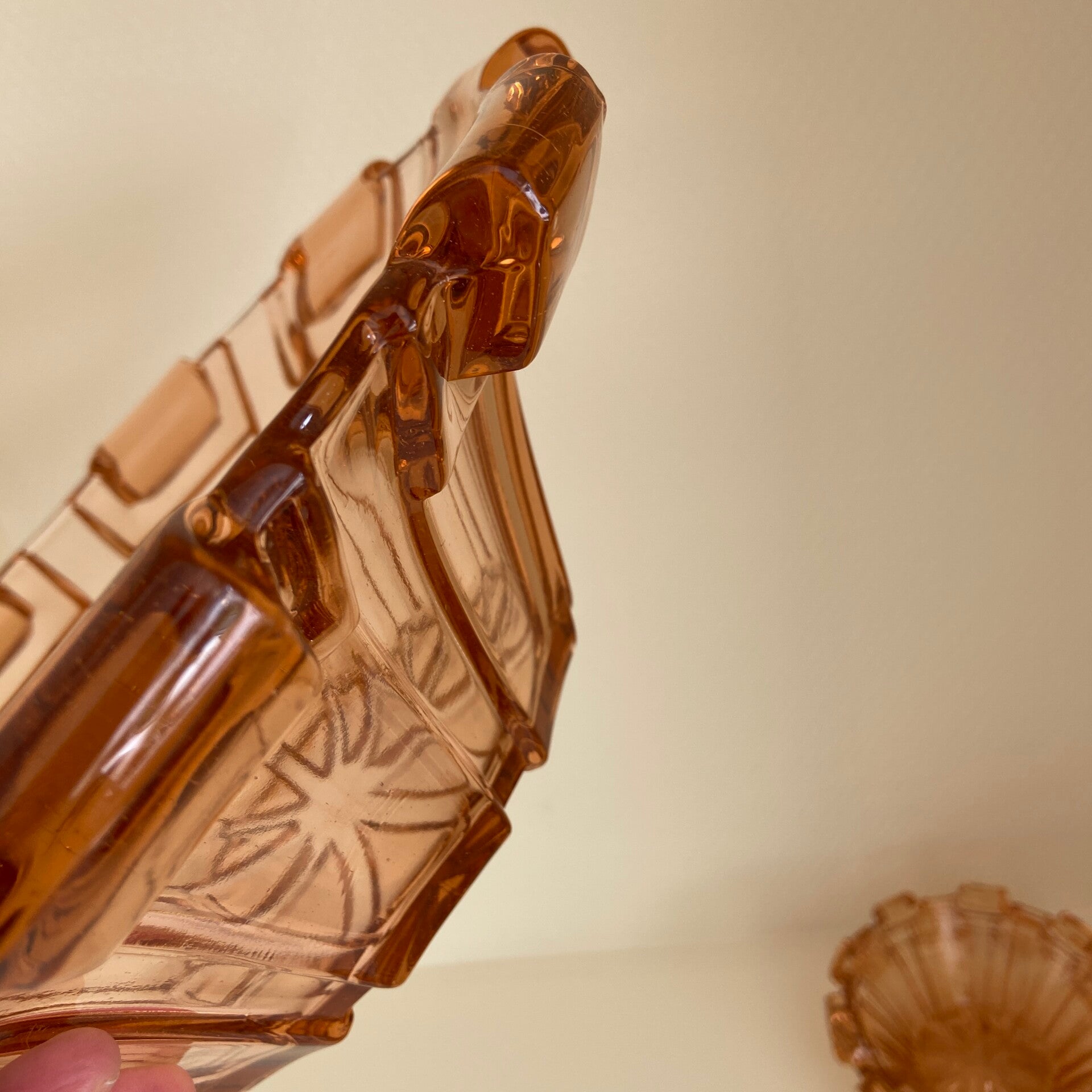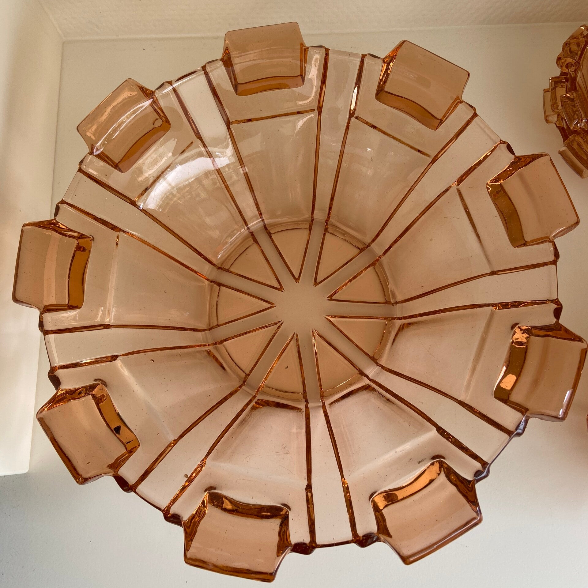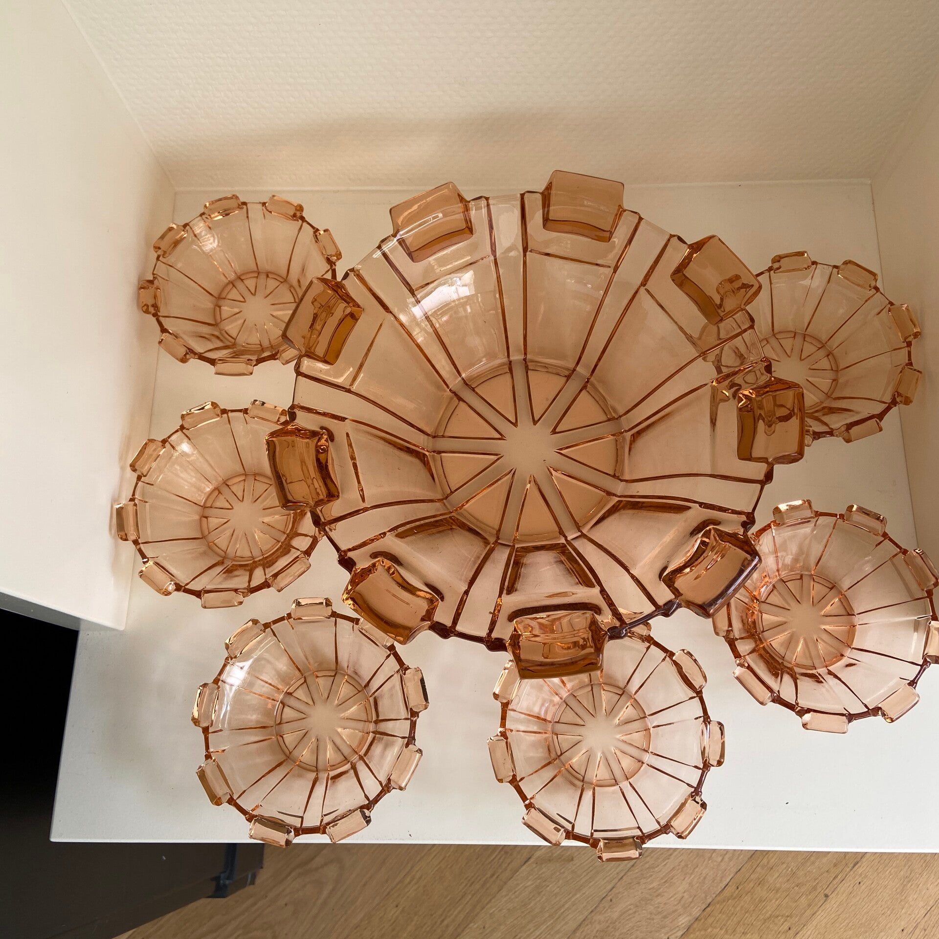 7-delige Art Deco schalenset van rosaline glas Hermanova Hut Glassware
