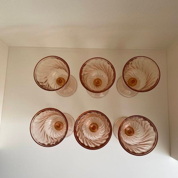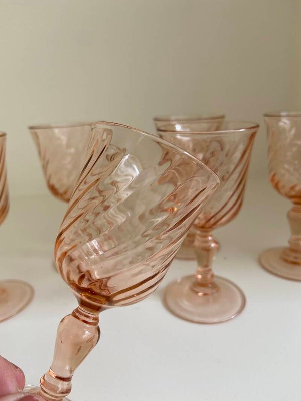 Heerlijke set van 6 roze vintage wijnglazen met swirl. De set is gemerkt 'France' en verkeert in zeer mooie staat.