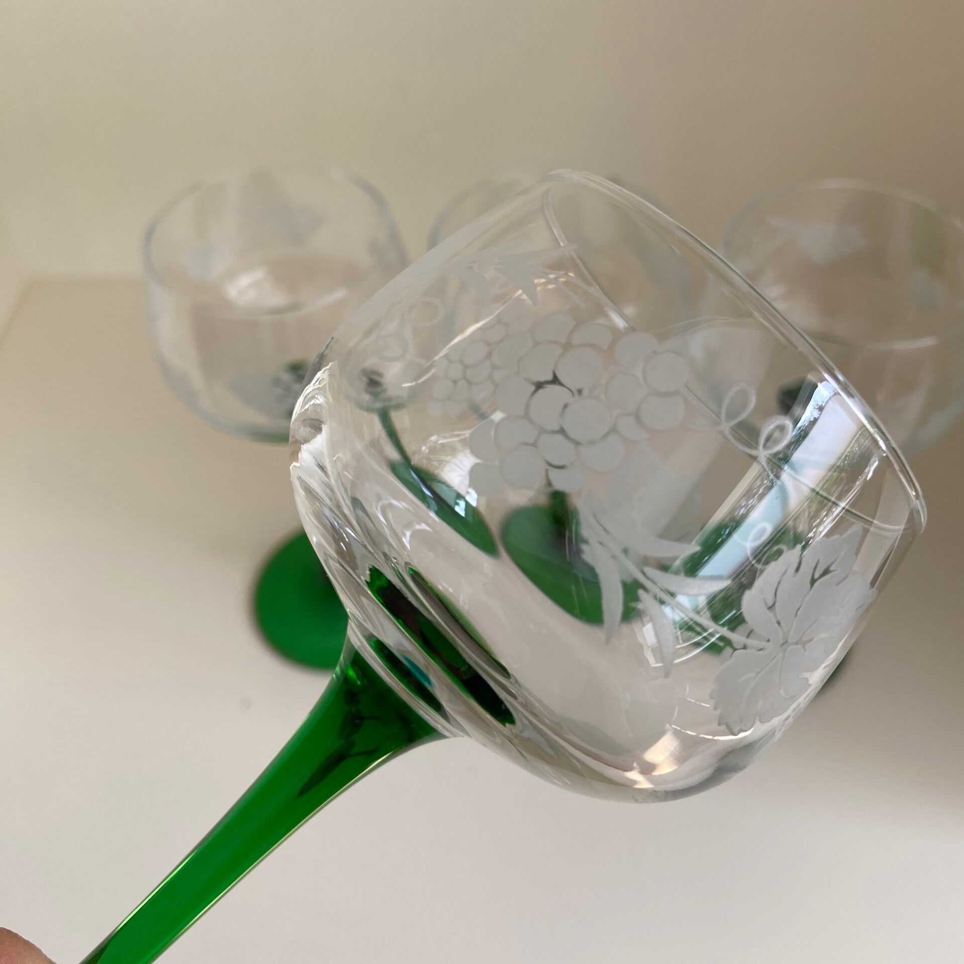 Ze blijven mooi deze Elzas wijnglazen op groene steel! Deze set heeft een bewerkt kelk en verkeert in topstaat.