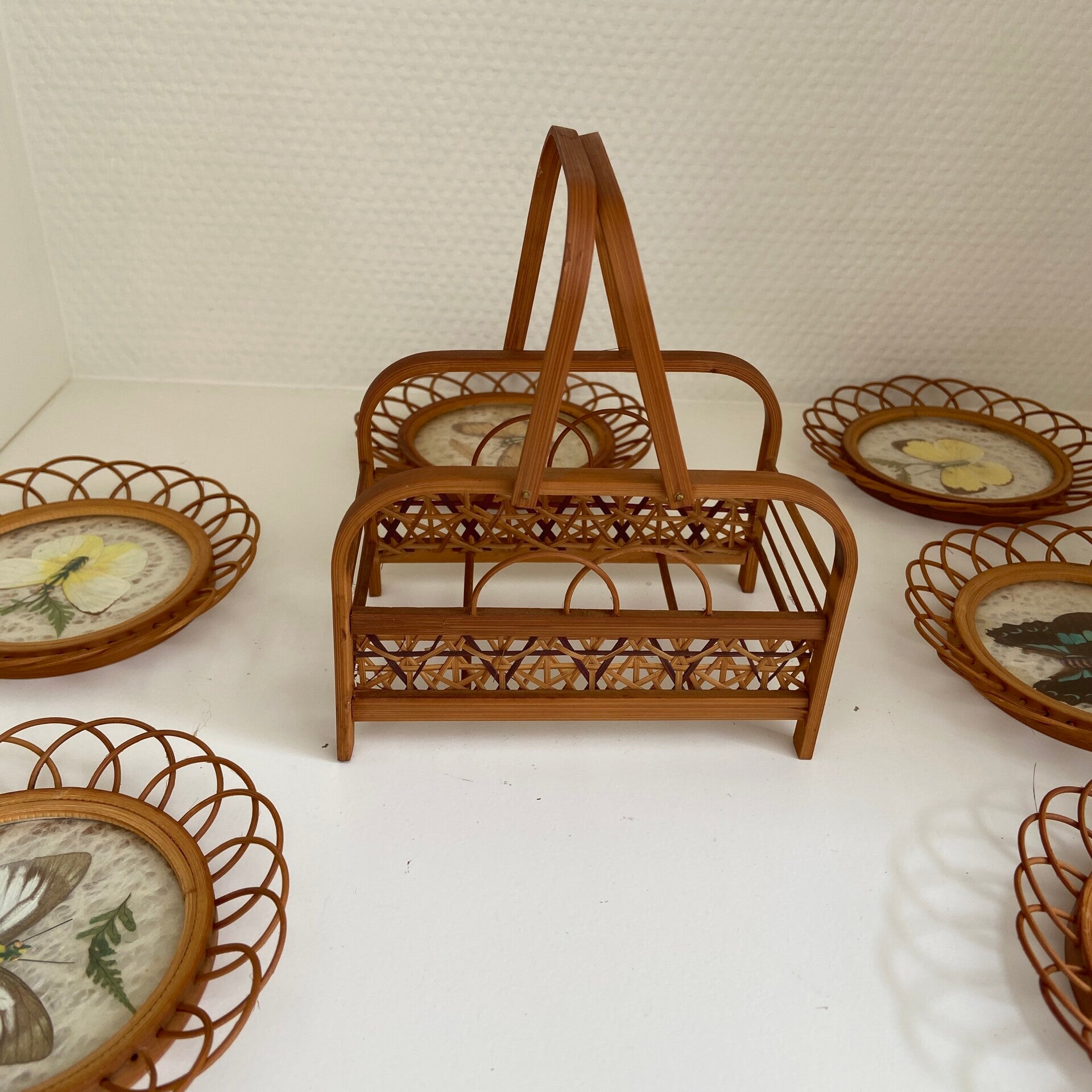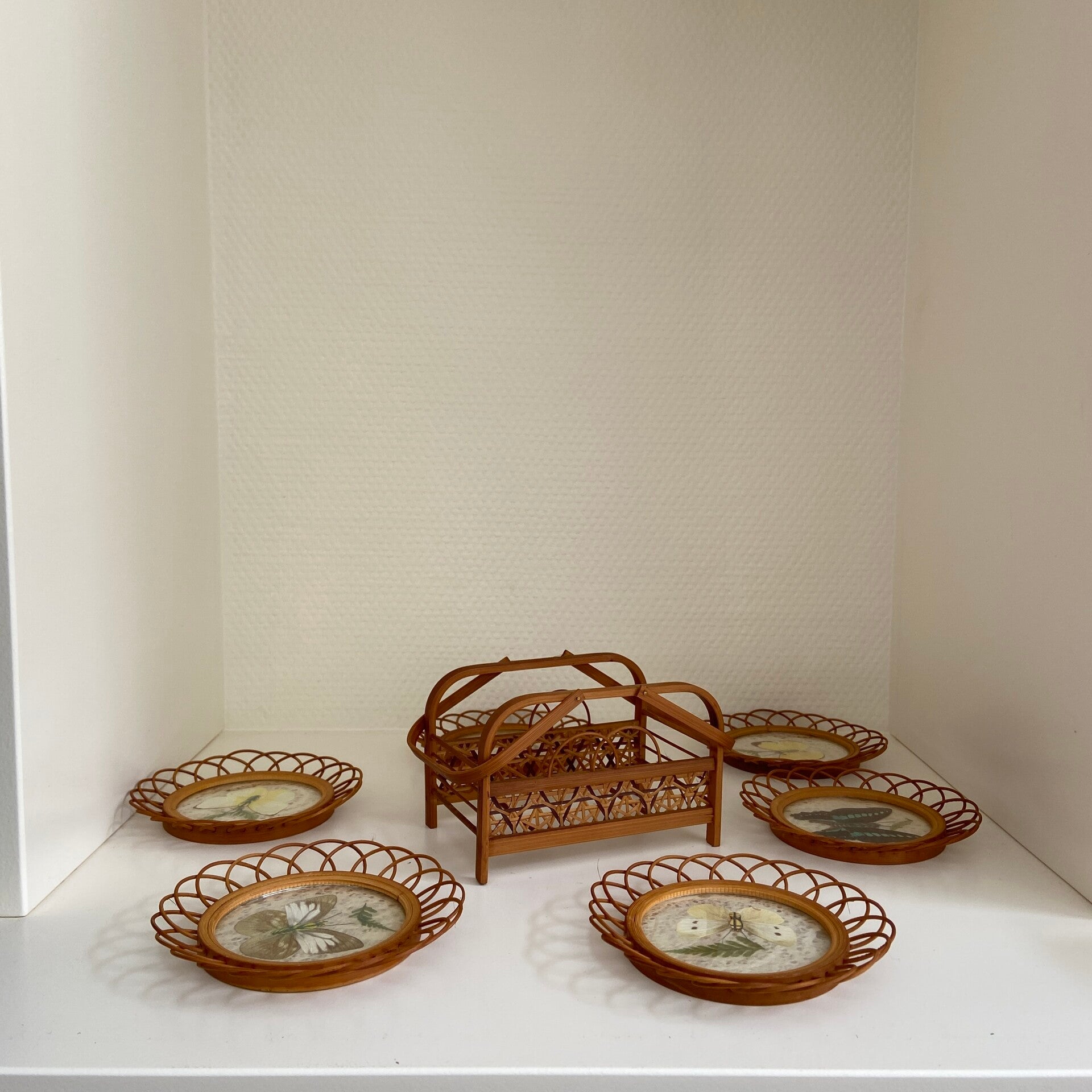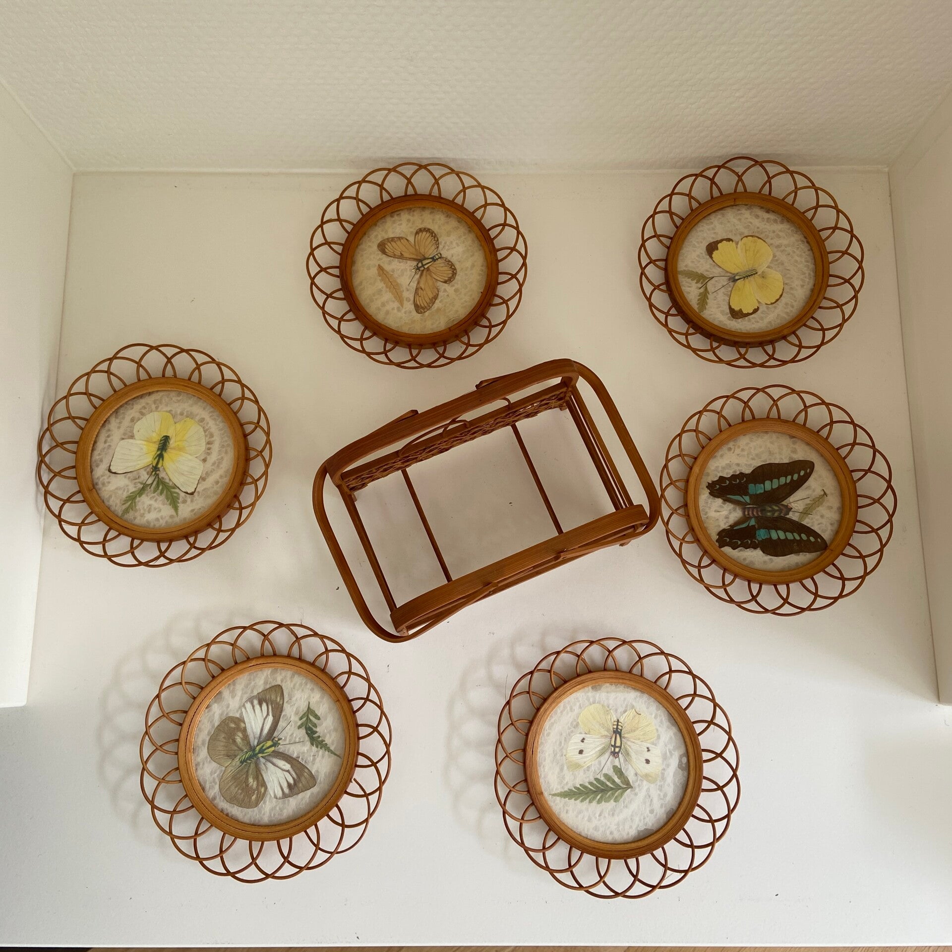 Set van 6 vintage rotan onderzetters met vlinders in rotan houder