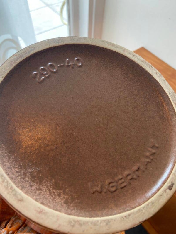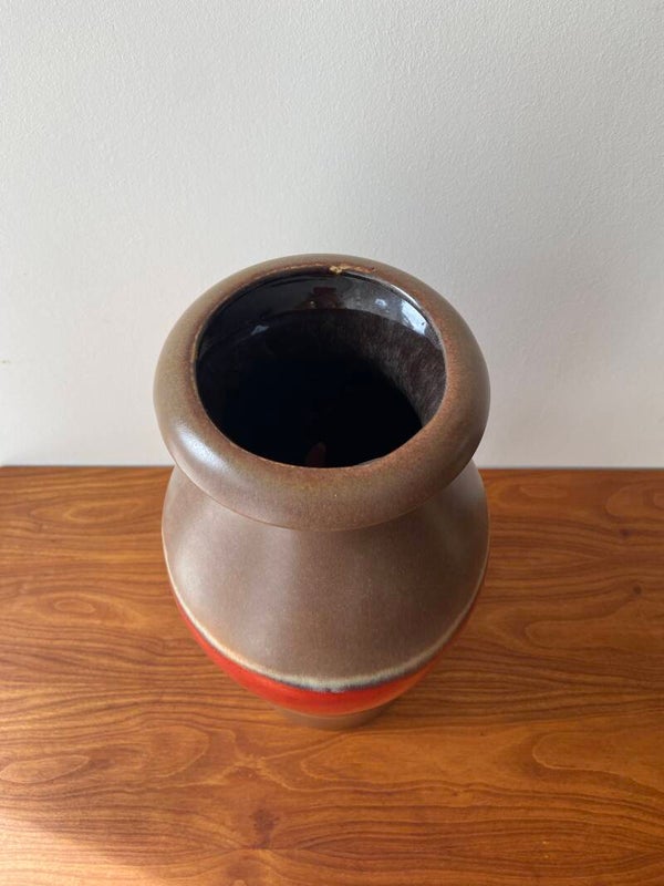 West Germany vloervaas in caramelbruin aardewerk met een rode en zandkleurige rand. In zeer goede staat.