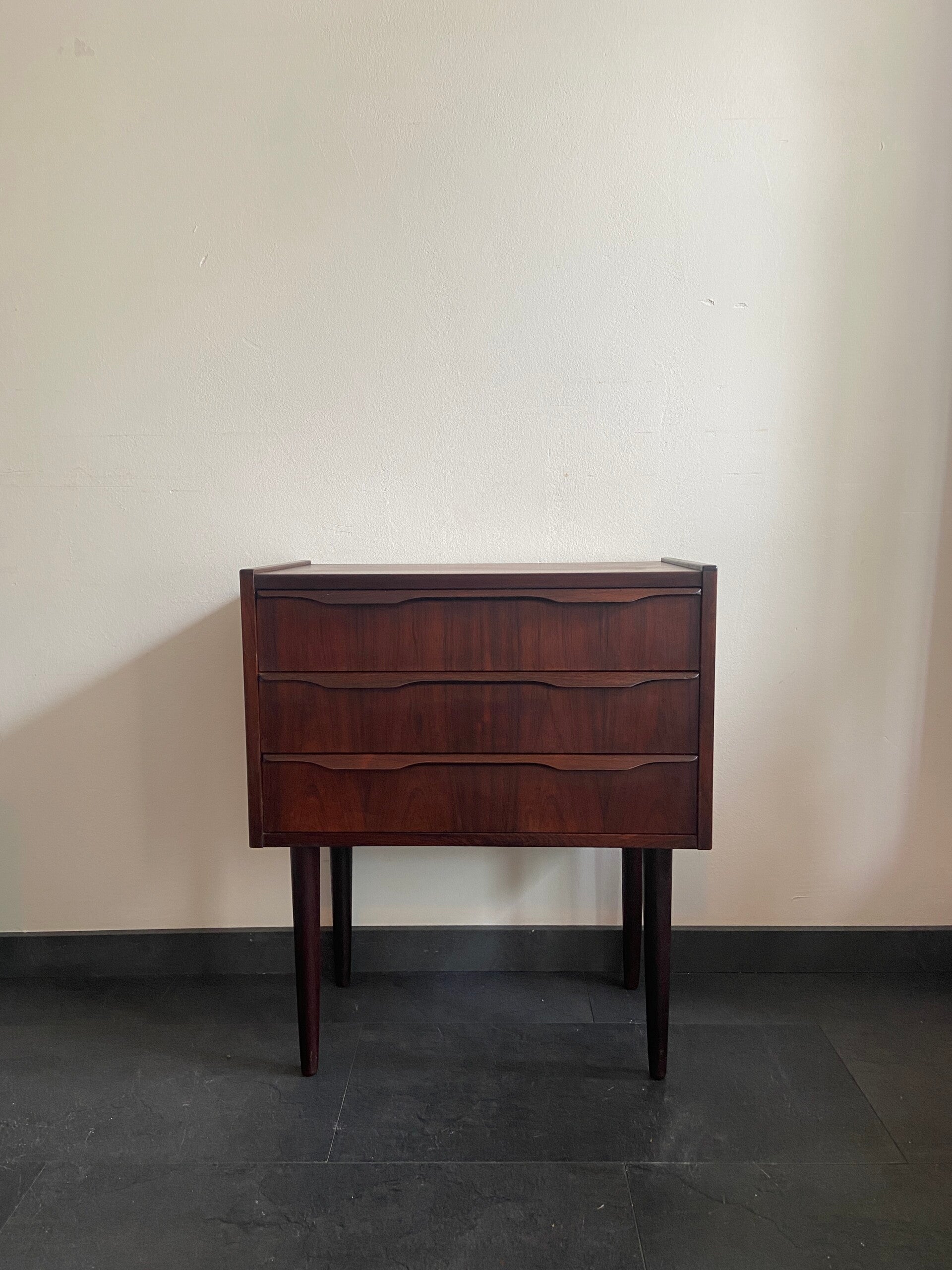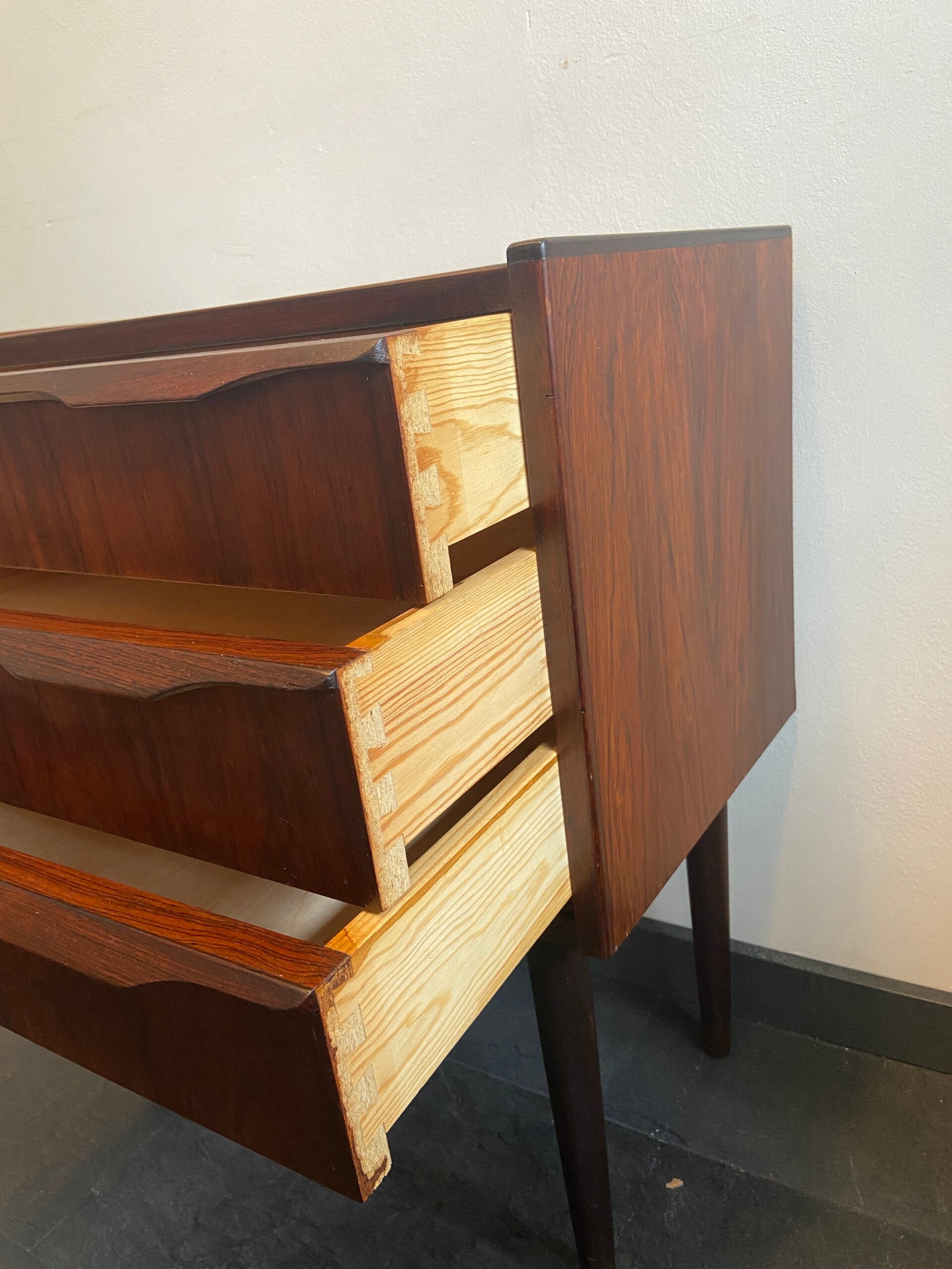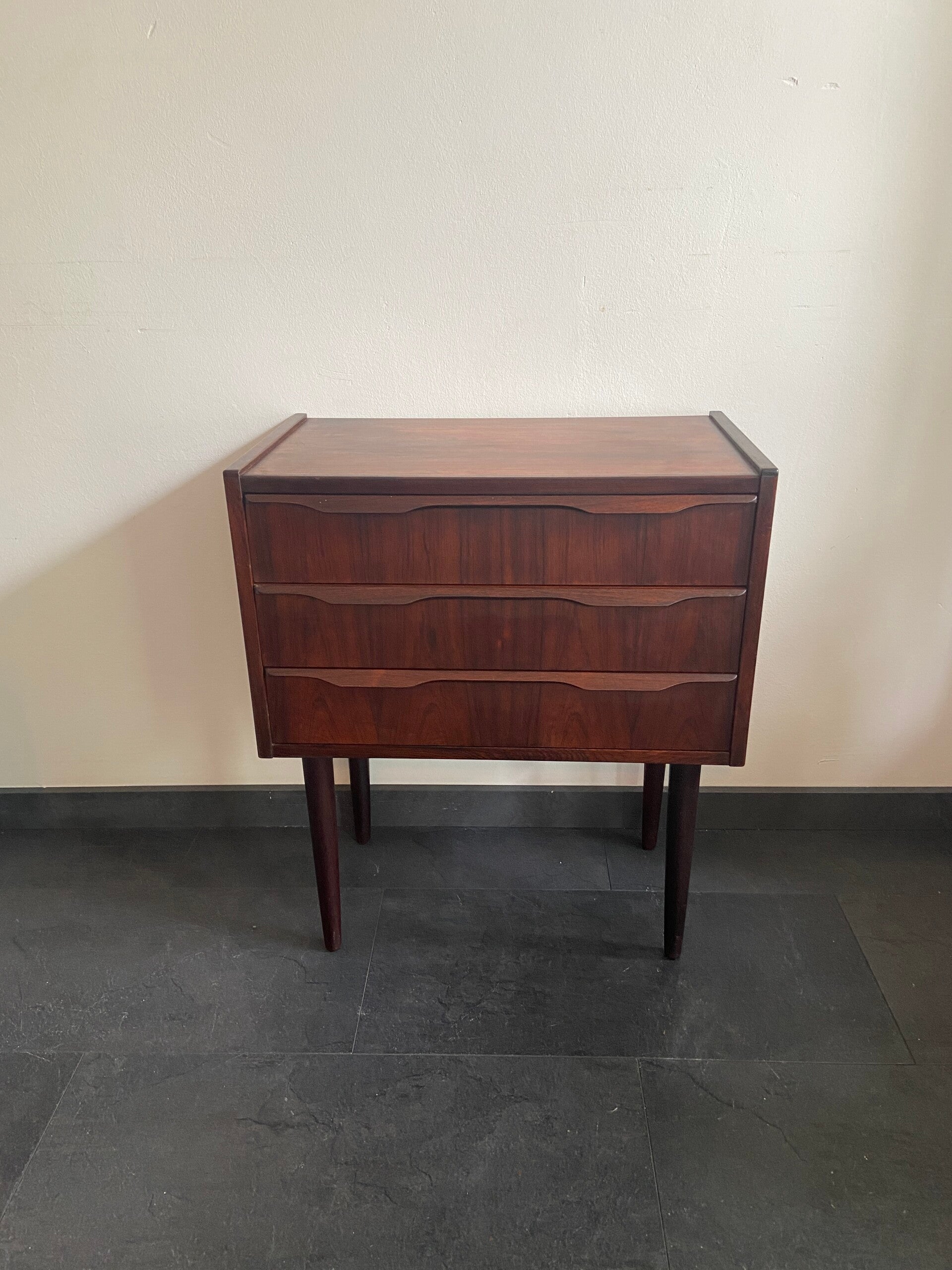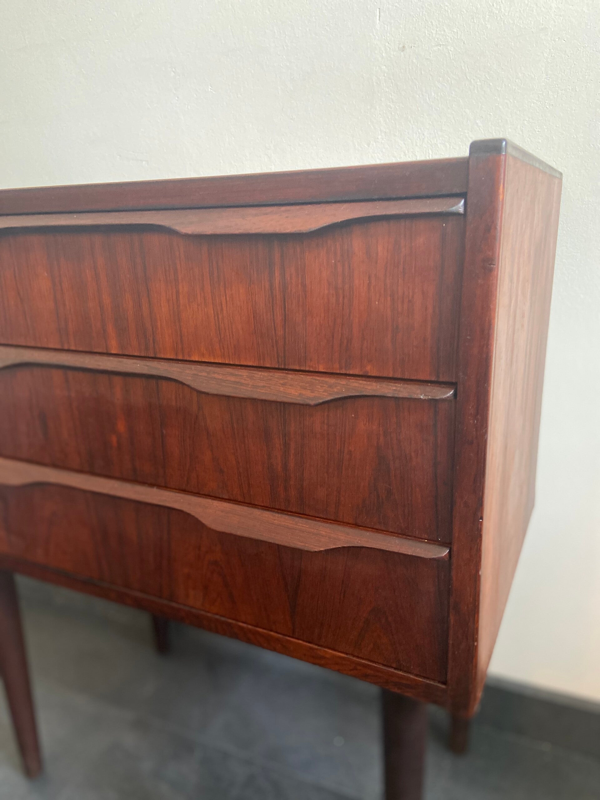 Bijzonder mooi ladekastje van palissander hout. Het kastje onderscheidt zich door de mooie vormgeving, sierlijke handgrepen en hoge taps toelopende poten. De kast verkeert in mooie staat met gebruikssporen passend bij de leeftijd.