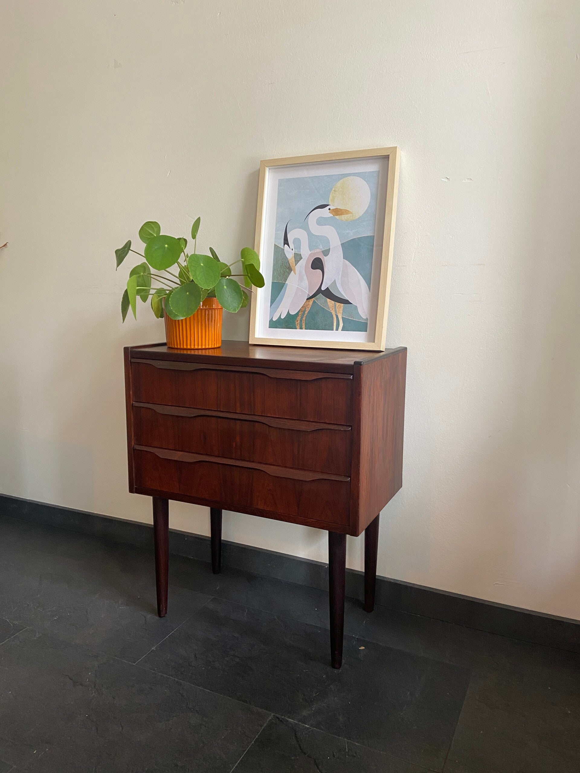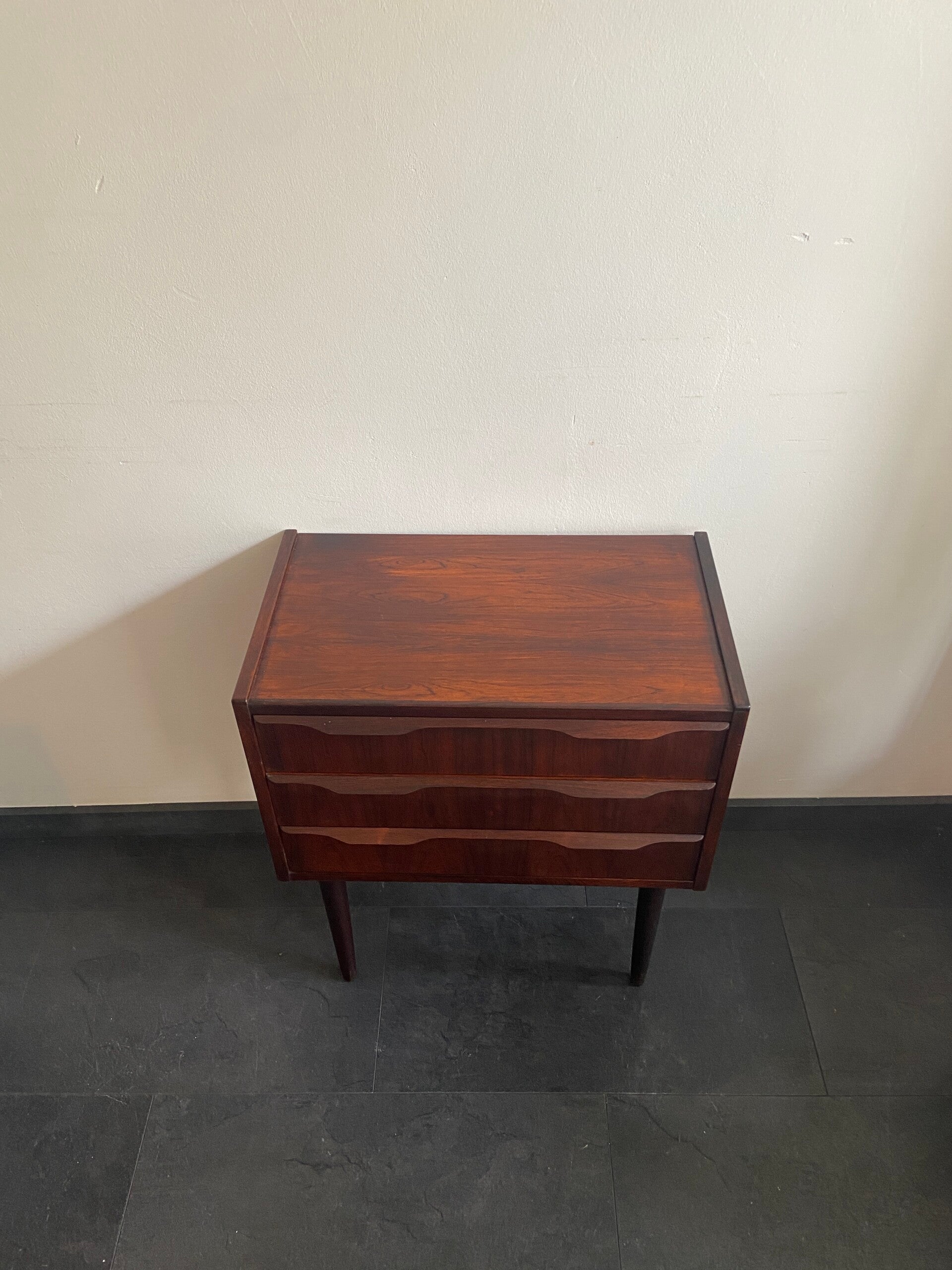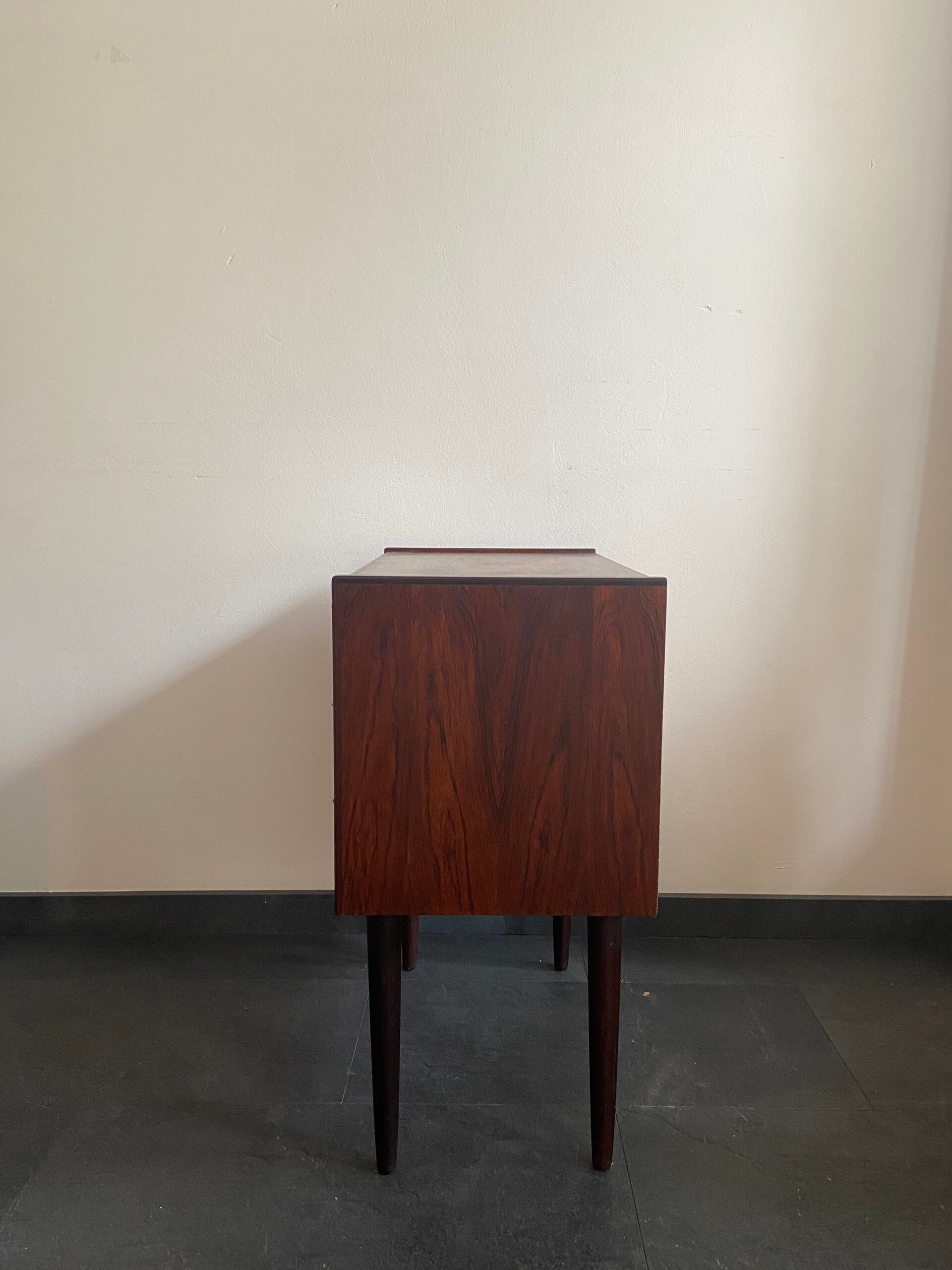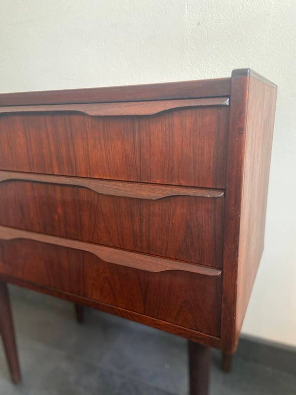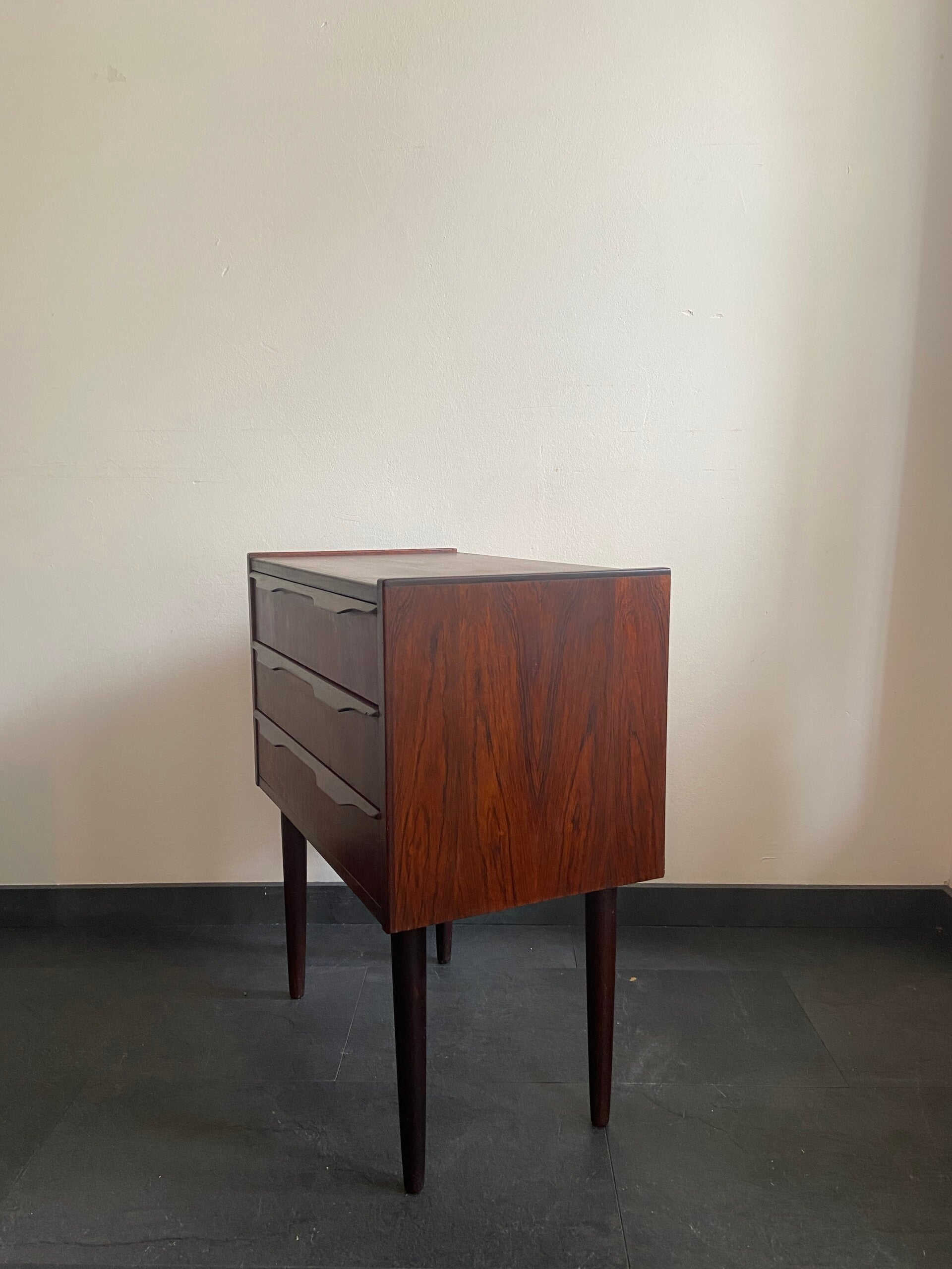 Bijzonder mooi ladekastje van palissander hout. Het kastje onderscheidt zich door de mooie vormgeving, sierlijke handgrepen en hoge taps toelopende poten. De kast verkeert in mooie staat met gebruikssporen passend bij de leeftijd.