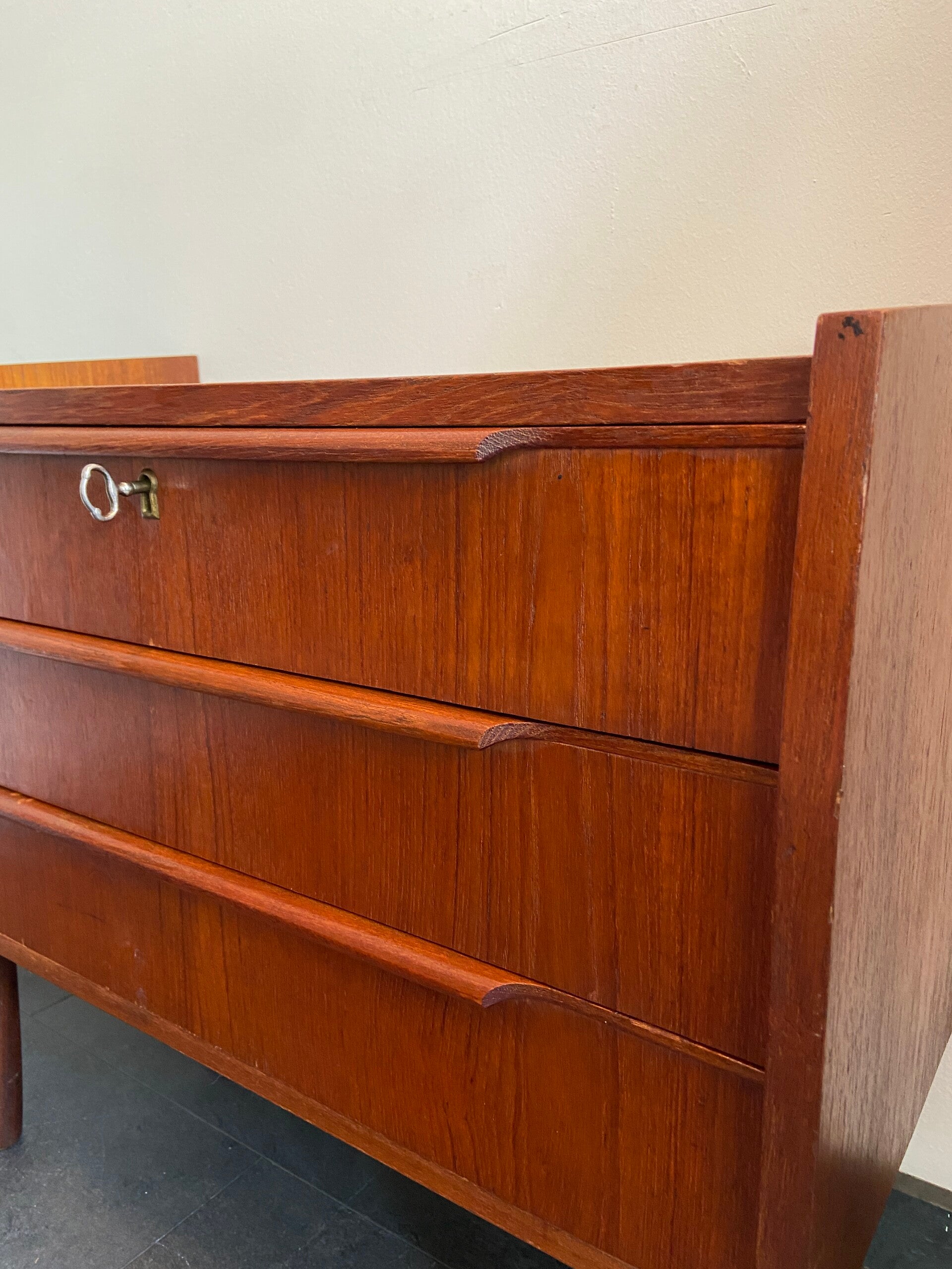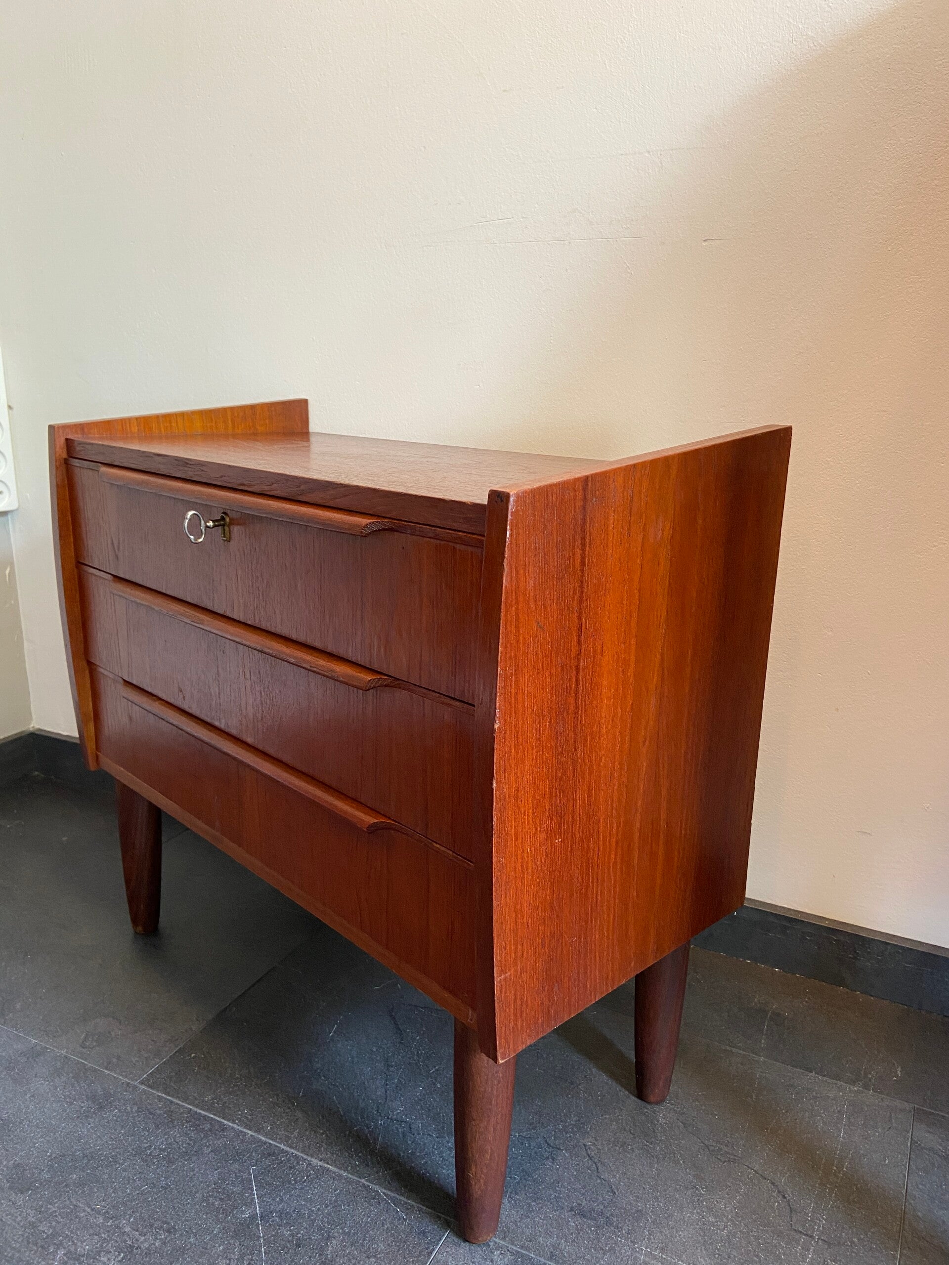Mooi vormgegeven compacte ladekast met 3 laden, waarvan de bovenste kan worden afgesloten. De kast heeft opvallend mooie, horizontale handgrepen en verkeert in goede staat.