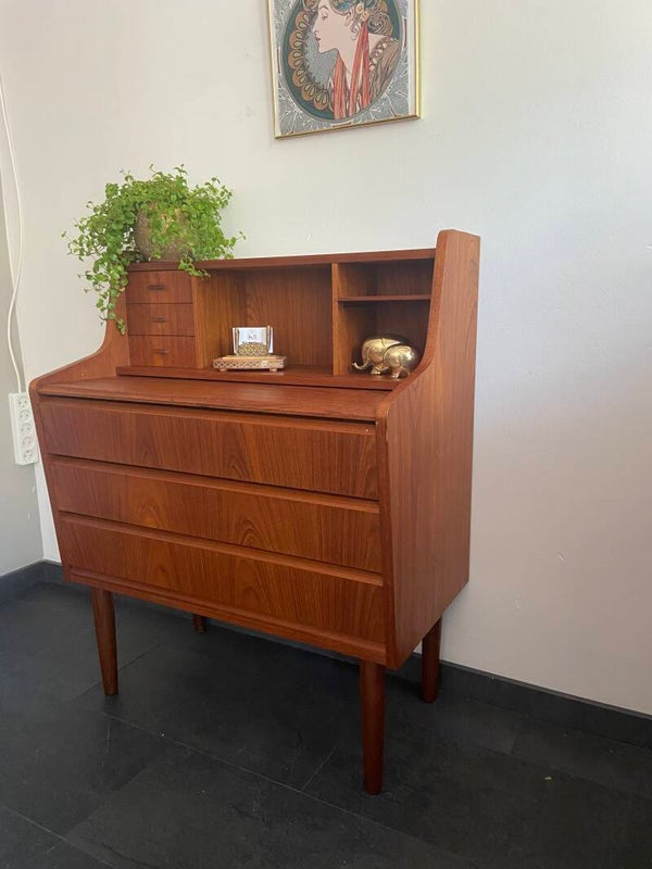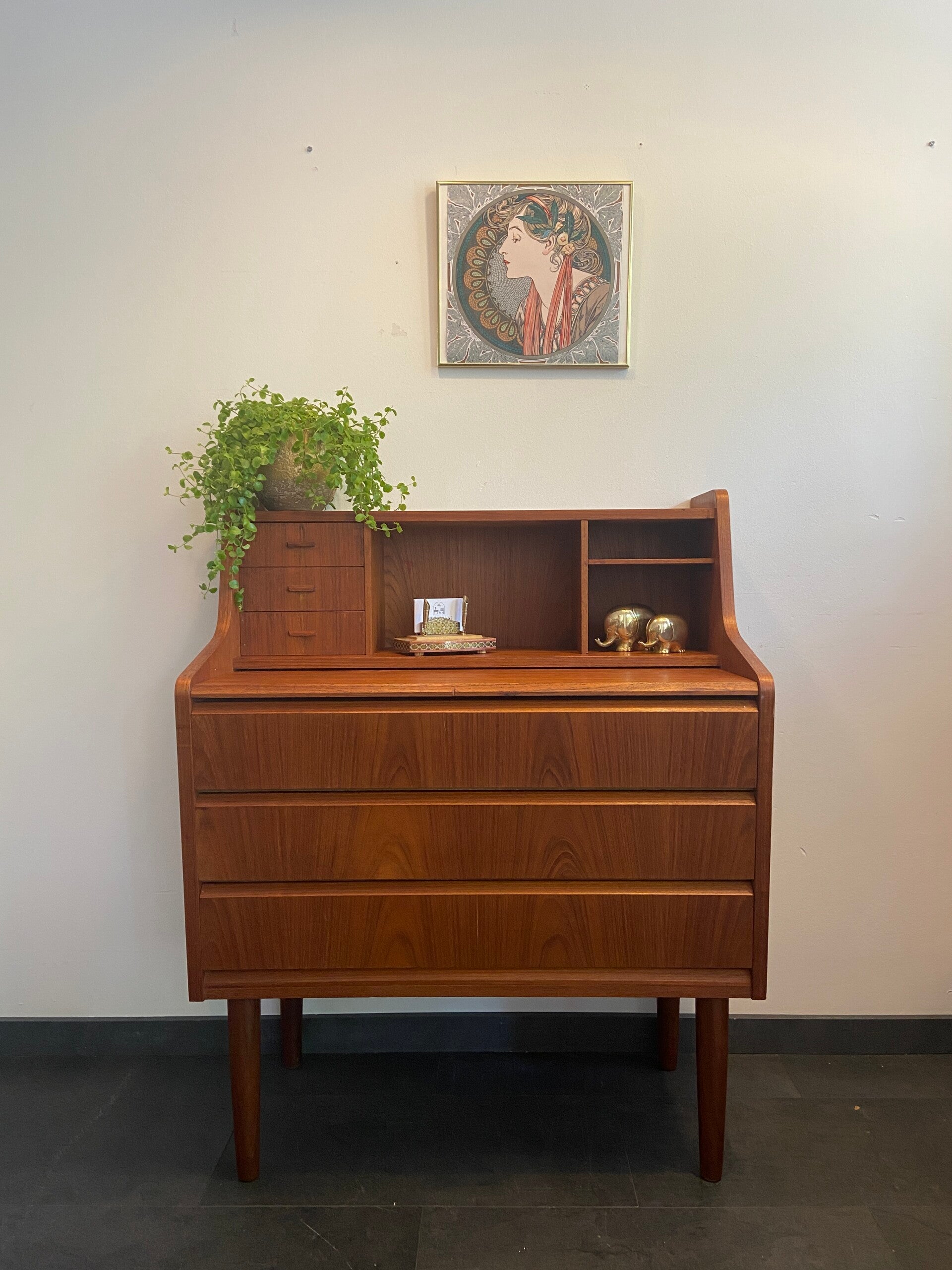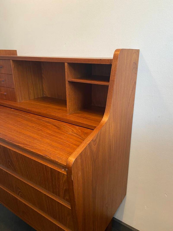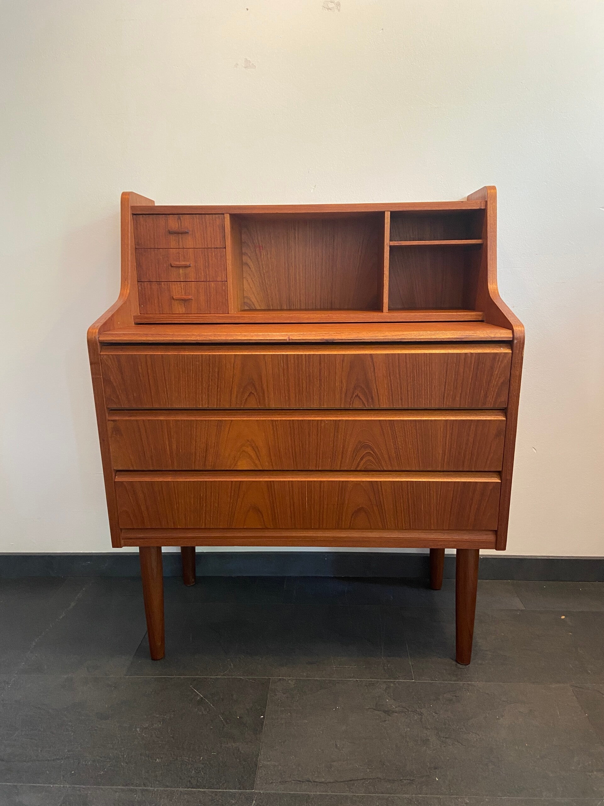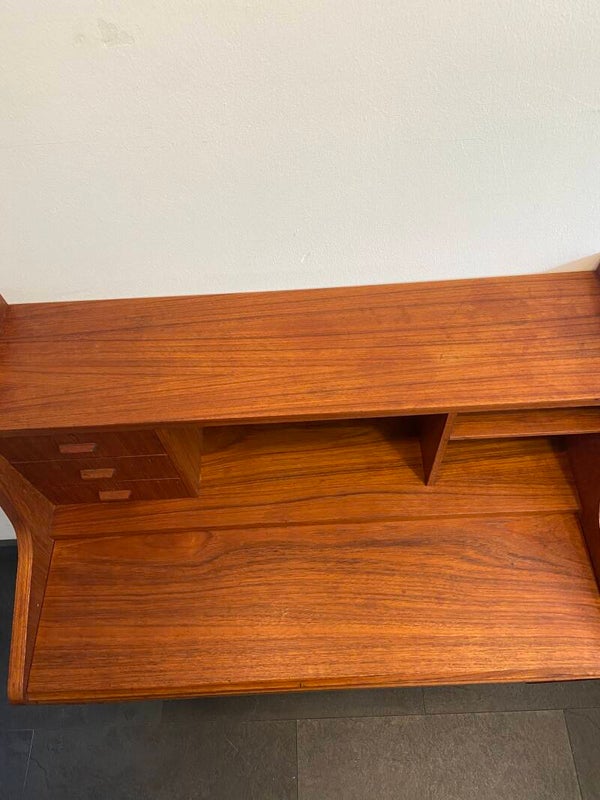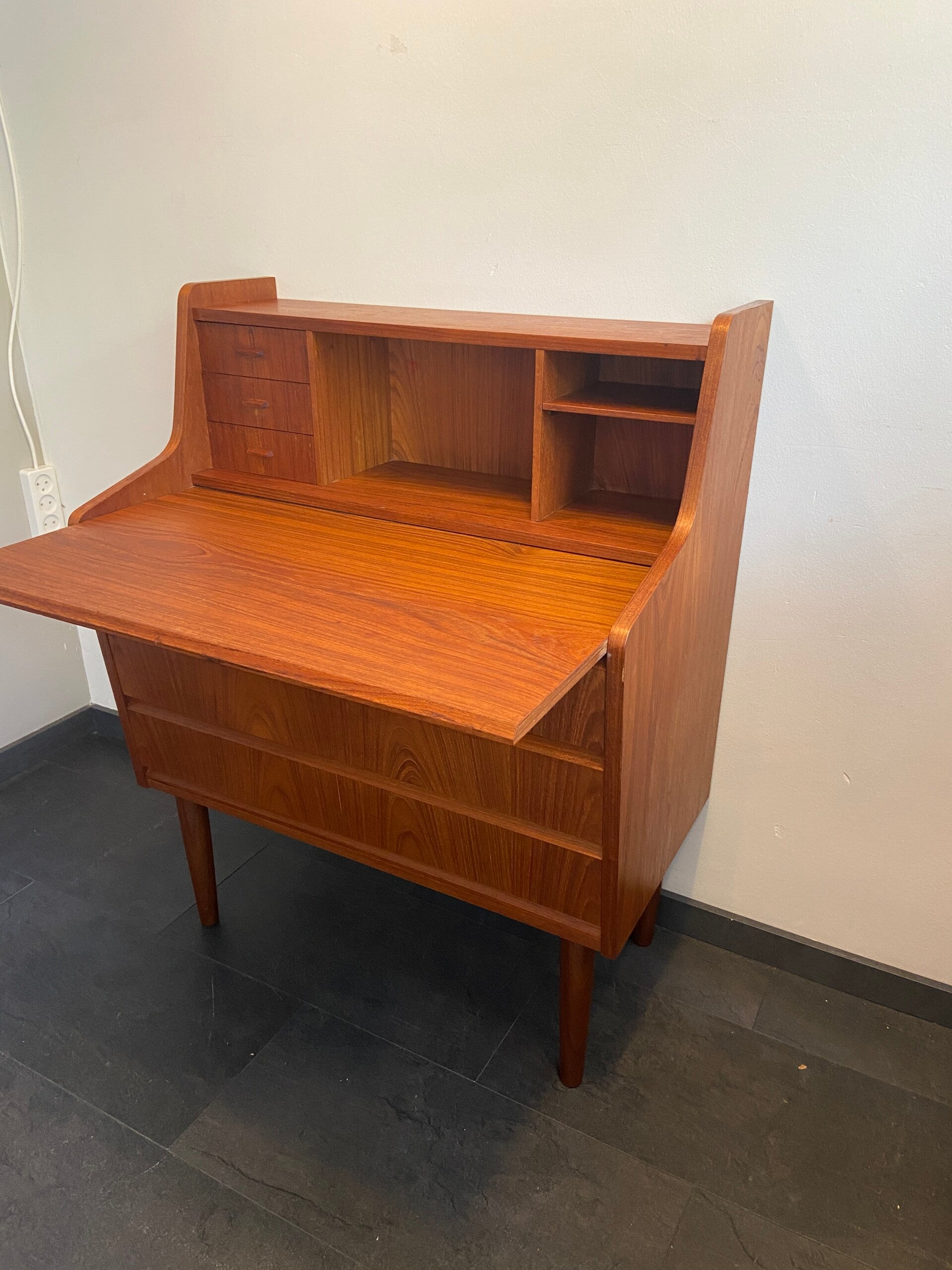 Zeer mooie, strak vormgegeven Deense secretaire van teakhout. De secretaire heeft links 3 kleine laden en onderin 3 grote laden die veel ruimte bieden. Het werkblad is uittrekbaar tot 66 cm en biedt voldoende ruimte voor het plaatsen van bijvoorbeeld een laptop. De secretaire verkeert in zeer mooie staat met minimale gebruikssporen.