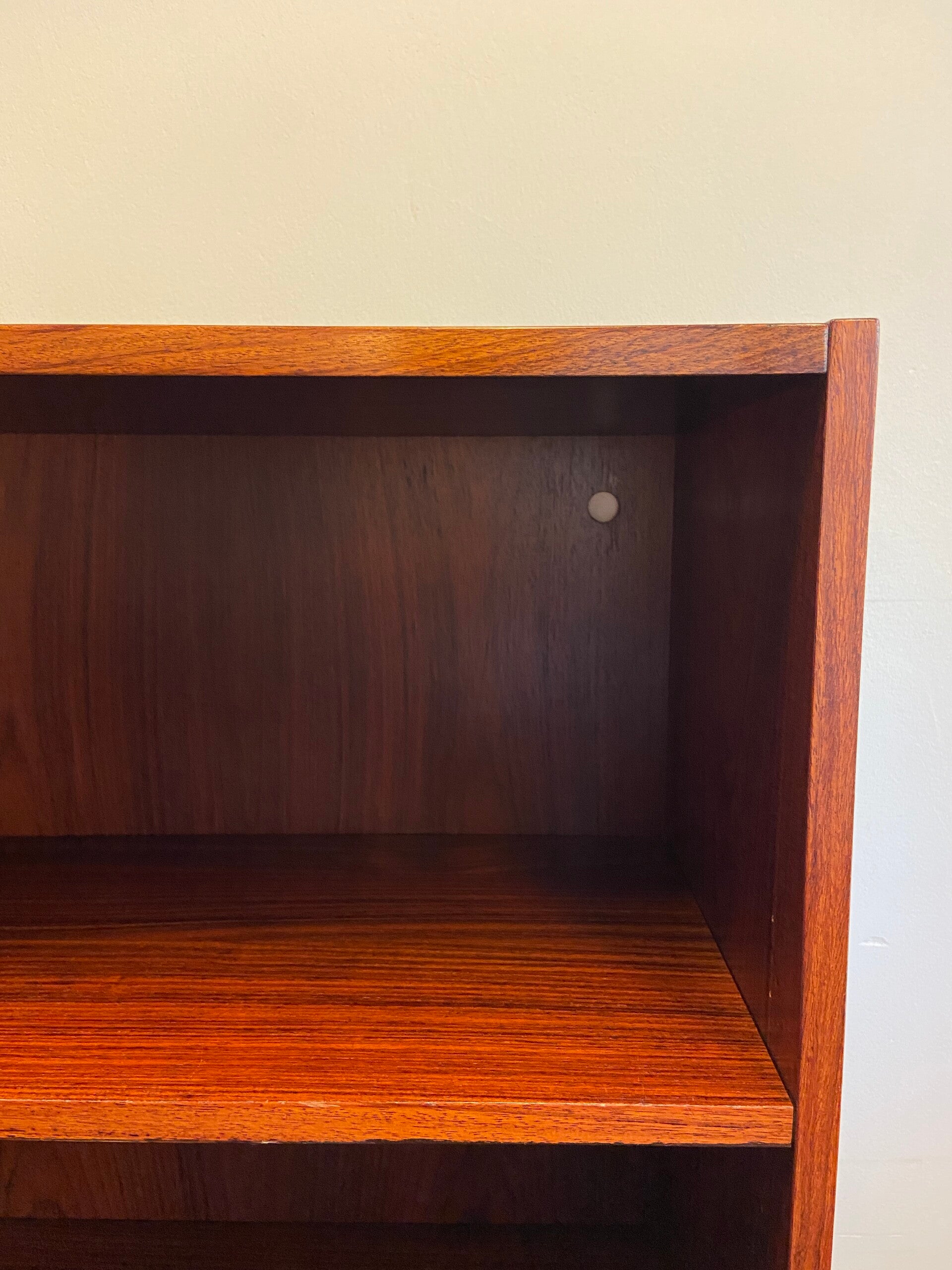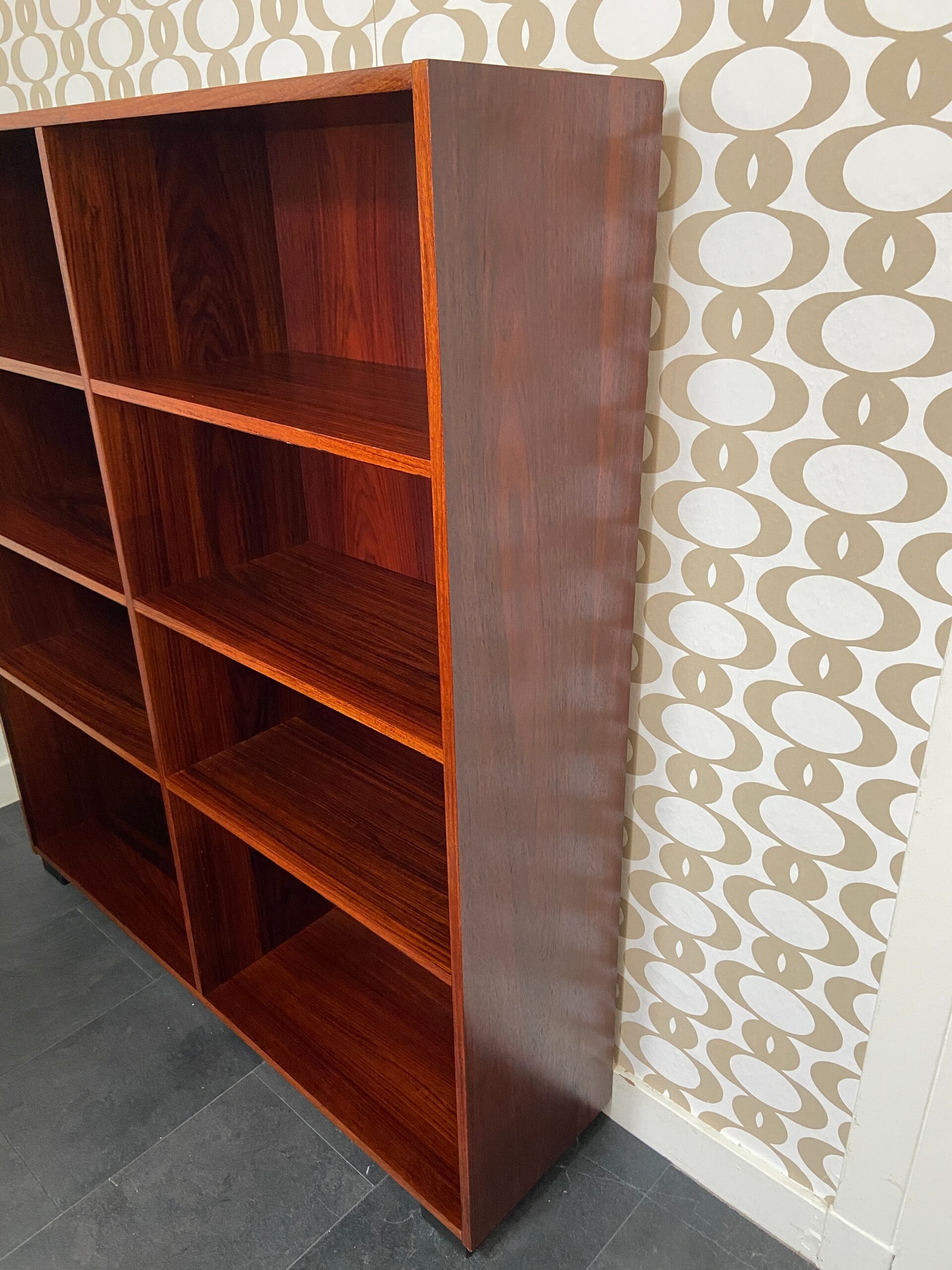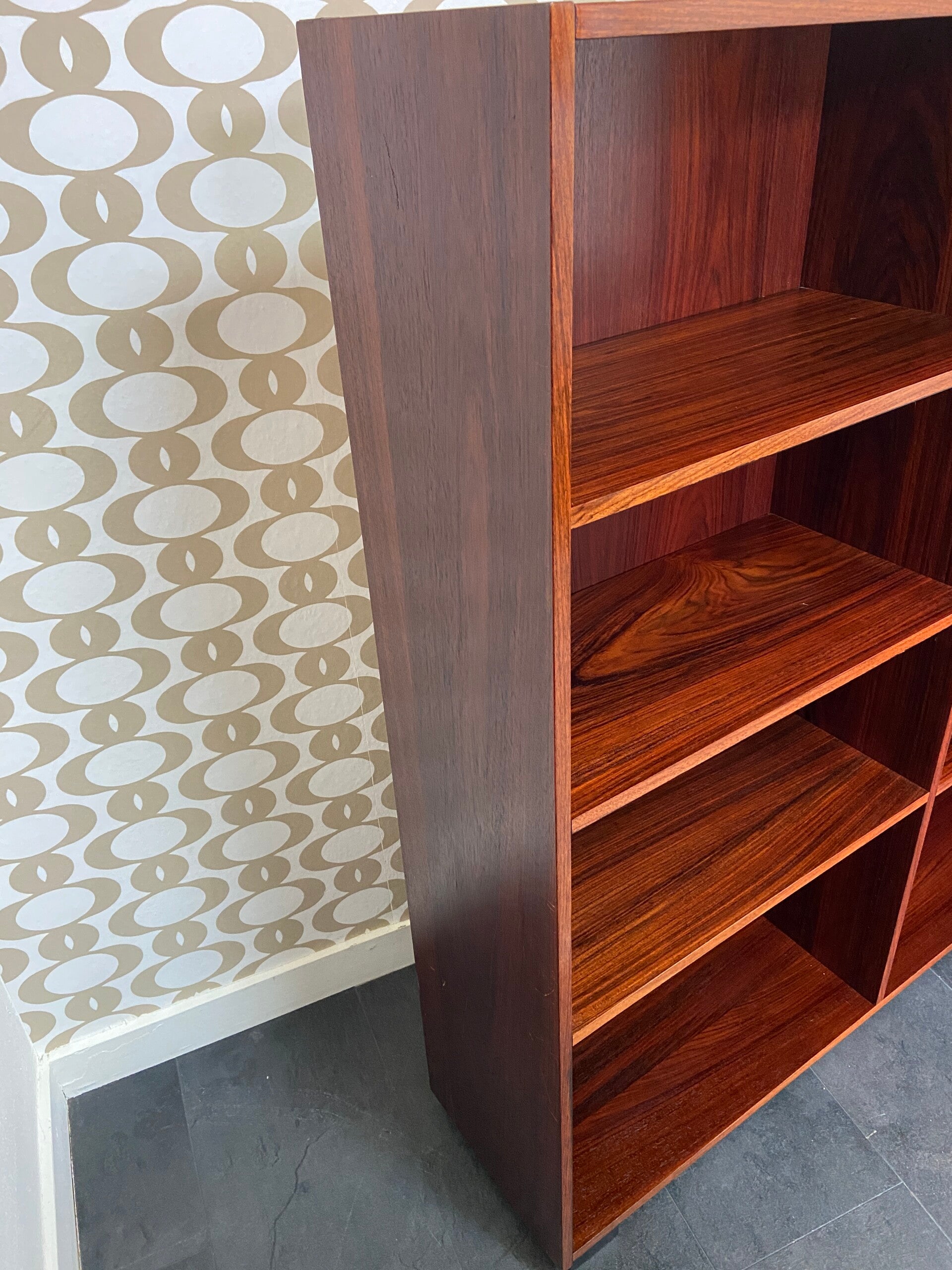 Prachtige boekenkast van palissanderhout. Het donkere hout geeft sfeer en gezelligheid in huis en combineert goed met natuurlijke tinten maar ook met meer sprekende kleuren als bijvoorbeeld mosterdgeel. De planken zijn in hoogte verstelbaar. De kast staat op blokpoten die zorgen voor extra stabiliteit. De conditie is goed met wat kleine gebruikssporen; zie de foto's die een goed beeld geven.
