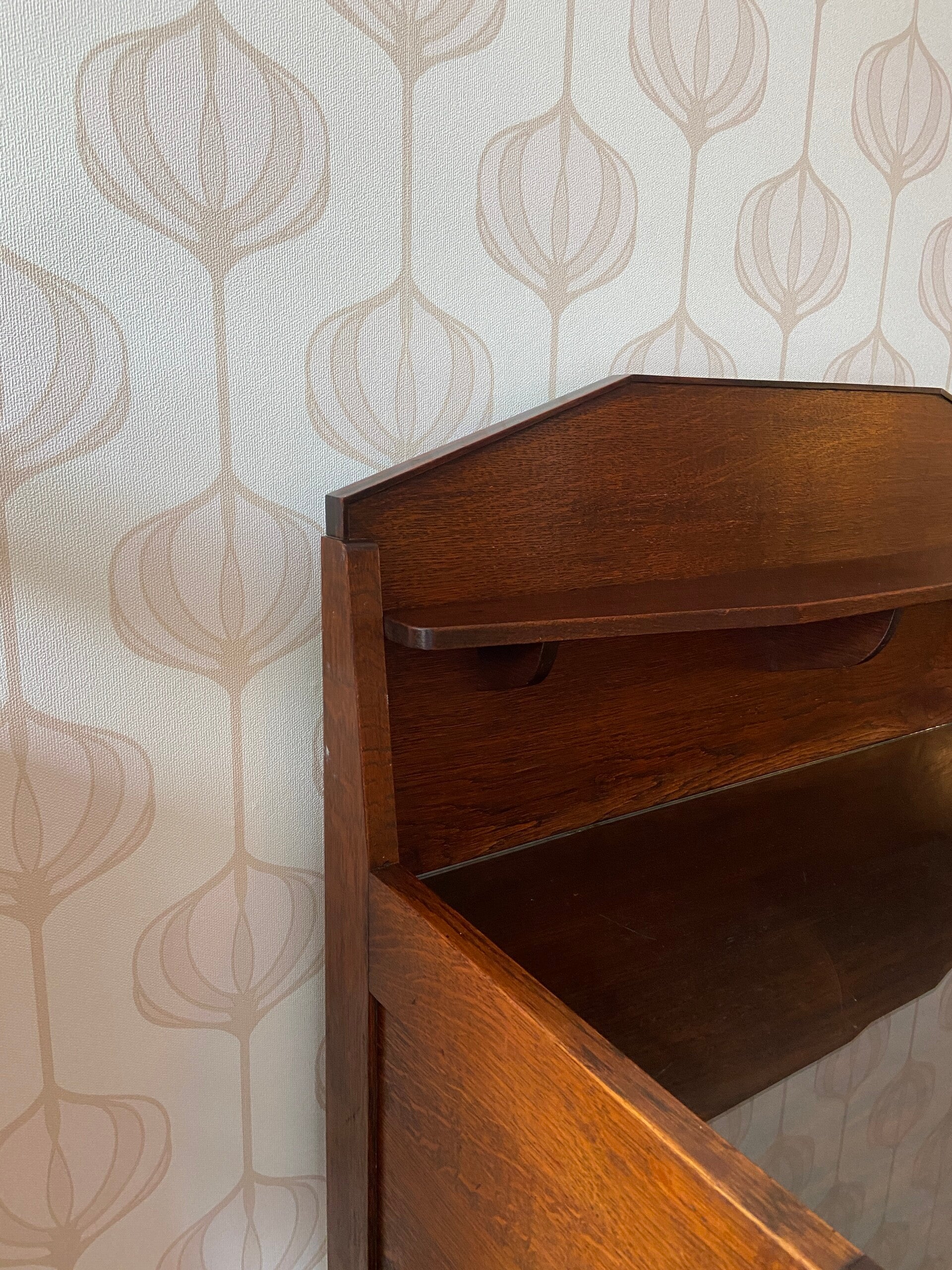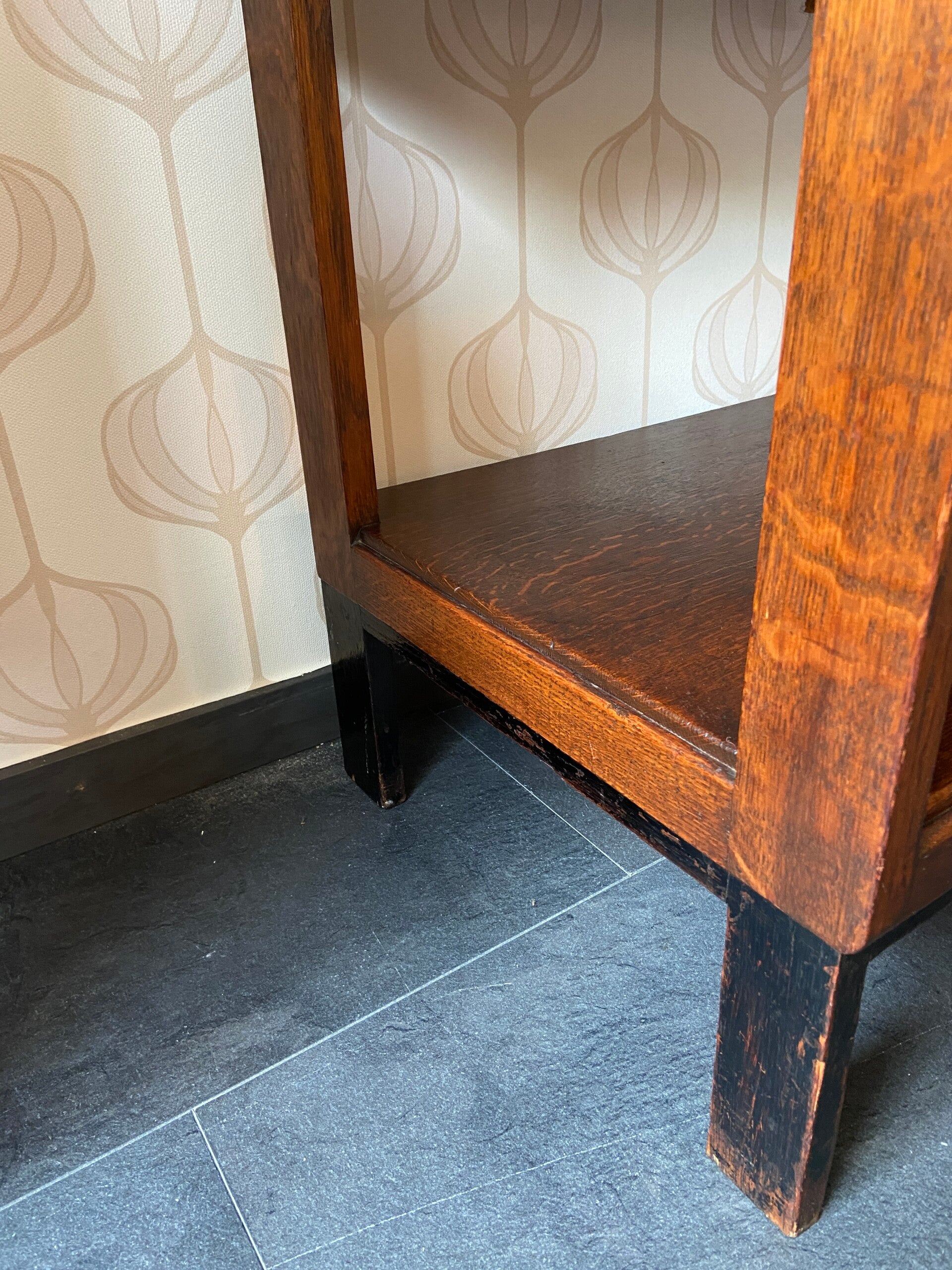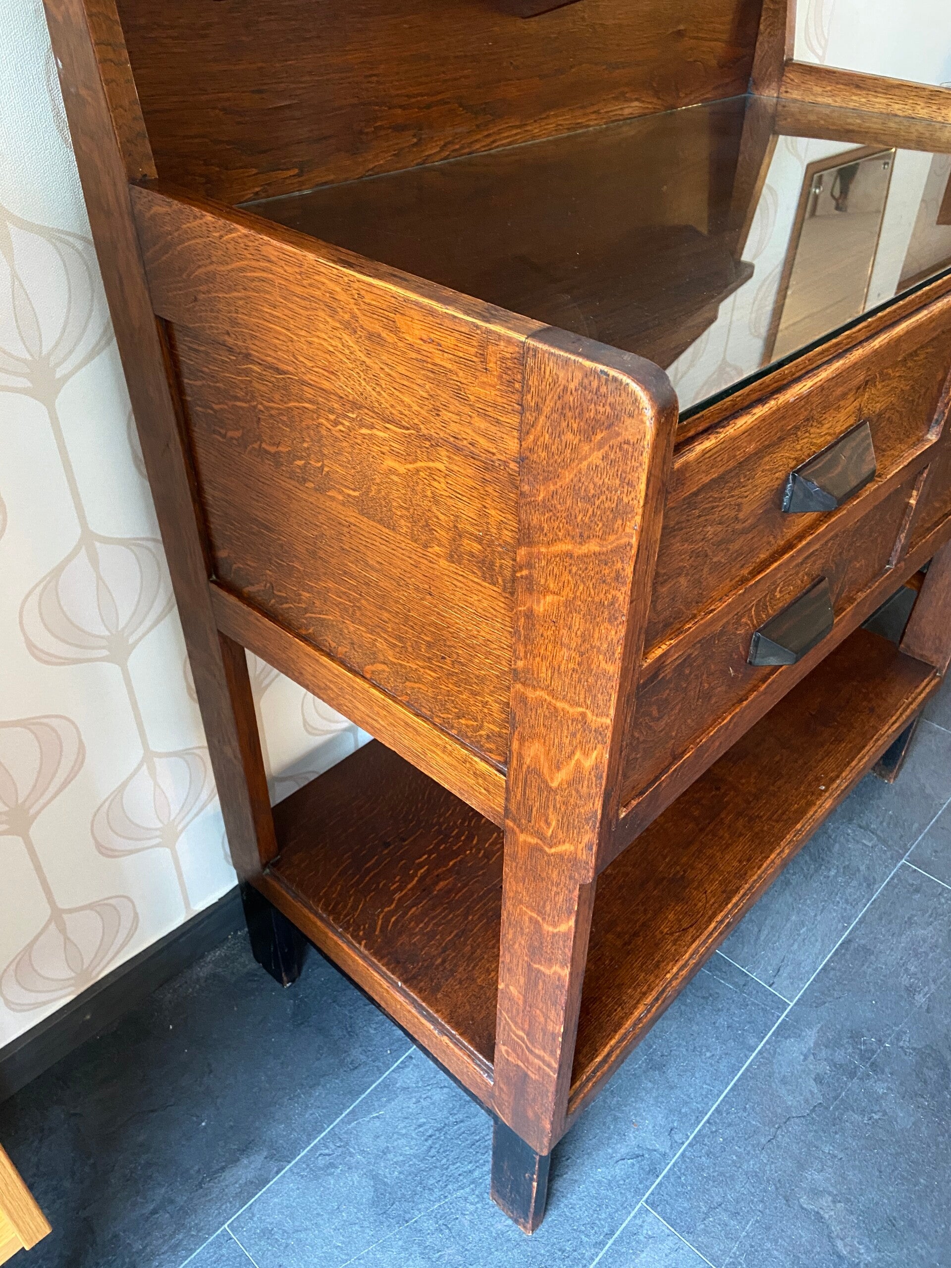 Bijzondere Art Deco buffetkast met 4 laden. Het meubel is uitgevoerd in donker hout en heeft mooie stijldetails.Het meubel verkeert in mooie staat met gebruikssporen passend bij de leeftijd. De laden hebben vlekken/gebruikssporen; dit heb ik voor het oog opgelost door een kastpapier toe te voegen. Een meer permanente oplossing is het schilderen van de binnenkant van de laden.
