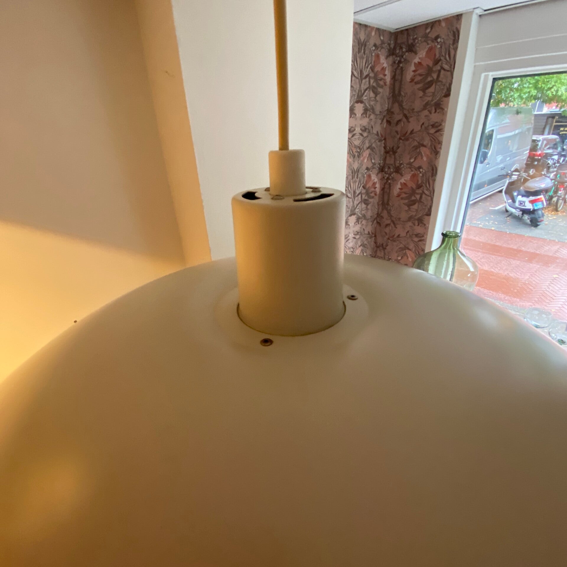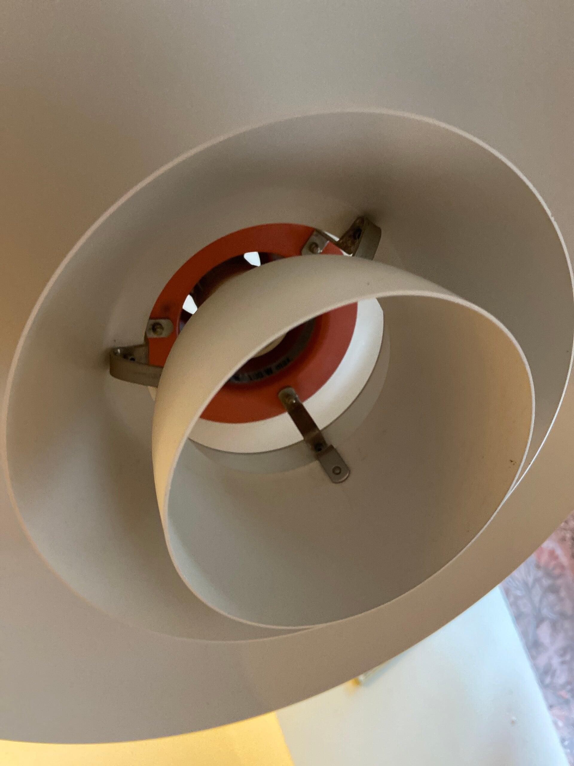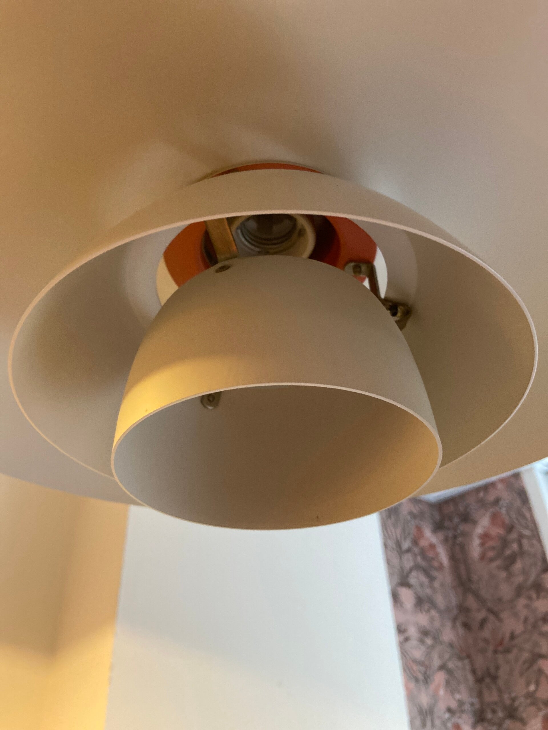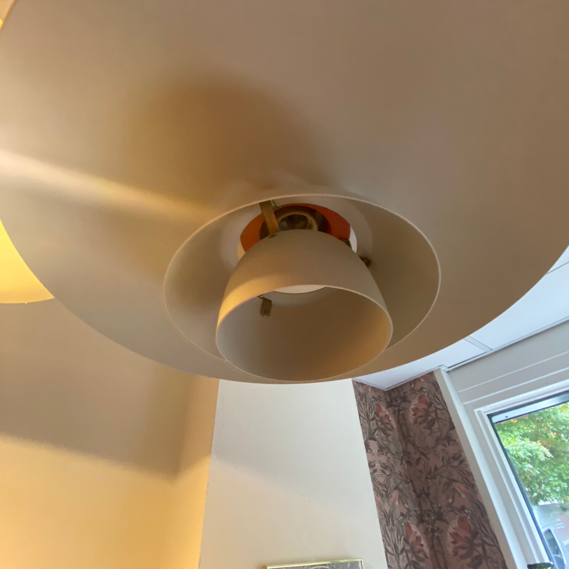 Een designklassieker! Deze PH-4/3 lamp is uitgevoerd in mat wit met oranje accenten. De schalen zorgen voor een subtiele lichtverdeling waardoor je nooit verblind wordt door het licht. Ideaal boven een tafel. De lamp verkeert in mooie staat met wat lichte verkleuring aan het snoer, de plafondkap ontbreekt. Type: 117087 en fitting E27.