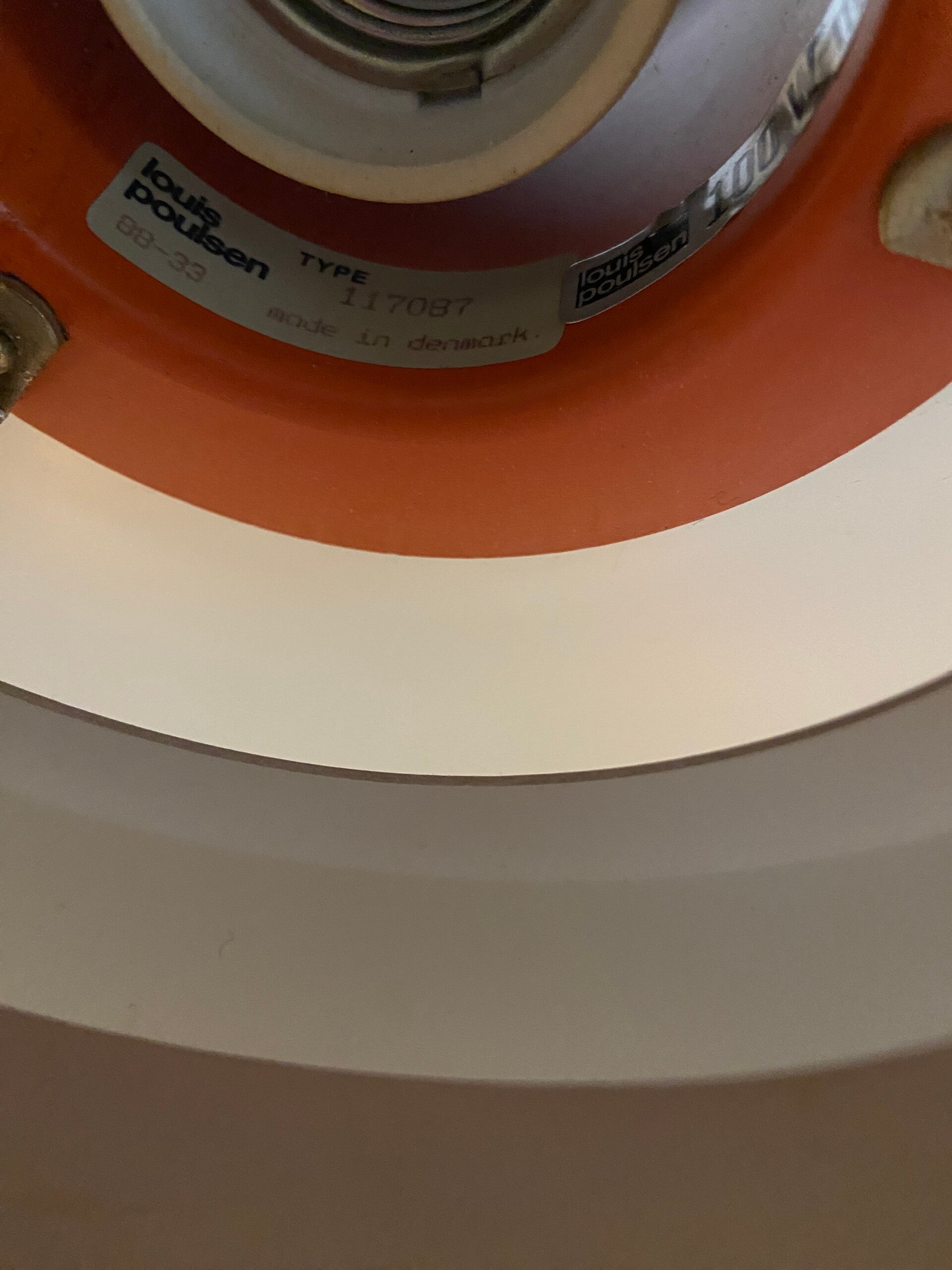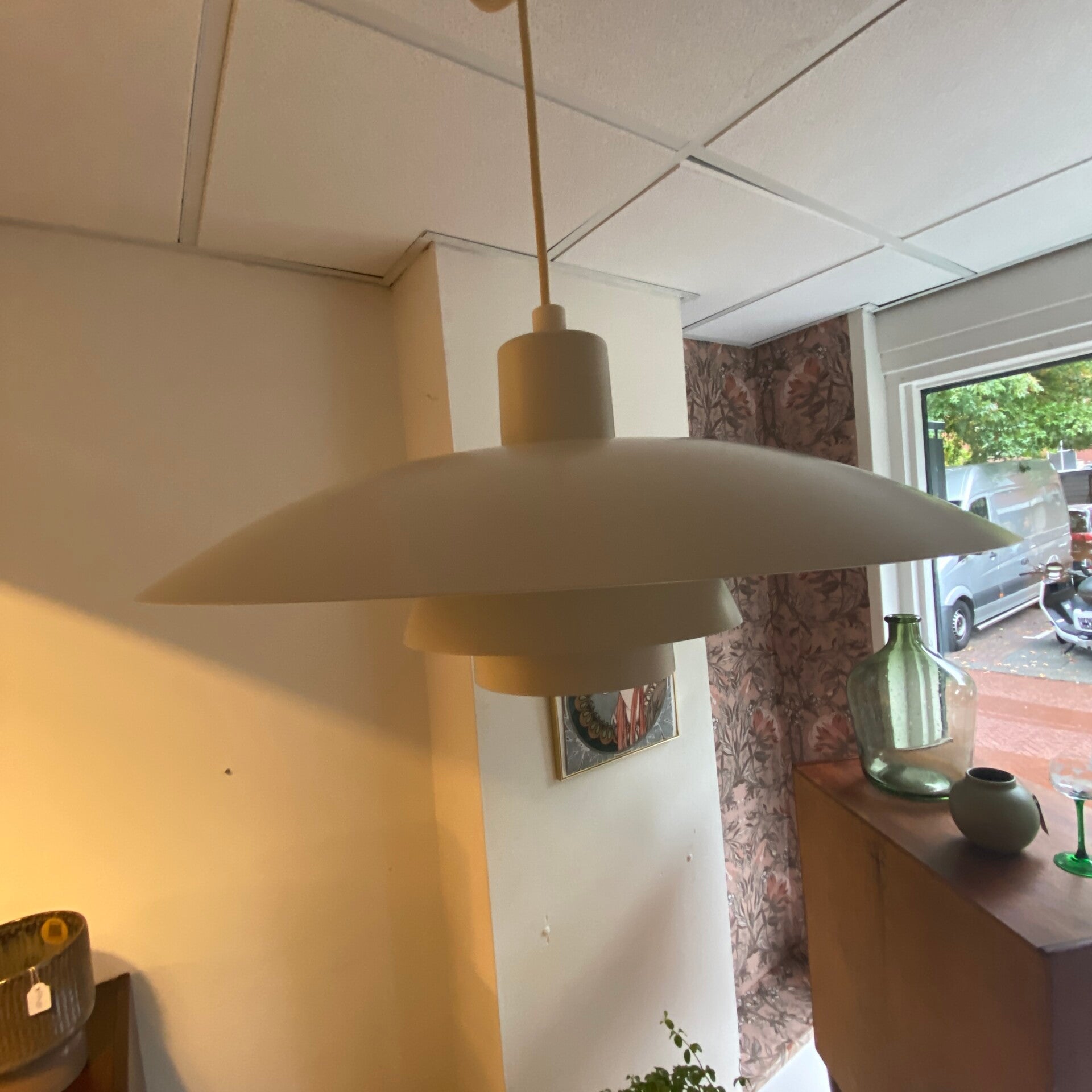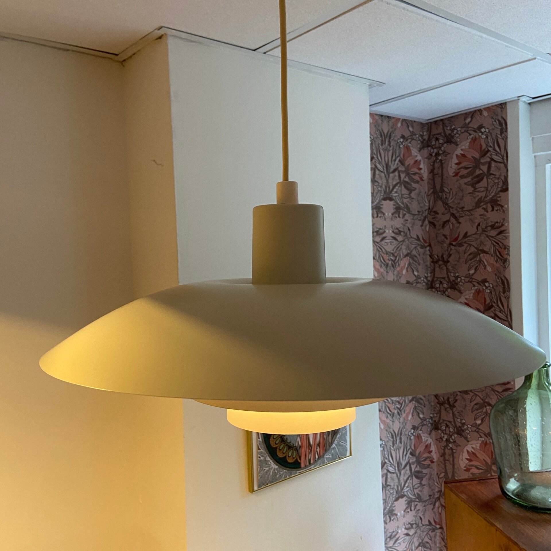 Een designklassieker! Deze PH-4/3 lamp is uitgevoerd in mat wit met oranje accenten. De schalen zorgen voor een subtiele lichtverdeling waardoor je nooit verblind wordt door het licht. Ideaal boven een tafel. De lamp verkeert in mooie staat met wat lichte verkleuring aan het snoer, de plafondkap ontbreekt. Type: 117087 en fitting E27.