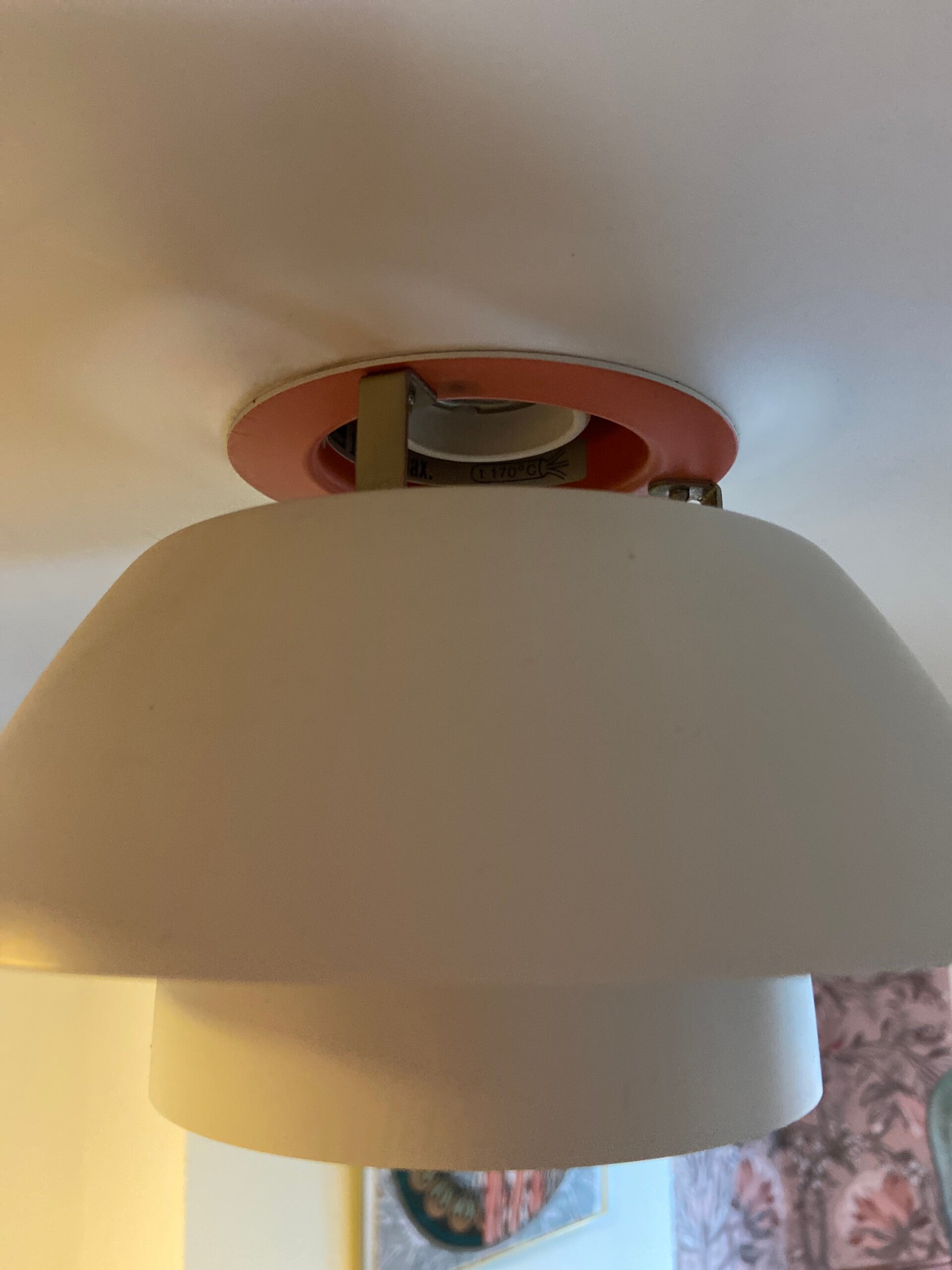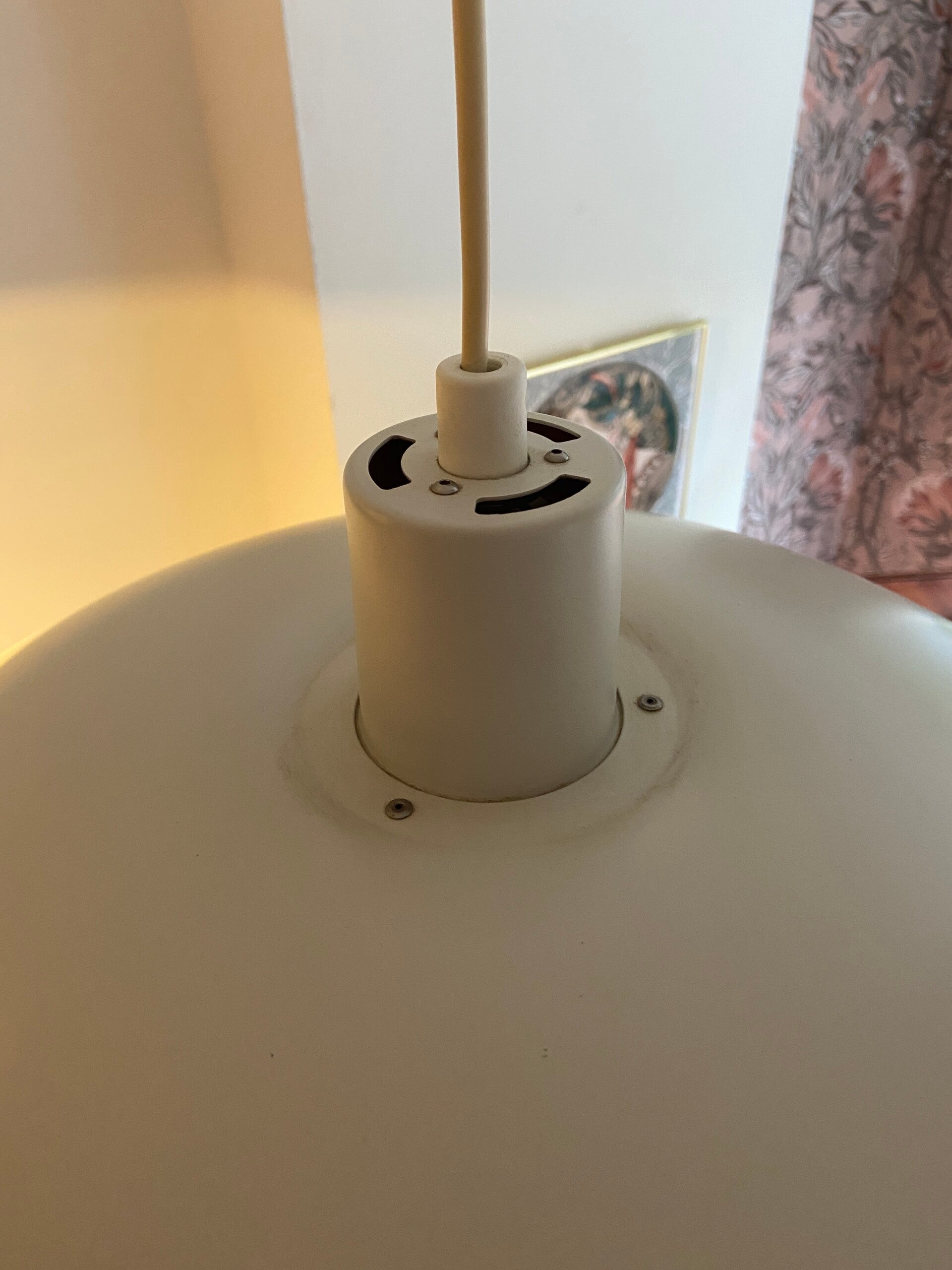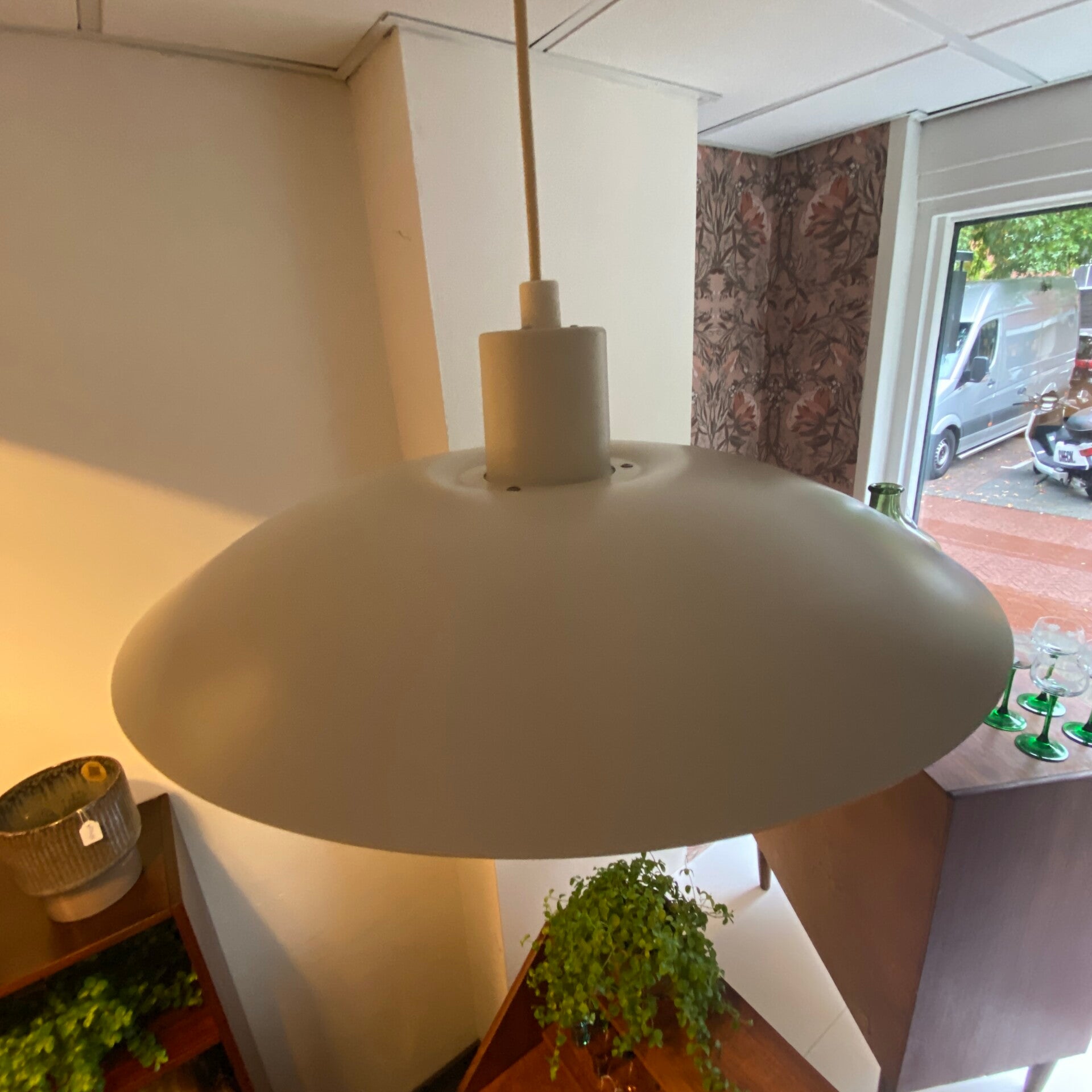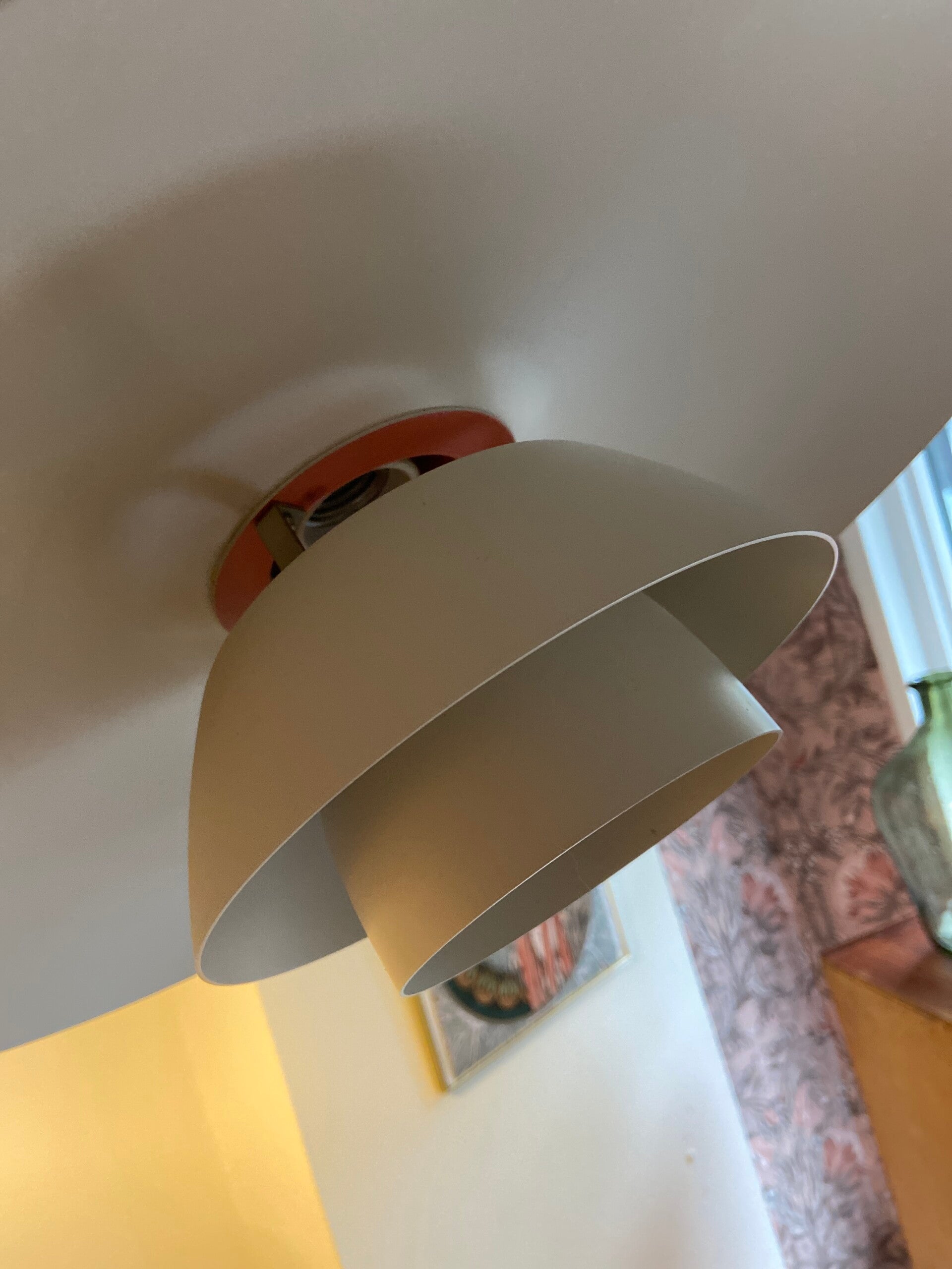 Een designklassieker! Deze PH-4/3 lamp is uitgevoerd in mat wit met oranje accenten. De schalen zorgen voor een subtiele lichtverdeling waardoor je nooit verblind wordt door het licht. Ideaal boven een tafel. De lamp verkeert in mooie staat met wat lichte verkleuring aan het snoer, de plafondkap ontbreekt. Type: 117087 en fitting E27.