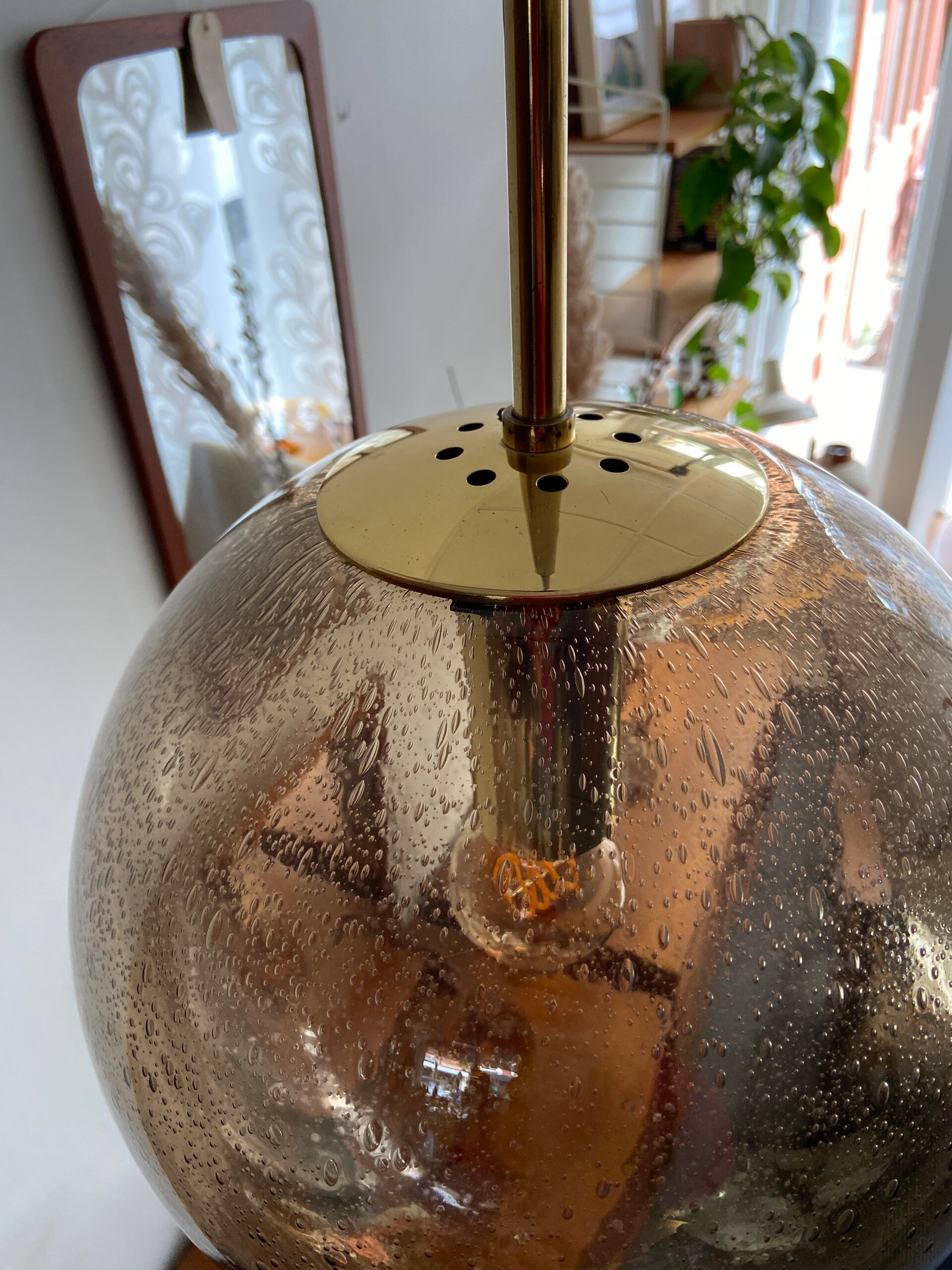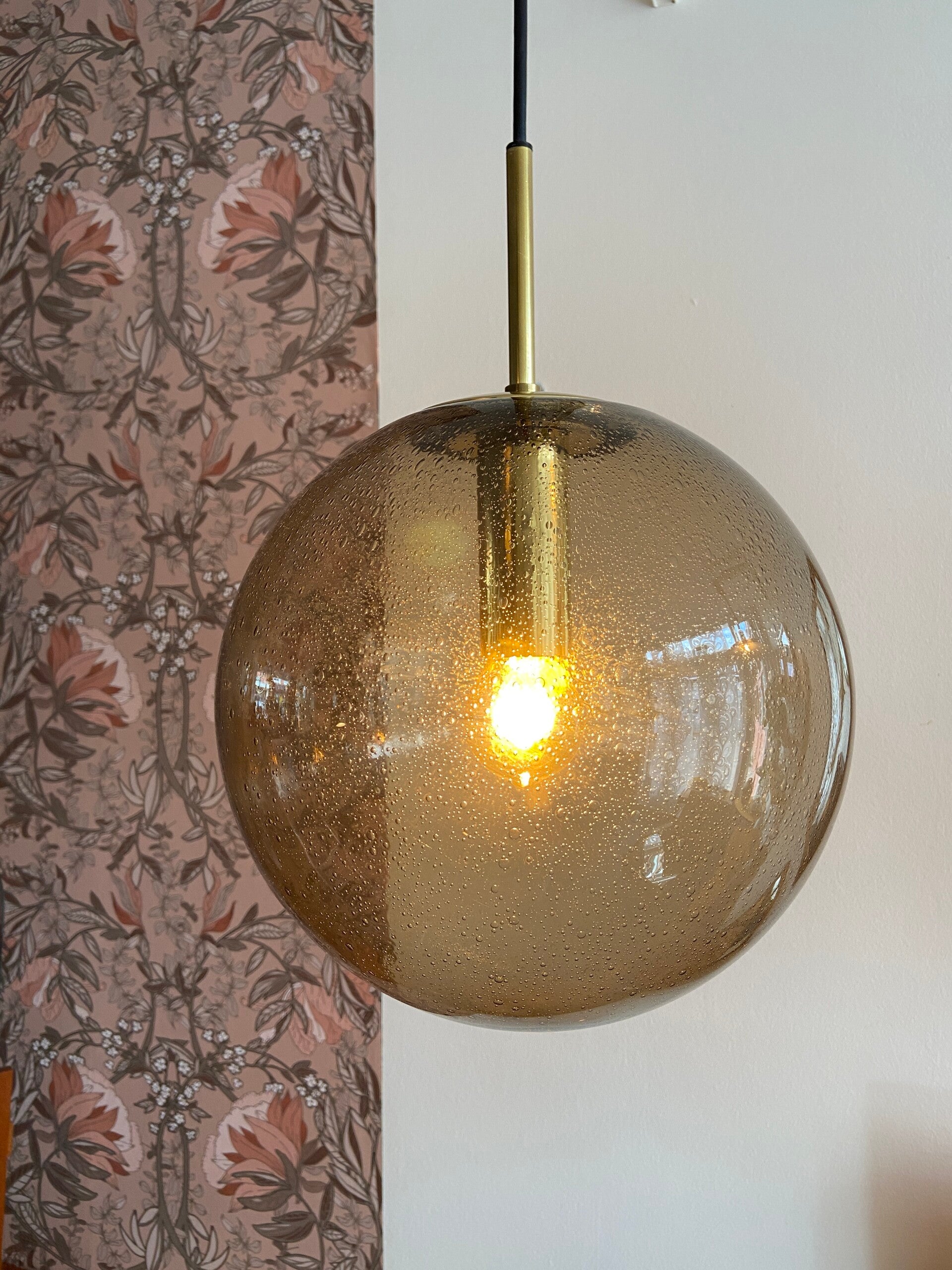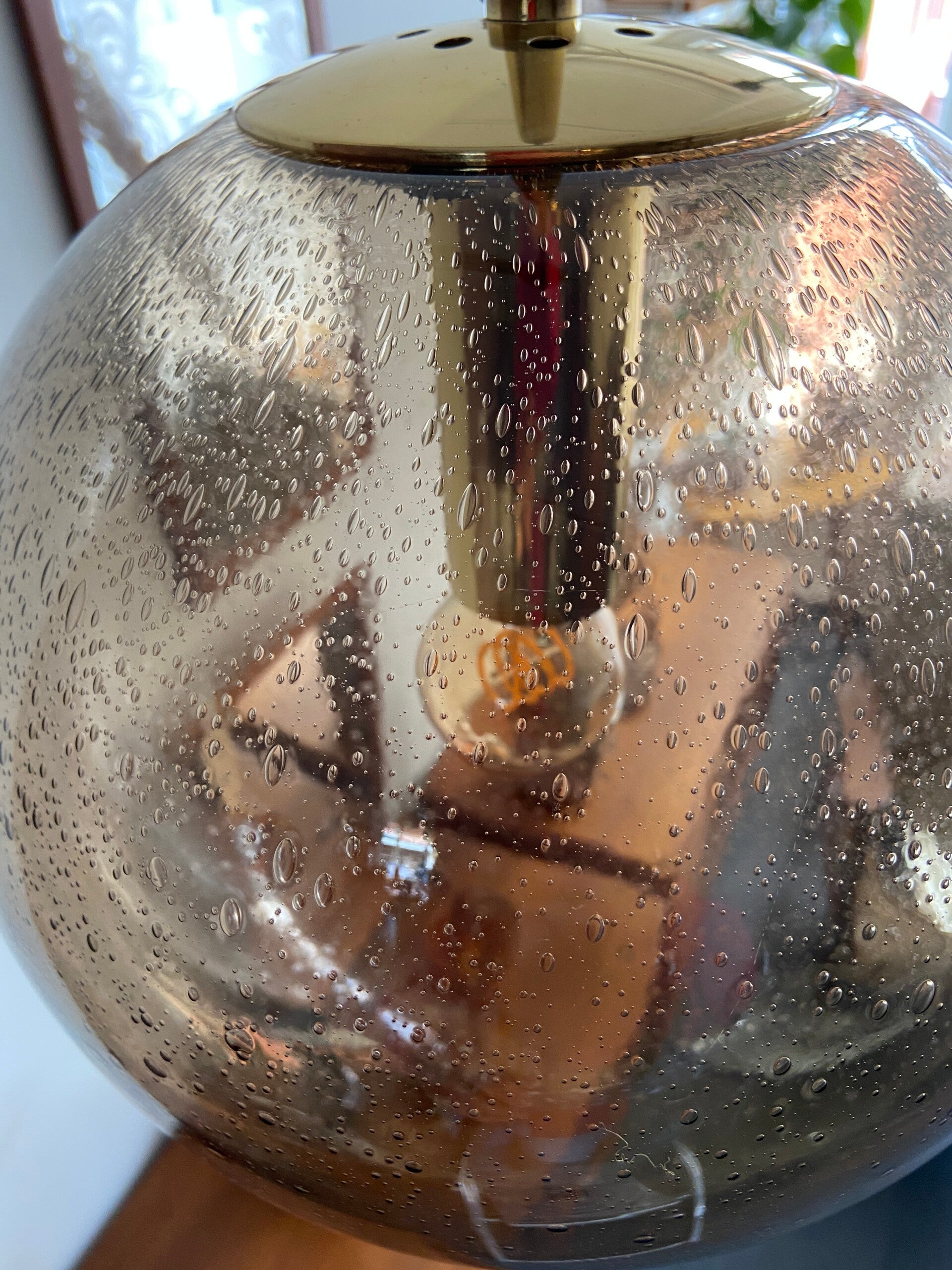 Zeer mooie vintage bollamp van Glashütte Limburg met messing details. De bol is gemaakt van rookglas waarin luchtbelletjes zichtbaar zijn. De lamp verkeert in mooie staat. Aan de binnenkant (rand) van de bol zijn wat chipjes aanwezig; deze zie je niet als het armatuur erop geplaatst is. Zie de close-up foto's. De plafondkap is nieuw. Type: 4108, model P195, merksticker aanwezig.