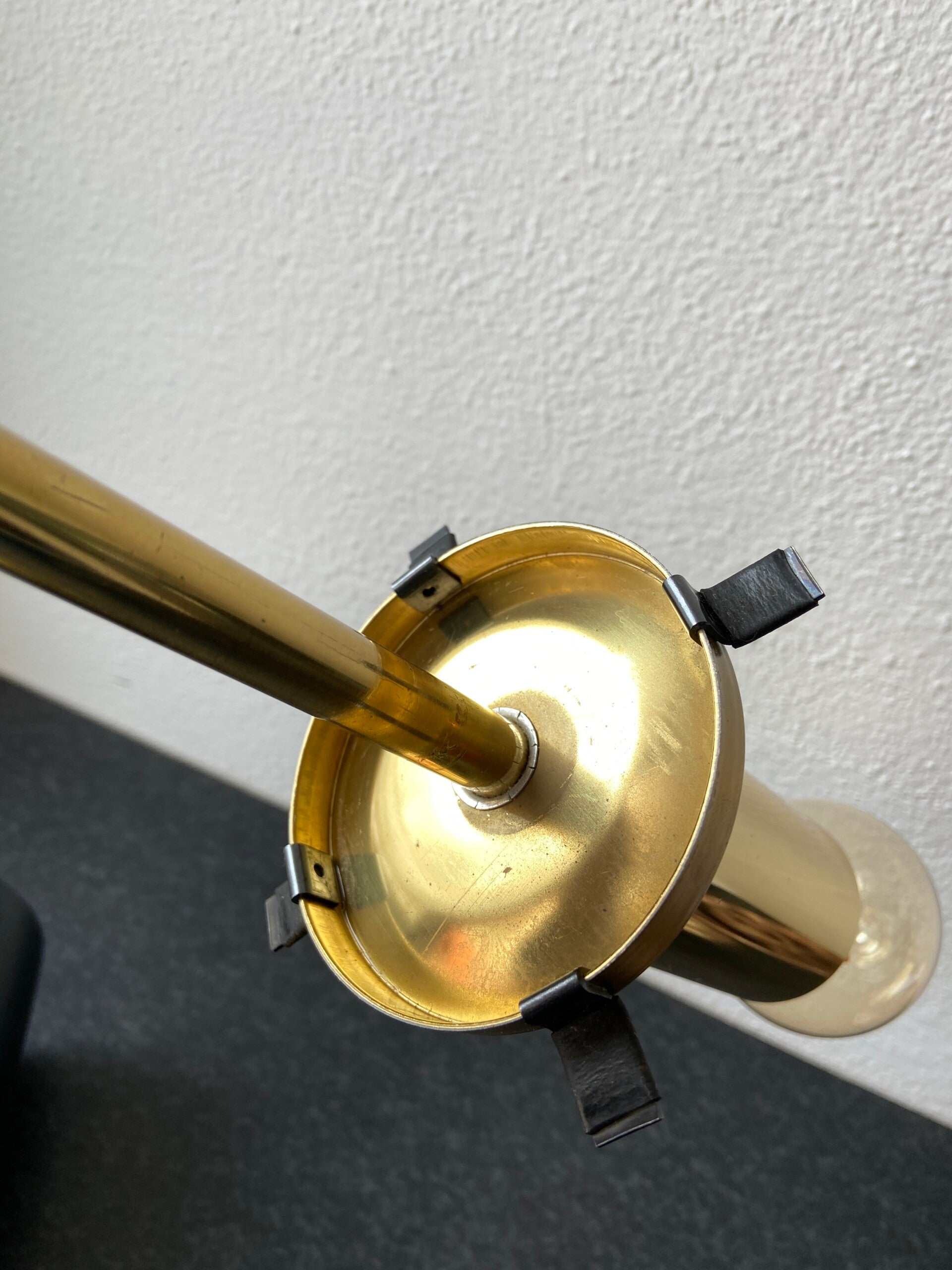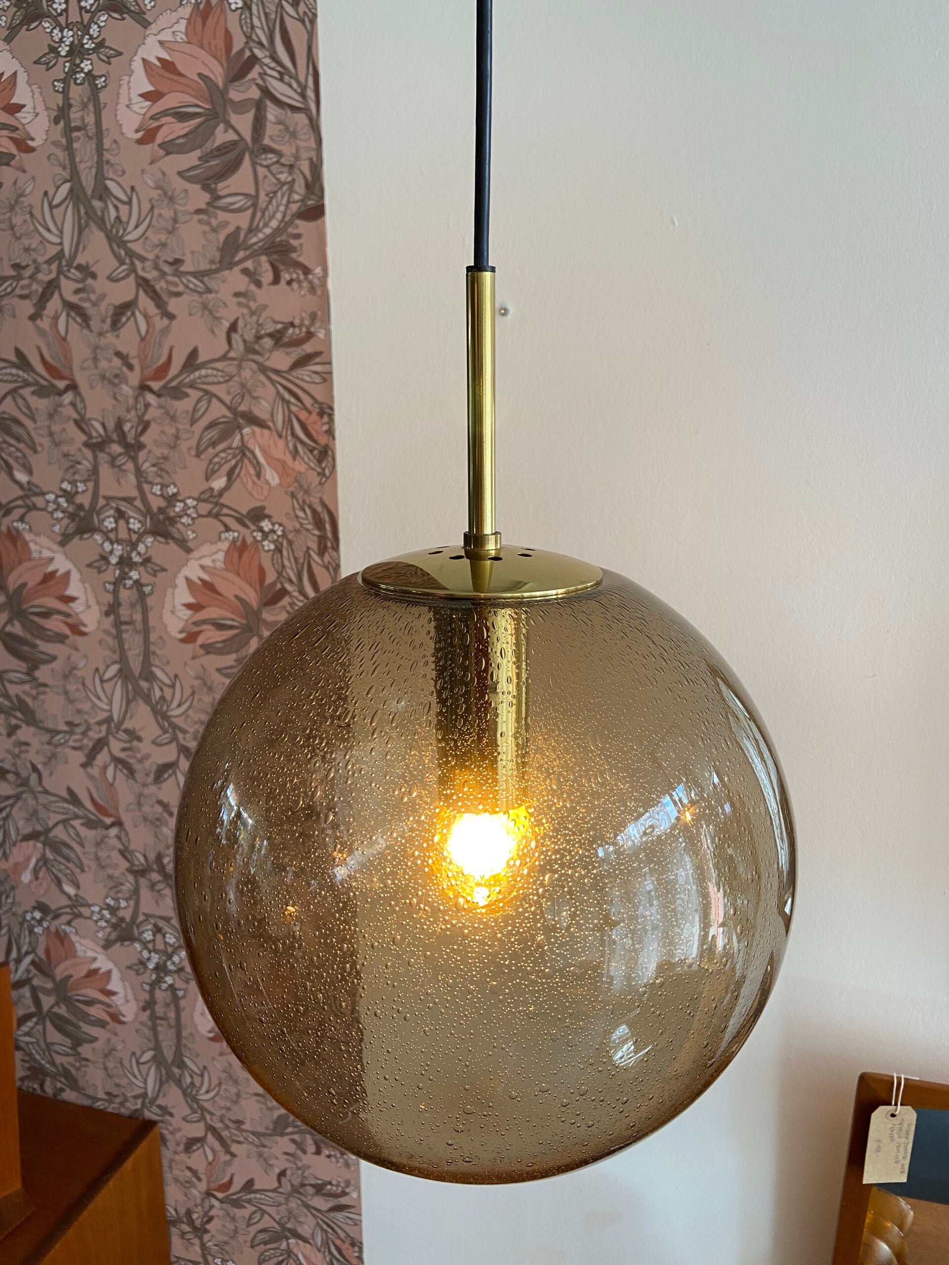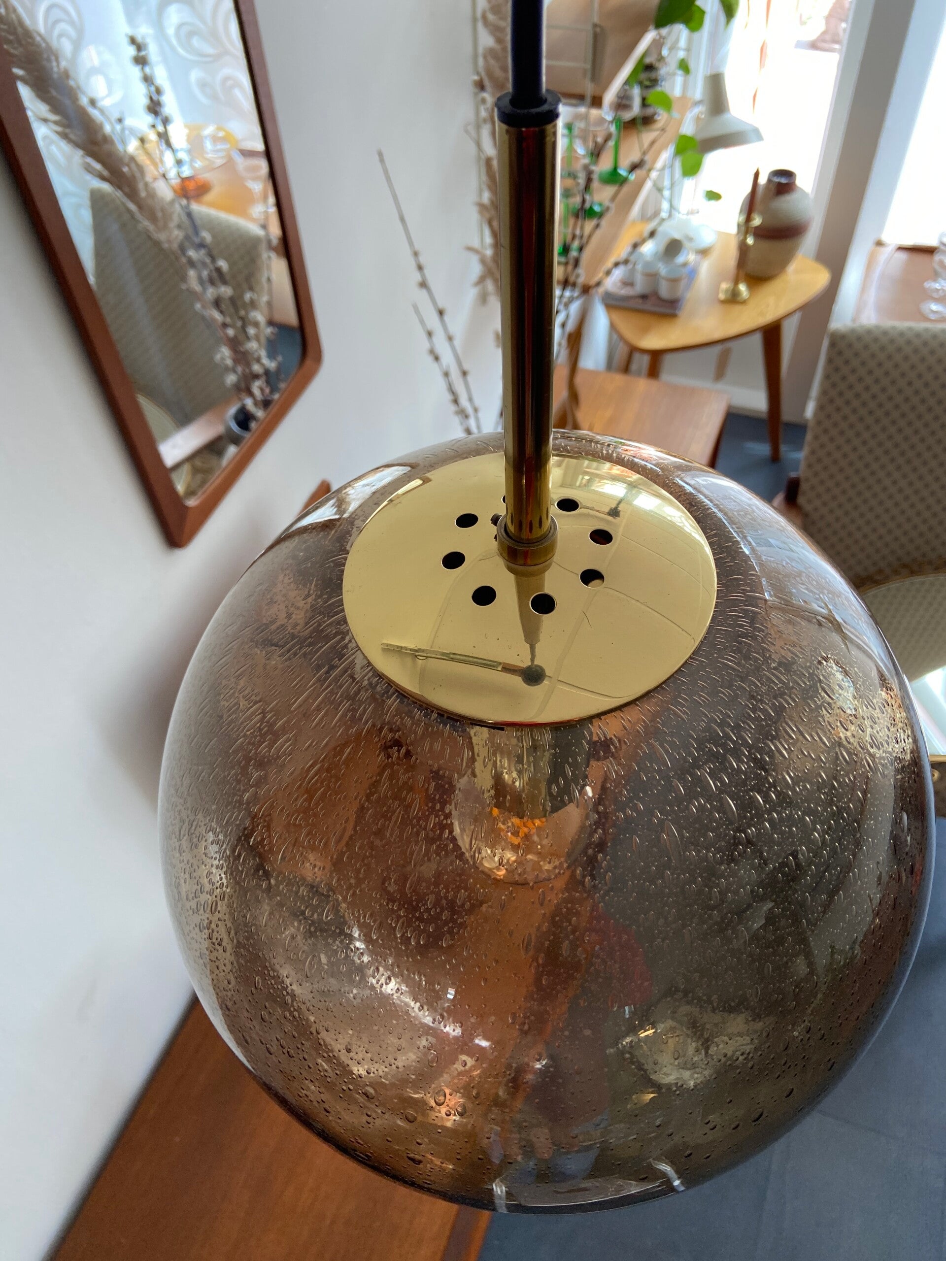 Zeer mooie vintage bollamp van Glashütte Limburg met messing details. De bol is gemaakt van rookglas waarin luchtbelletjes zichtbaar zijn. De lamp verkeert in mooie staat. Aan de binnenkant (rand) van de bol zijn wat chipjes aanwezig; deze zie je niet als het armatuur erop geplaatst is. Zie de close-up foto's. De plafondkap is nieuw. Type: 4108, model P195, merksticker aanwezig.