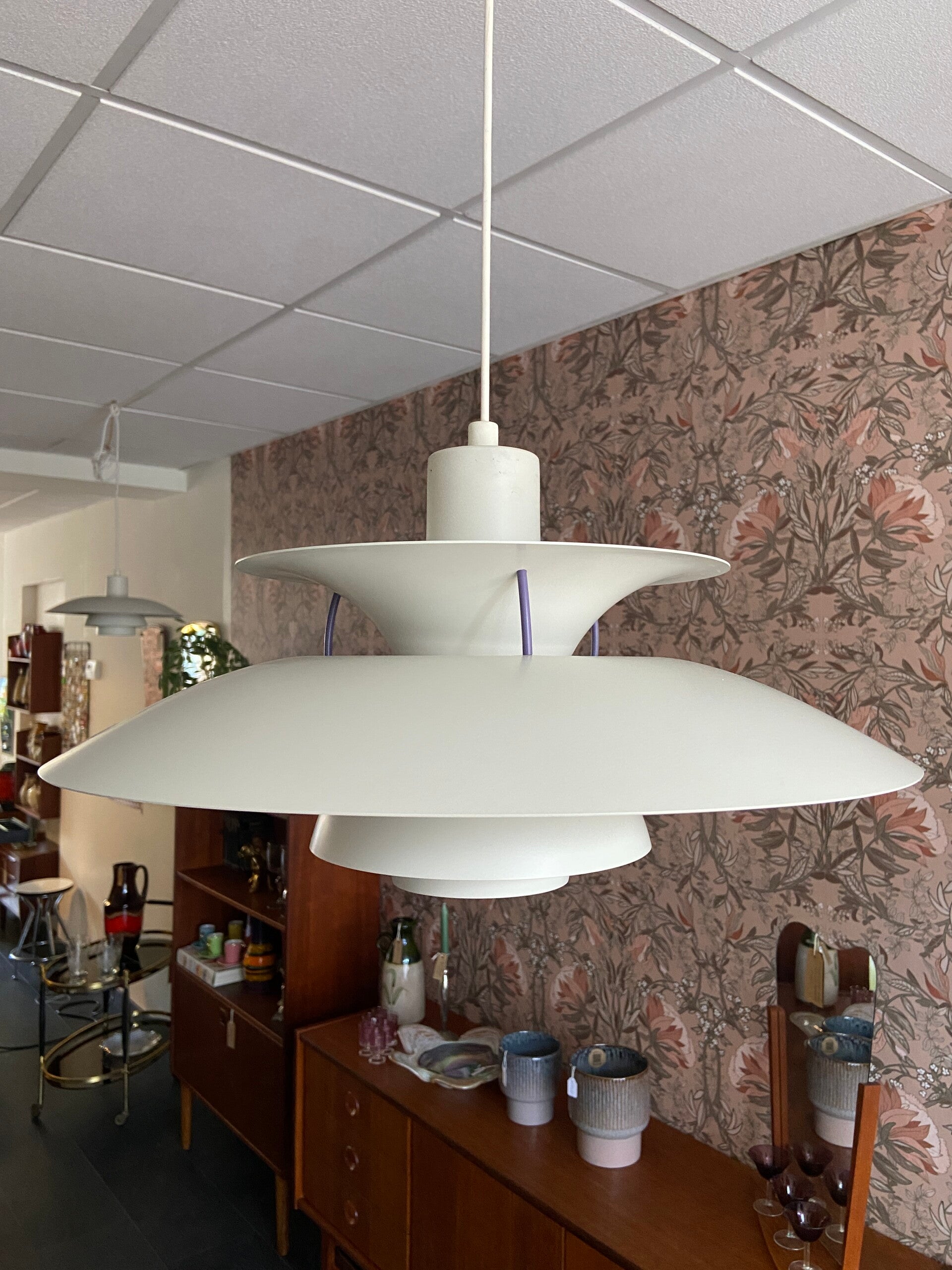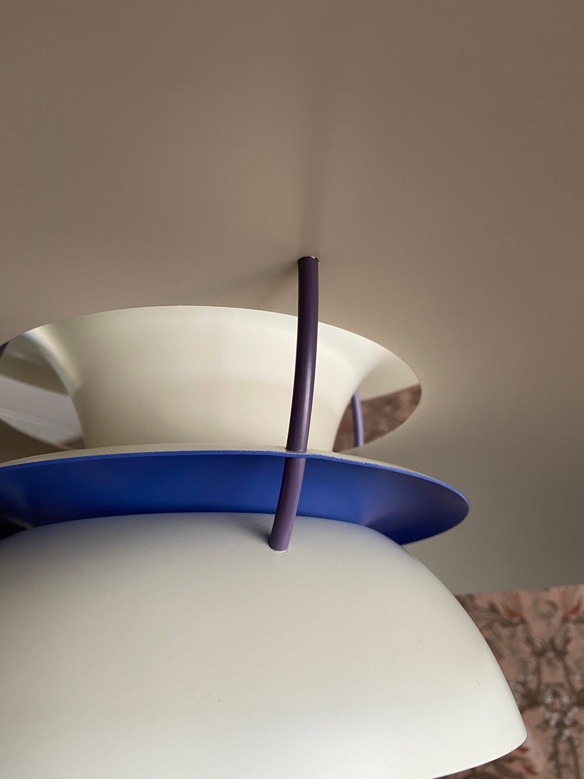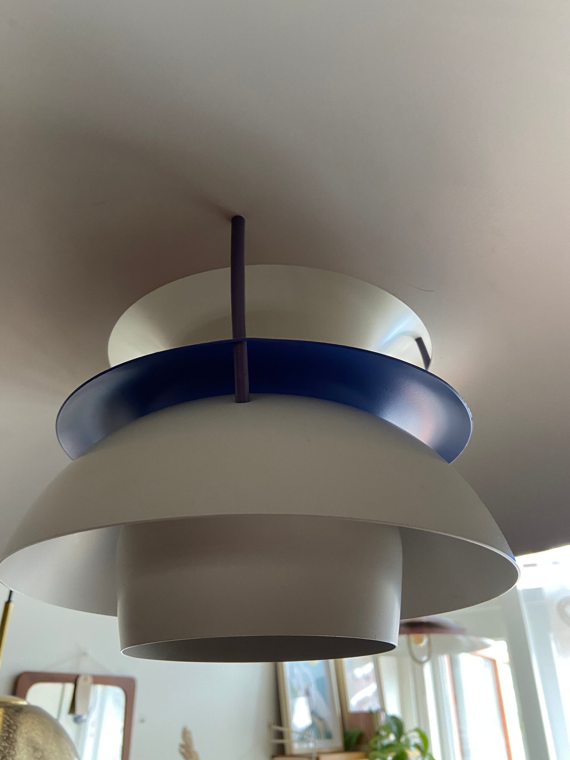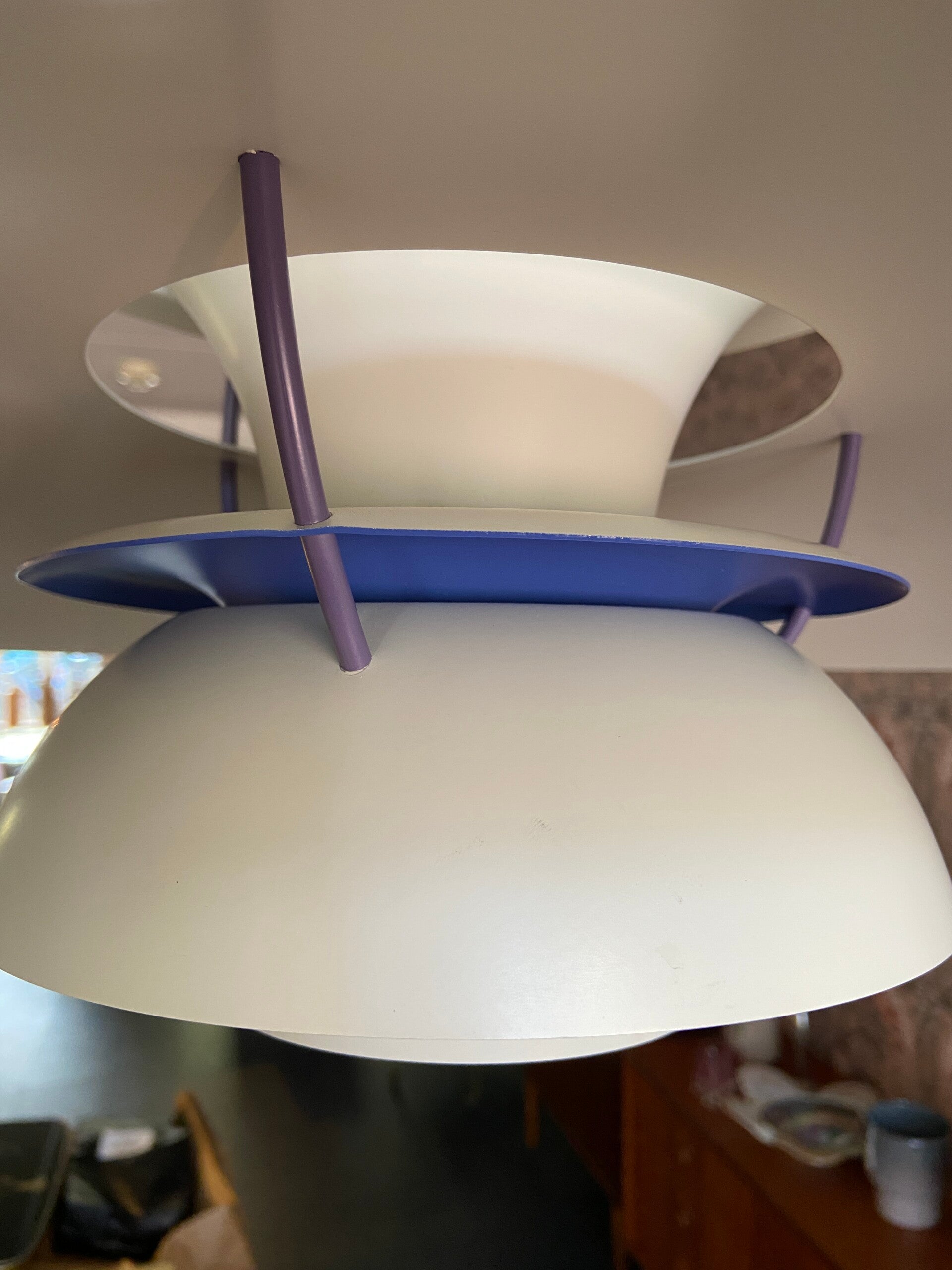 De klassieker onder de schalenlampen! De PH-5 lamp van Poul Henningsen verdeelt het licht subtiel over de schalen waardoor je niet verblind wordt door het licht. De lamp is uitgevoerd in mat wit metaal met paarsblauwe en oranje accenten. De lamp verkeert in zeer mooie staat met wat minimale gebruikssporen op de lak. Zie de foto's die onderdeel zijn van de beschrijving. De plafondkap ontbreekt.