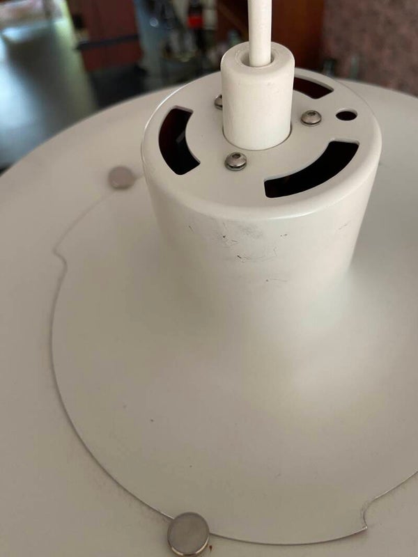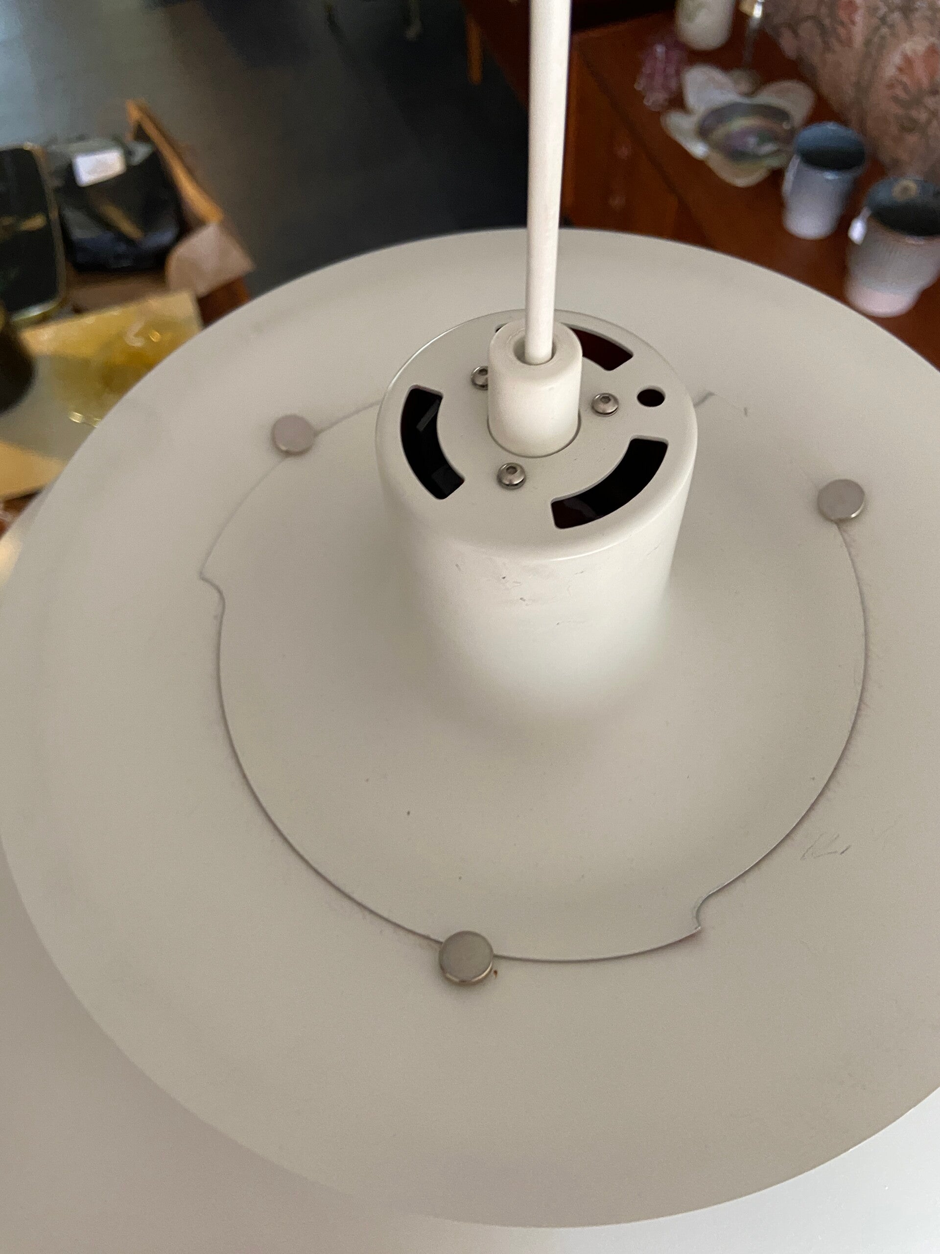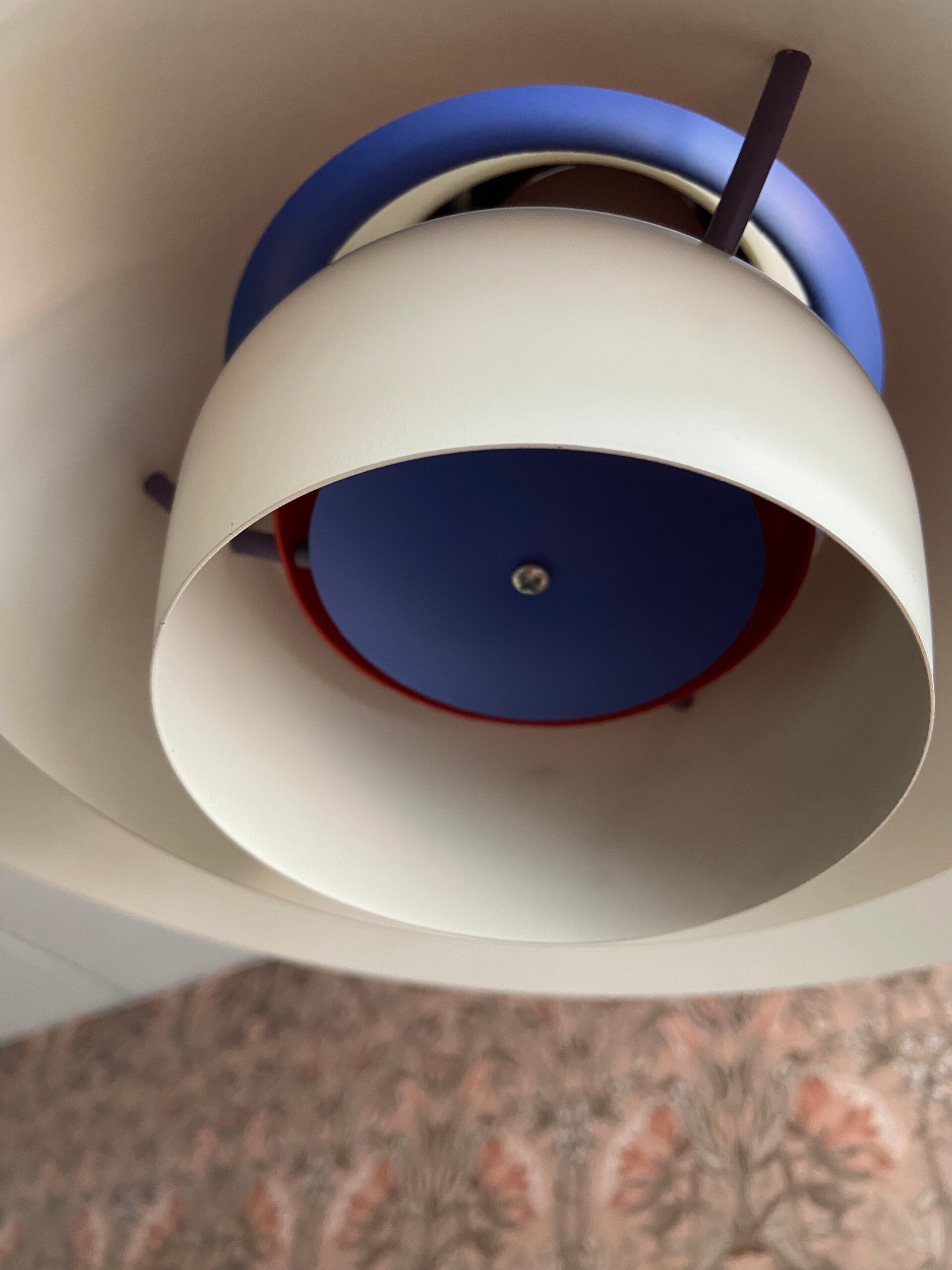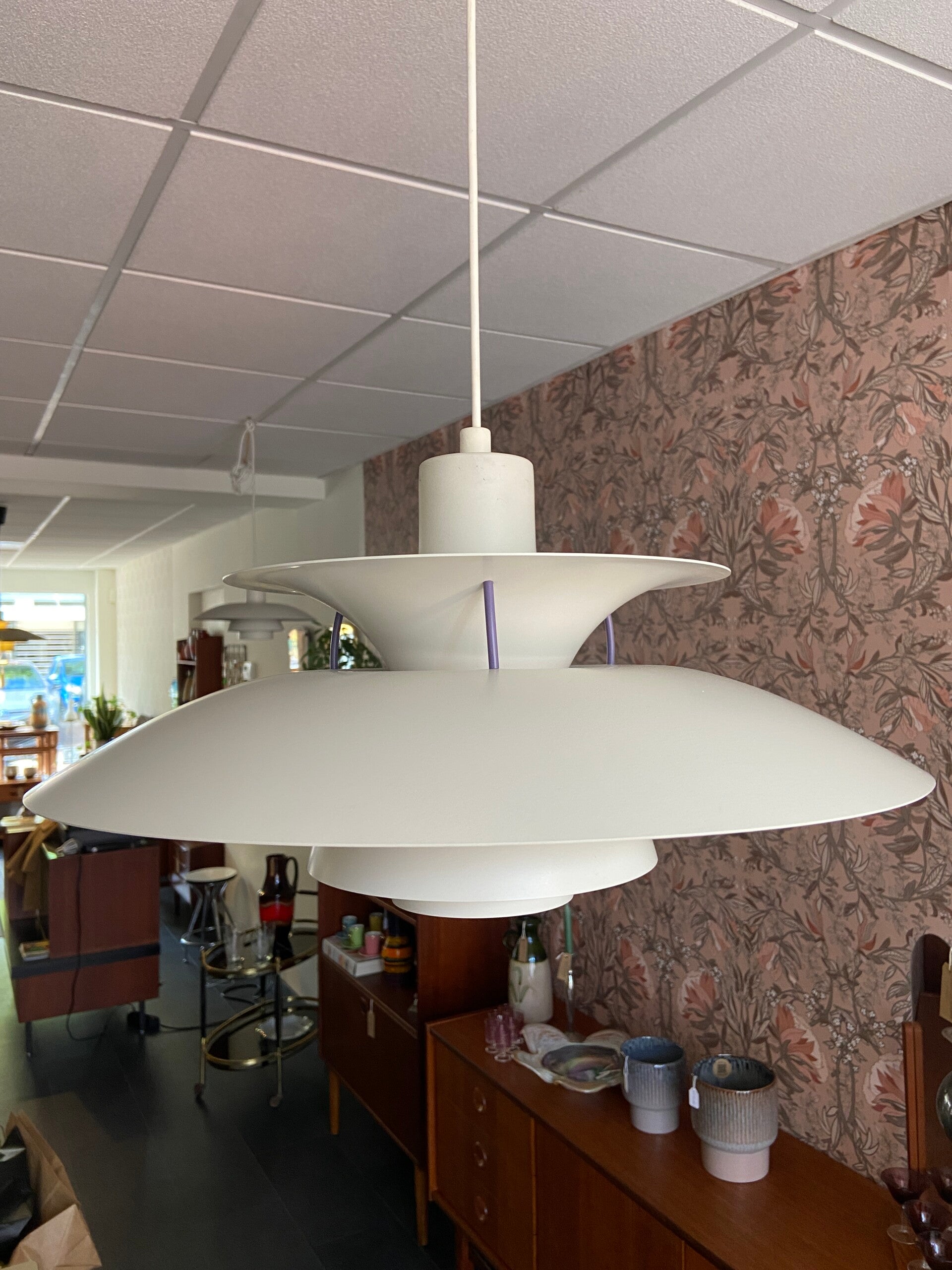 De klassieker onder de schalenlampen! De PH-5 lamp van Poul Henningsen verdeelt het licht subtiel over de schalen waardoor je niet verblind wordt door het licht. De lamp is uitgevoerd in mat wit metaal met paarsblauwe en oranje accenten. De lamp verkeert in zeer mooie staat met wat minimale gebruikssporen op de lak. Zie de foto's die onderdeel zijn van de beschrijving. De plafondkap ontbreekt.