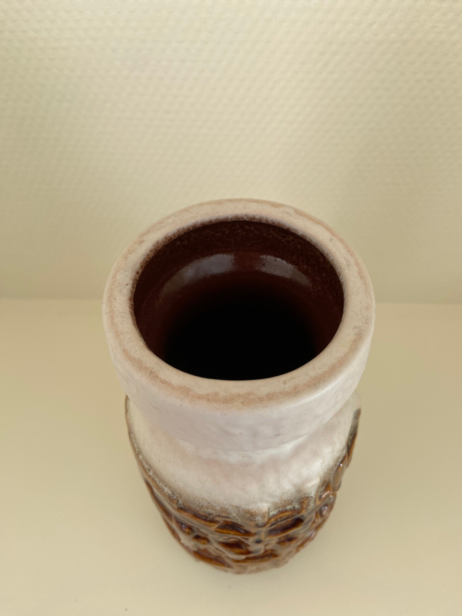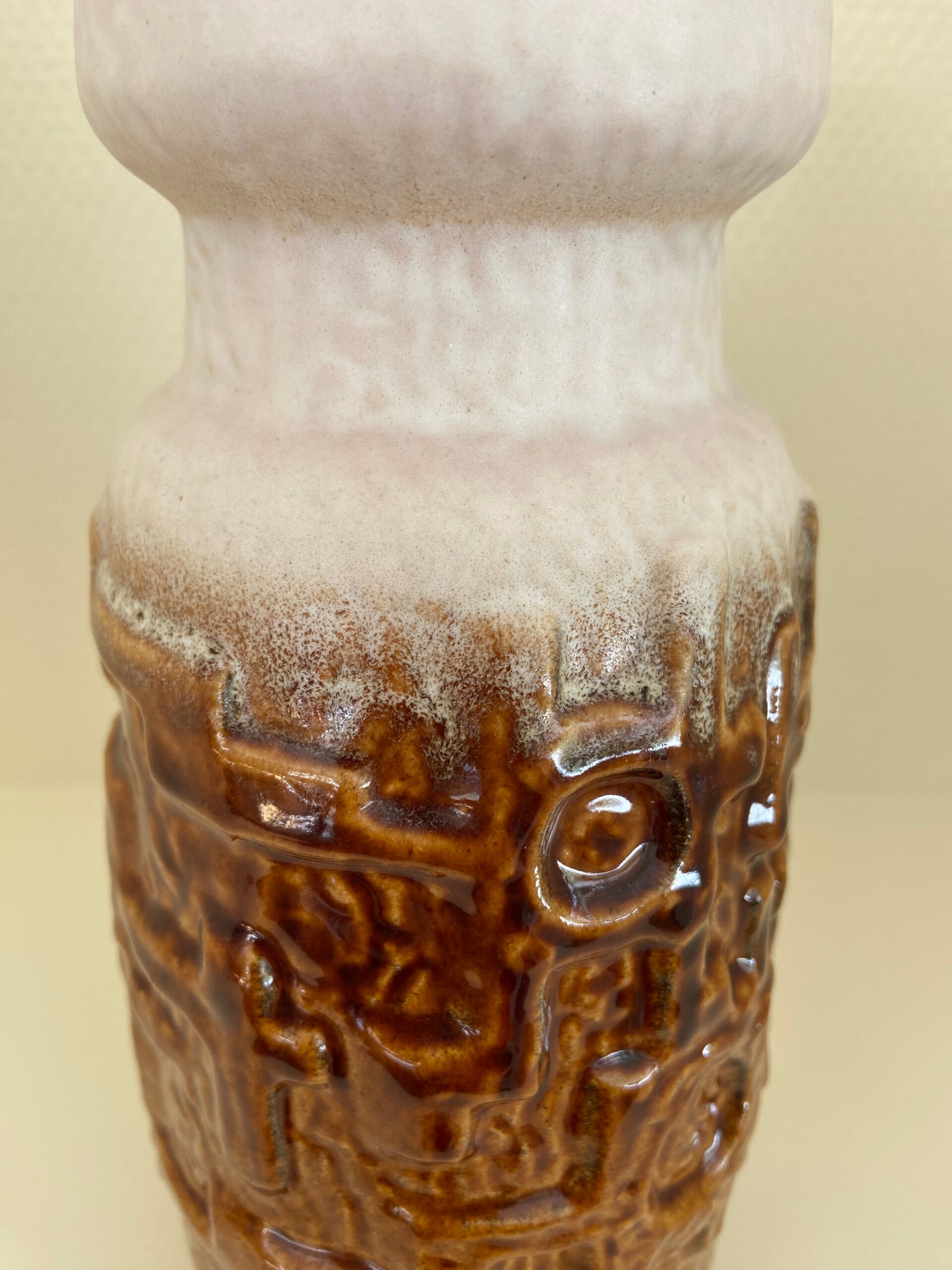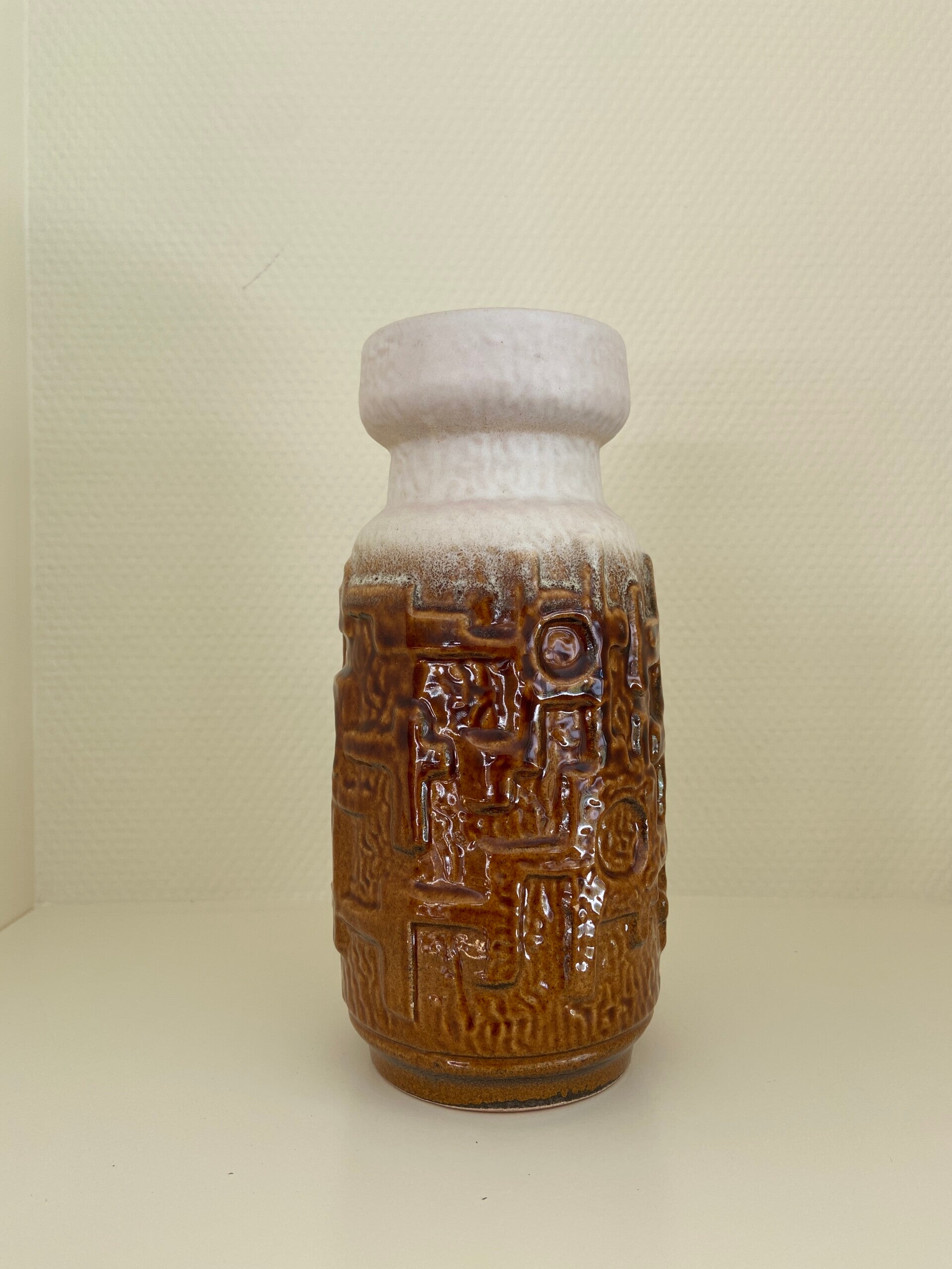 Brutalistische West Germany vaas van aardewerk in caramel en roomwit. De vaas verkeert in vintage staat met wat gebruikssporen aan het aardewerk. Hierop is de prijs aangepast. Maar Blijft Mooi!