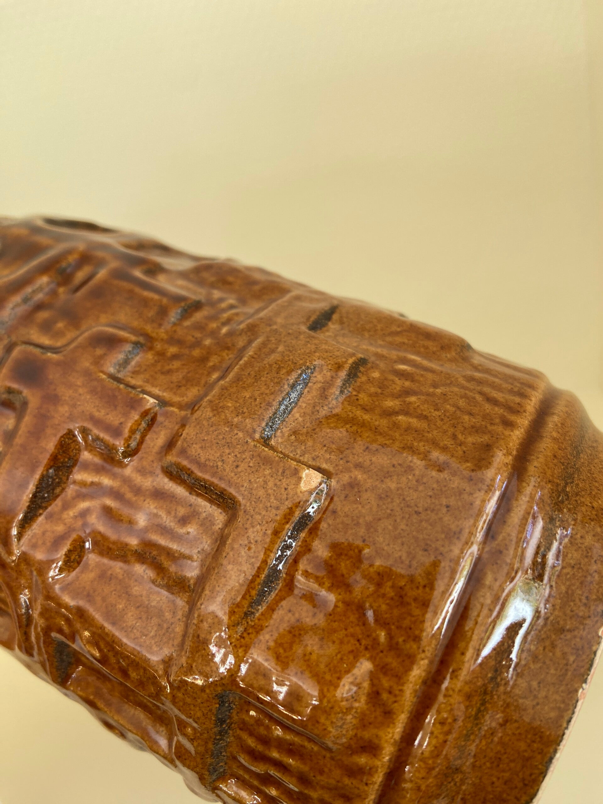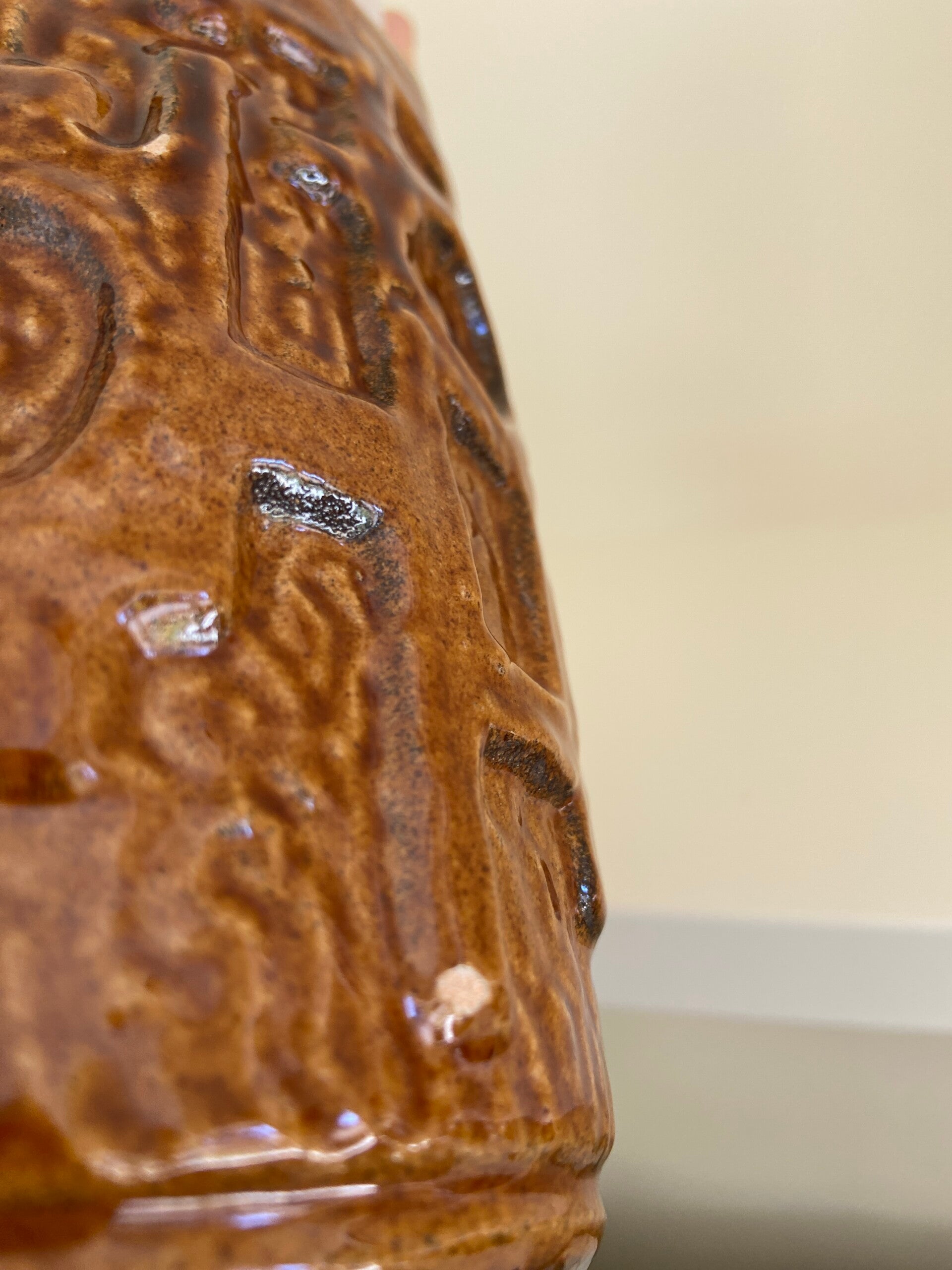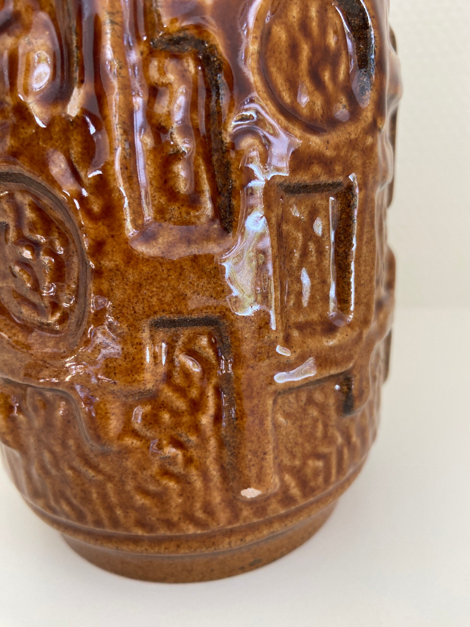 Brutalistische West Germany vaas van aardewerk in caramel en roomwit. De vaas verkeert in vintage staat met wat gebruikssporen aan het aardewerk. Hierop is de prijs aangepast. Maar Blijft Mooi!