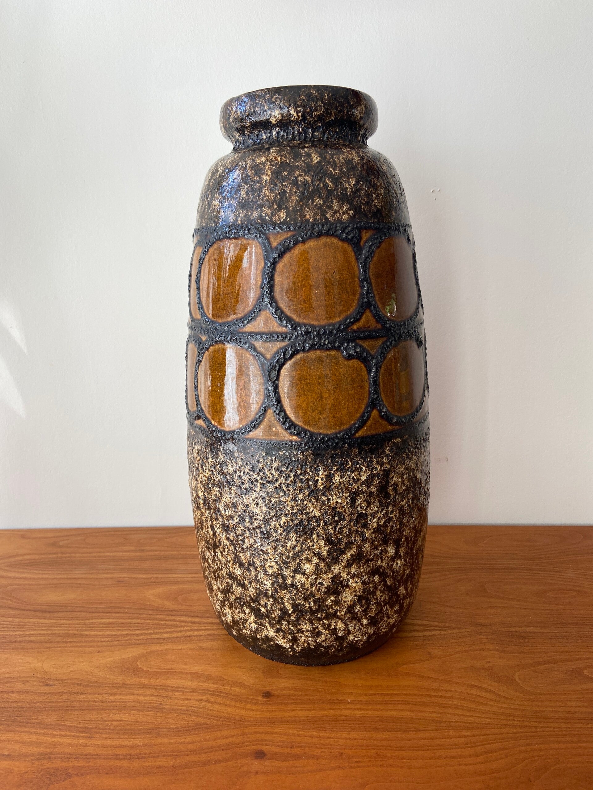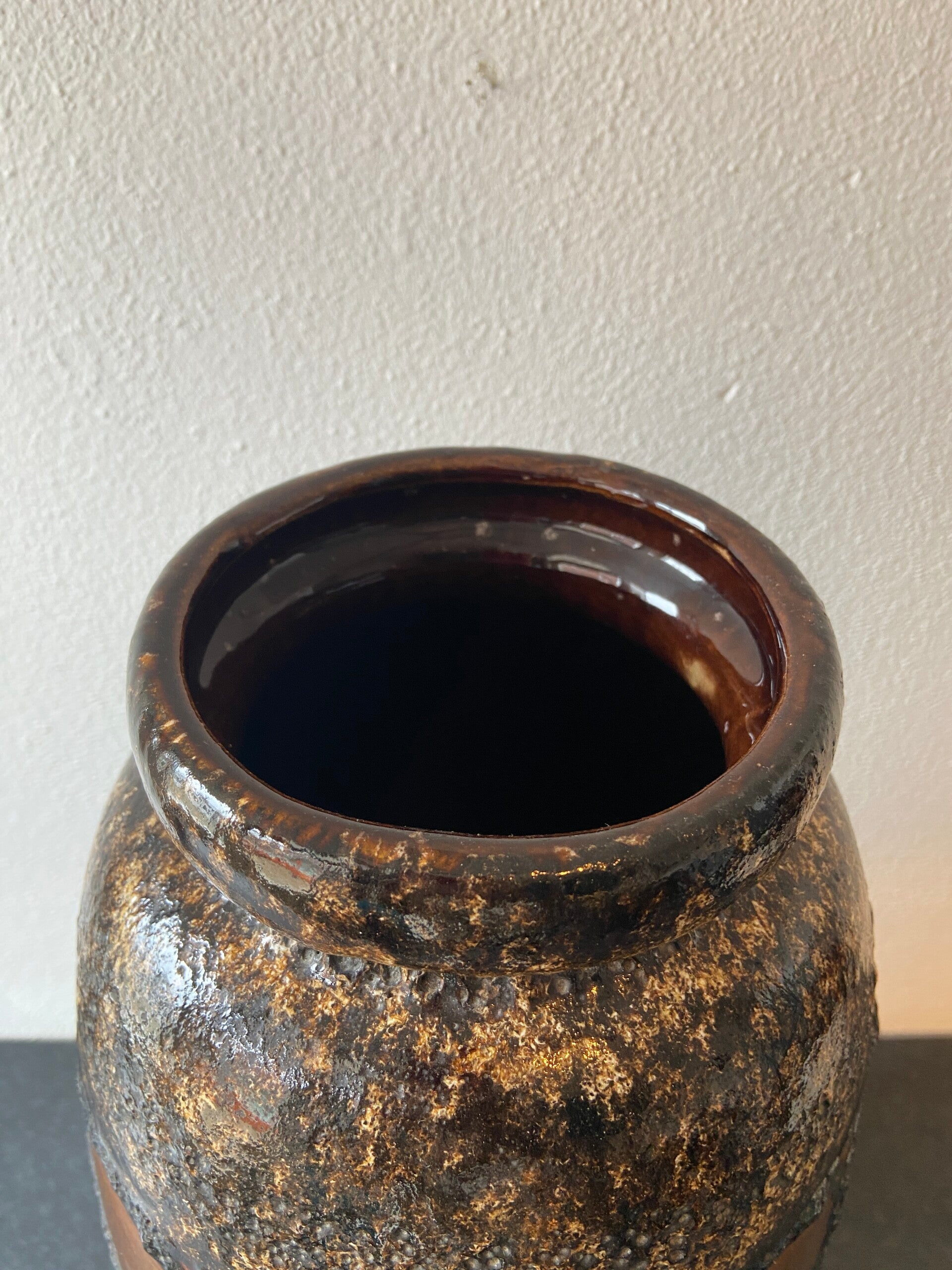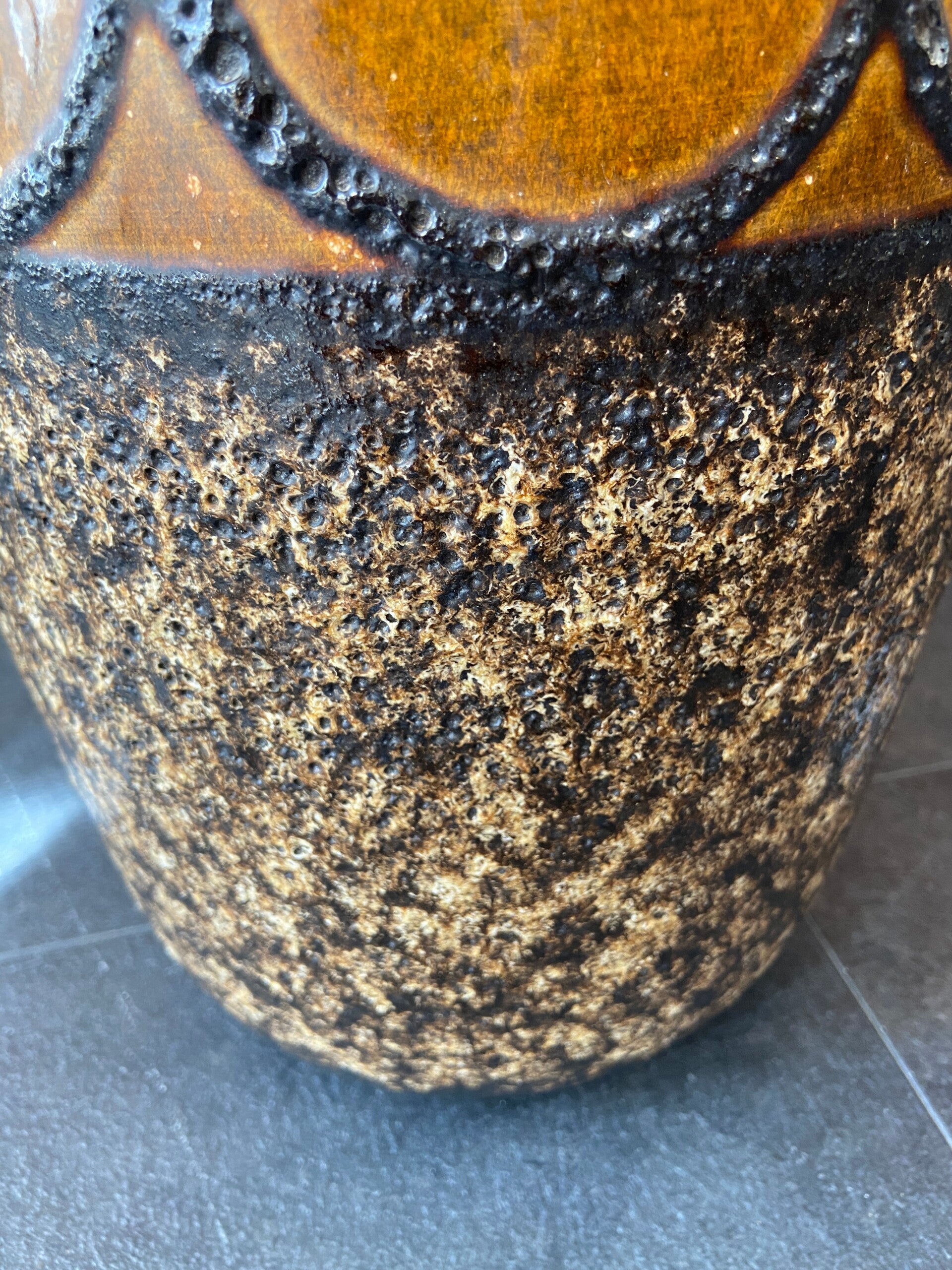 Werkelijk prachtige vloervaas van Scheurich! Uitgevoerd in zwart, zand en caramelkleurig keramiek met fat lava vormen. De vaas verkeert in goede staat. De vaas is gemerkt, maar dit is niet helemaal goed leesbaar.