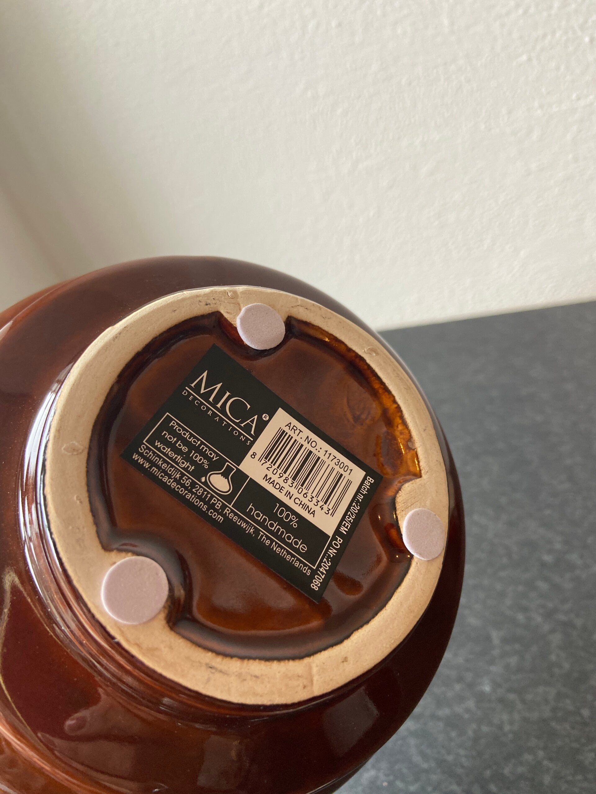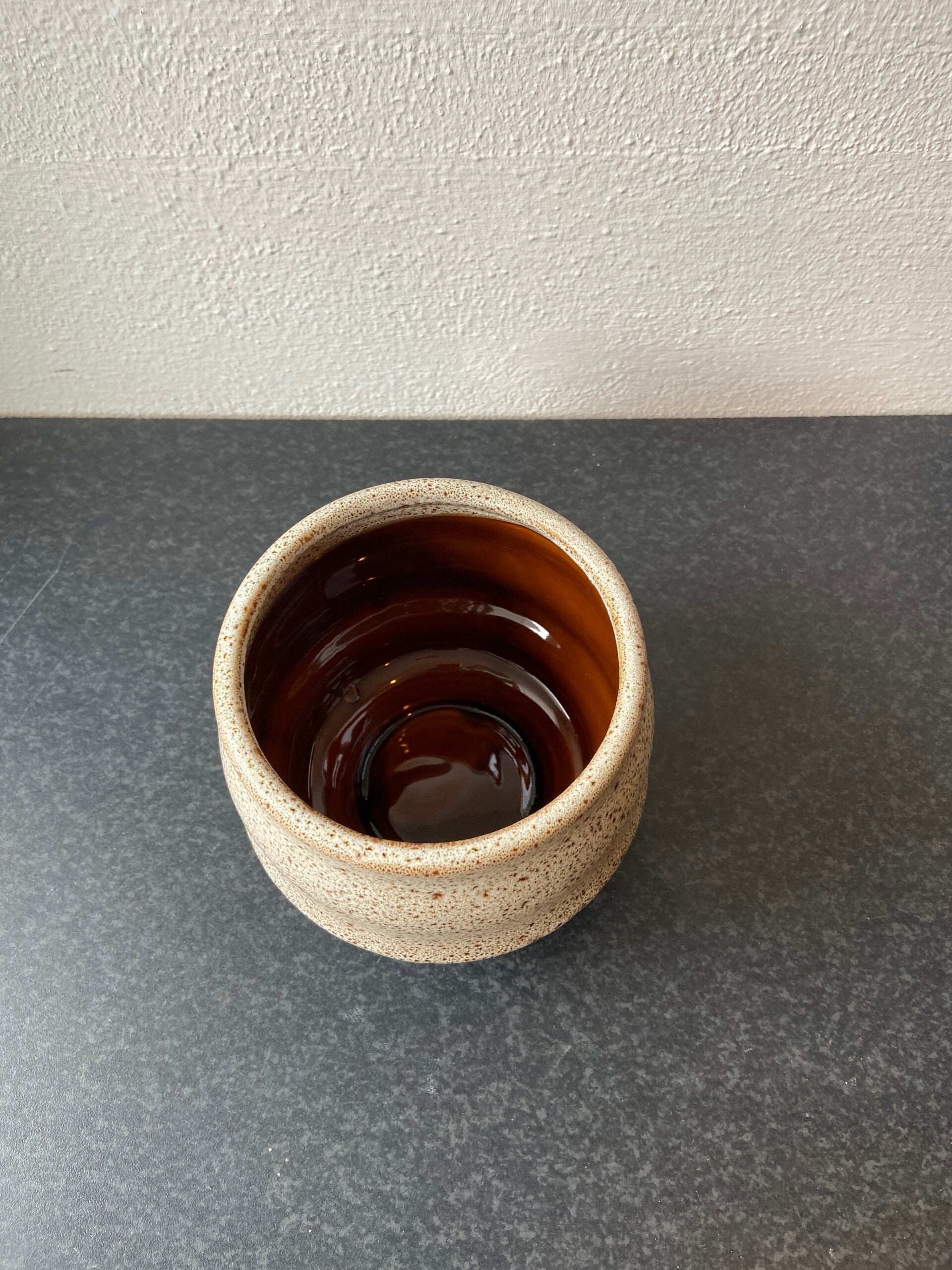 Retro handgemaakte bloempot in bruin/zandkleurig aardewerk maat M