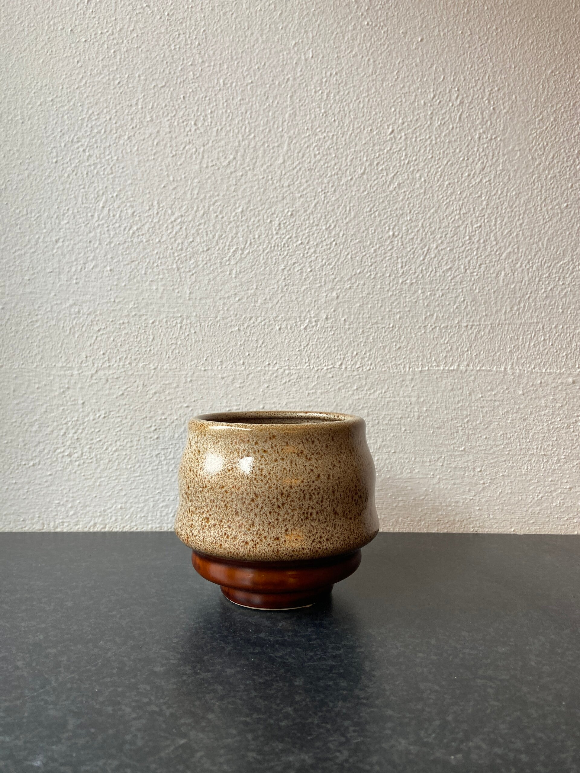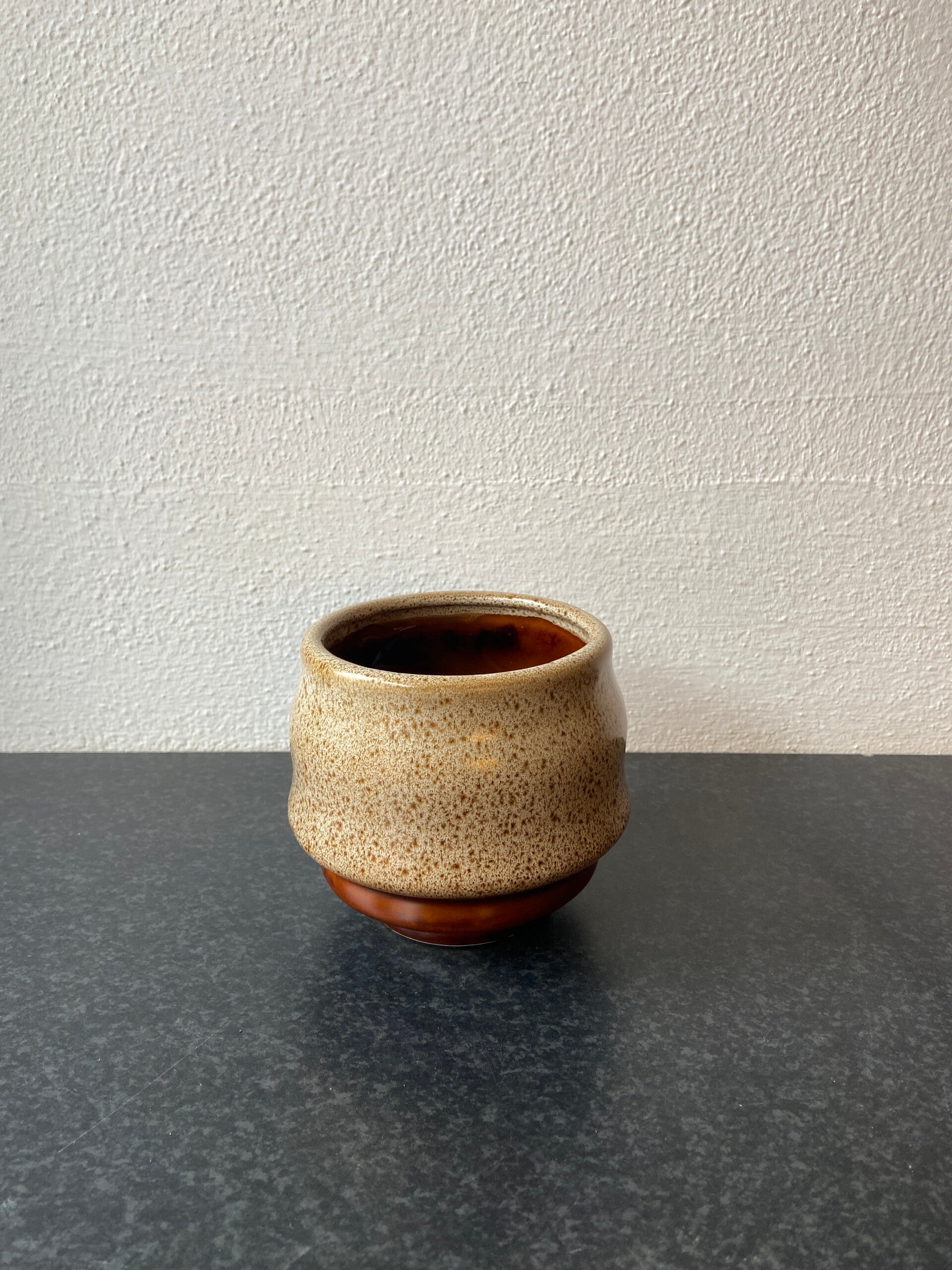 Retro handgemaakte bloempot in bruin/zandkleurig aardewerk maat S