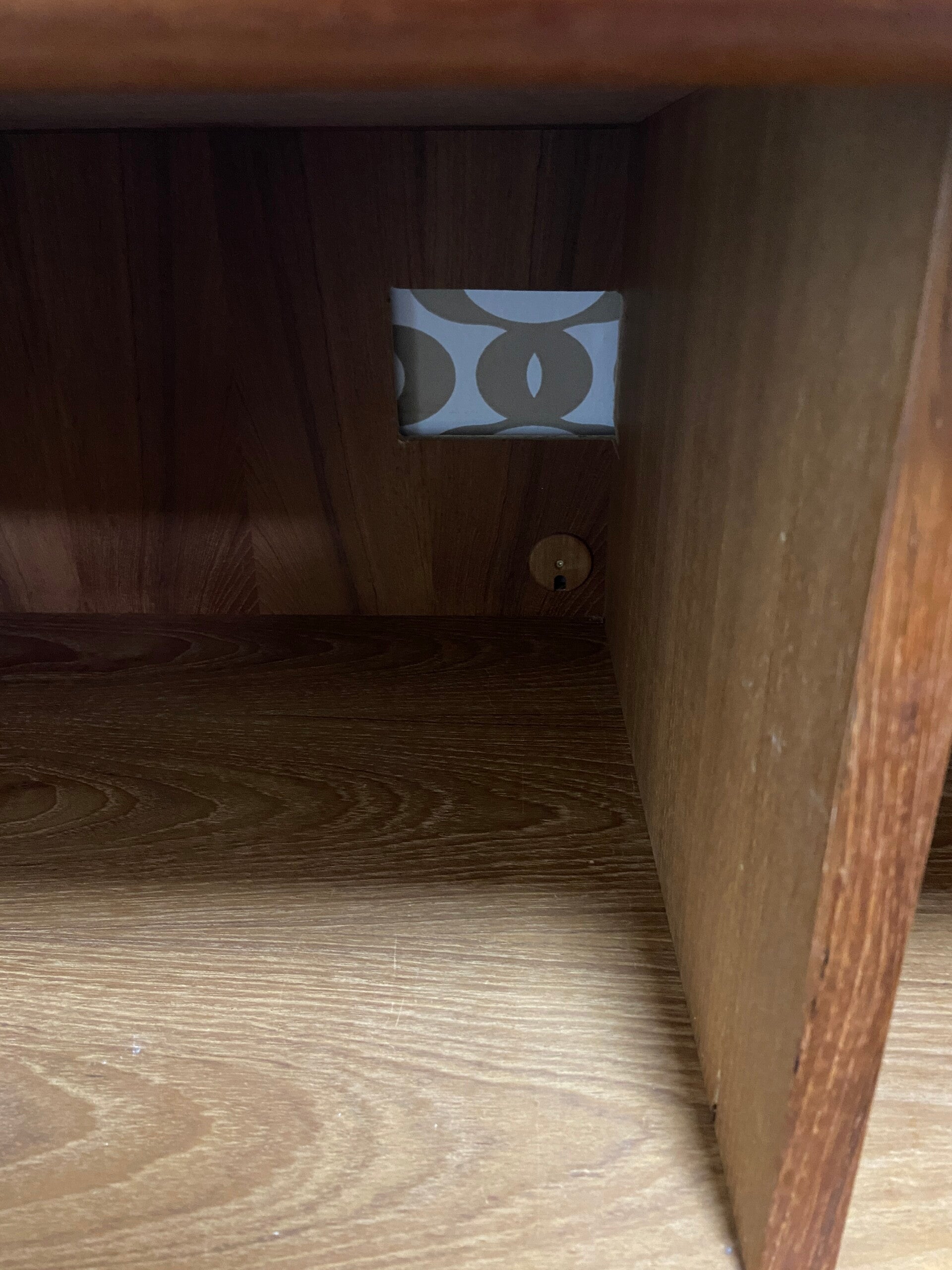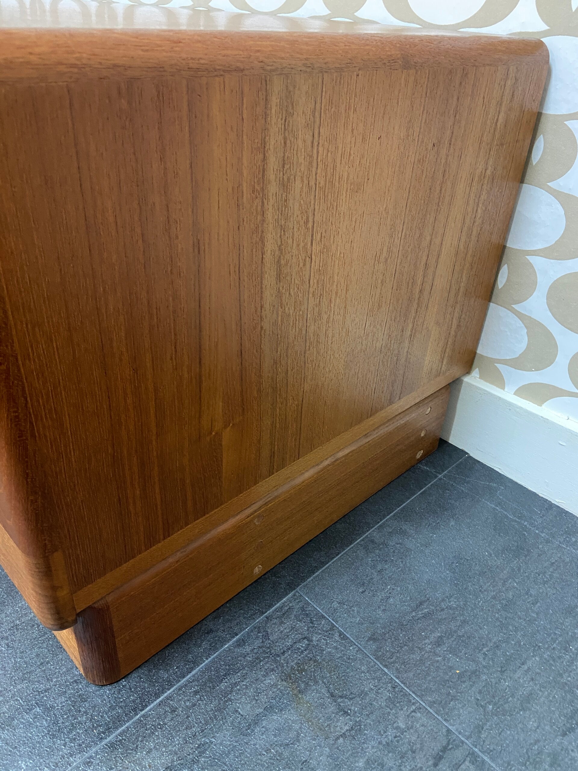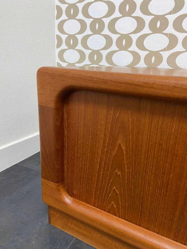 Dit lowboard van Dyrlund straalt klasse en ambachtelijkheid uit. De kast is gemaakt van (deels) massief teakhout en heeft de kenmerkende afgeronde hoeken waar Dyrlund bekend om staat. De kast heeft 2 tambourdeuren die geheel wegdraaien bij het openen. De kast verkeert in zeer mooie staat met een lichte verkleuring rechts op het bovenblad. In de achterwand links is een opening gemaakt voor het doorvoeren van snoeren.