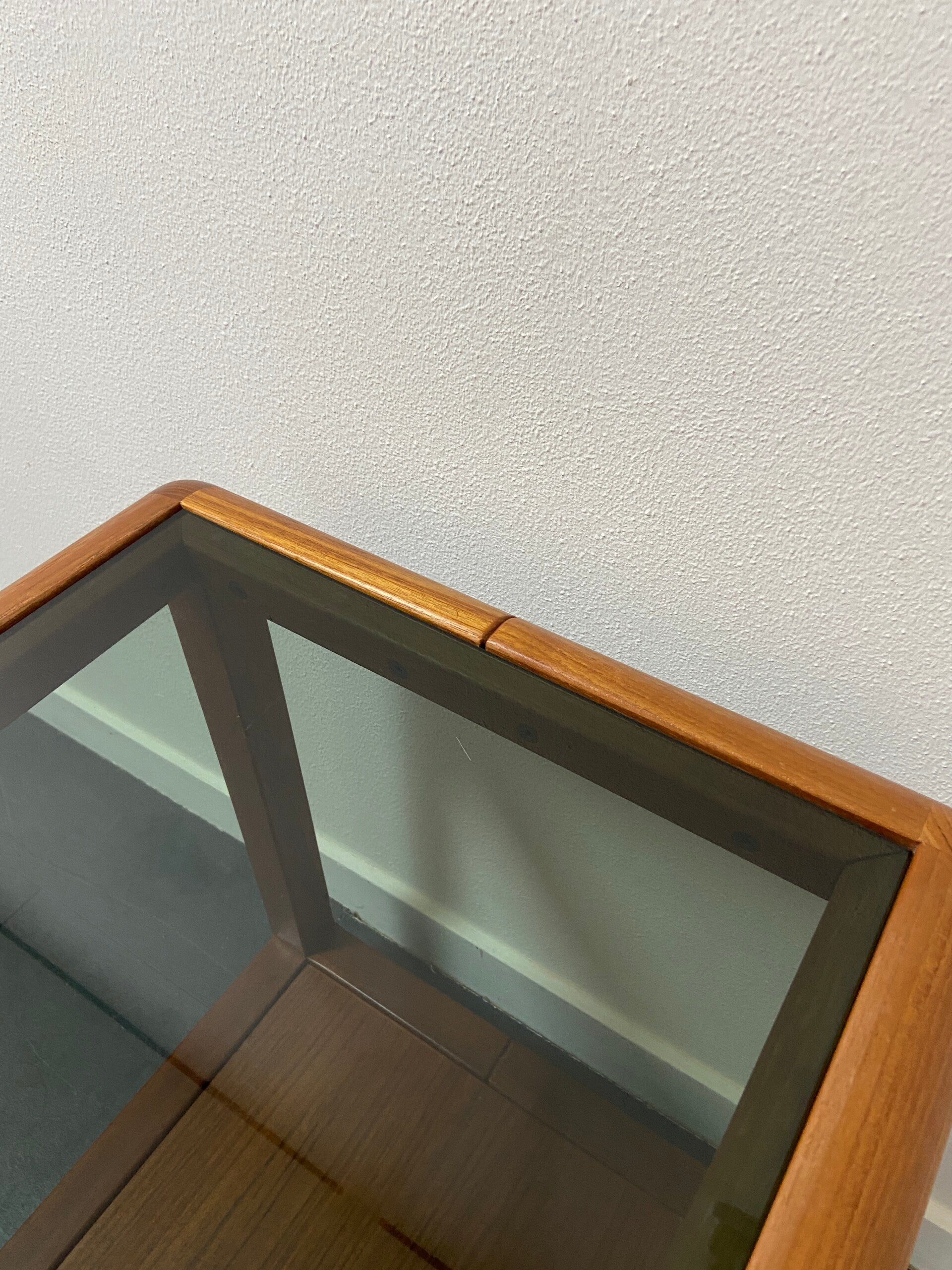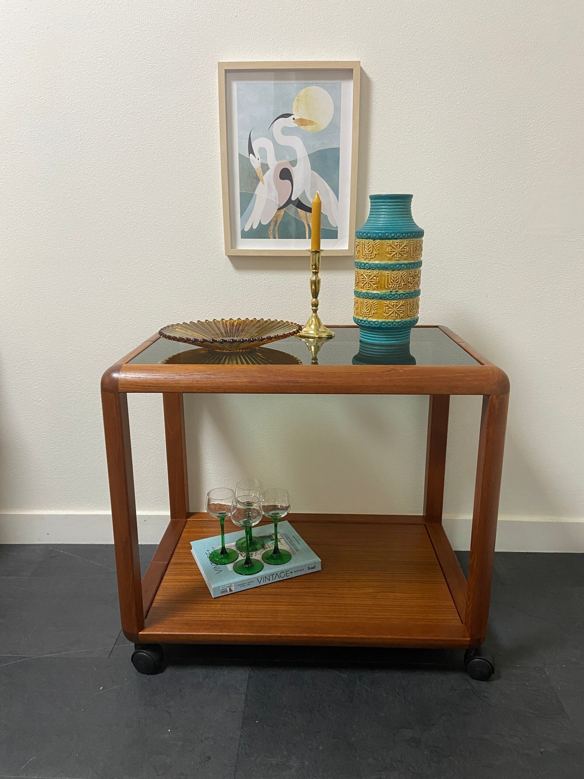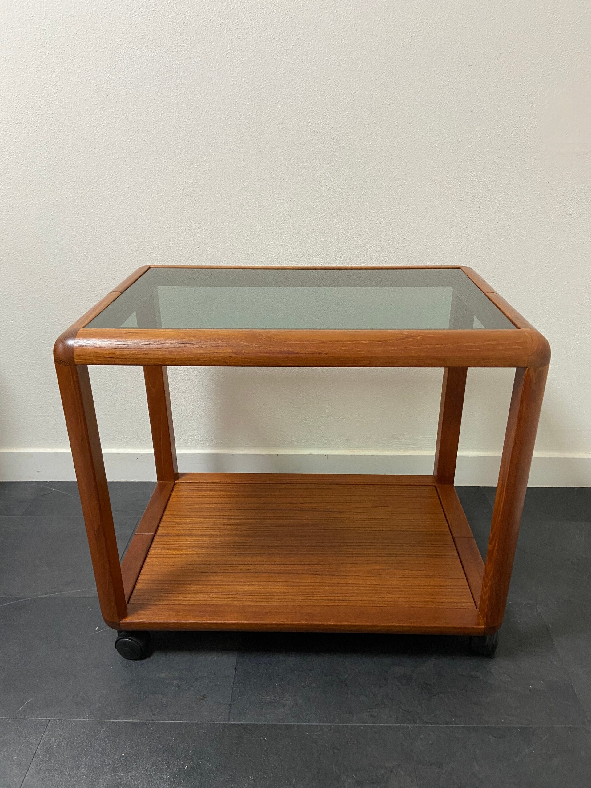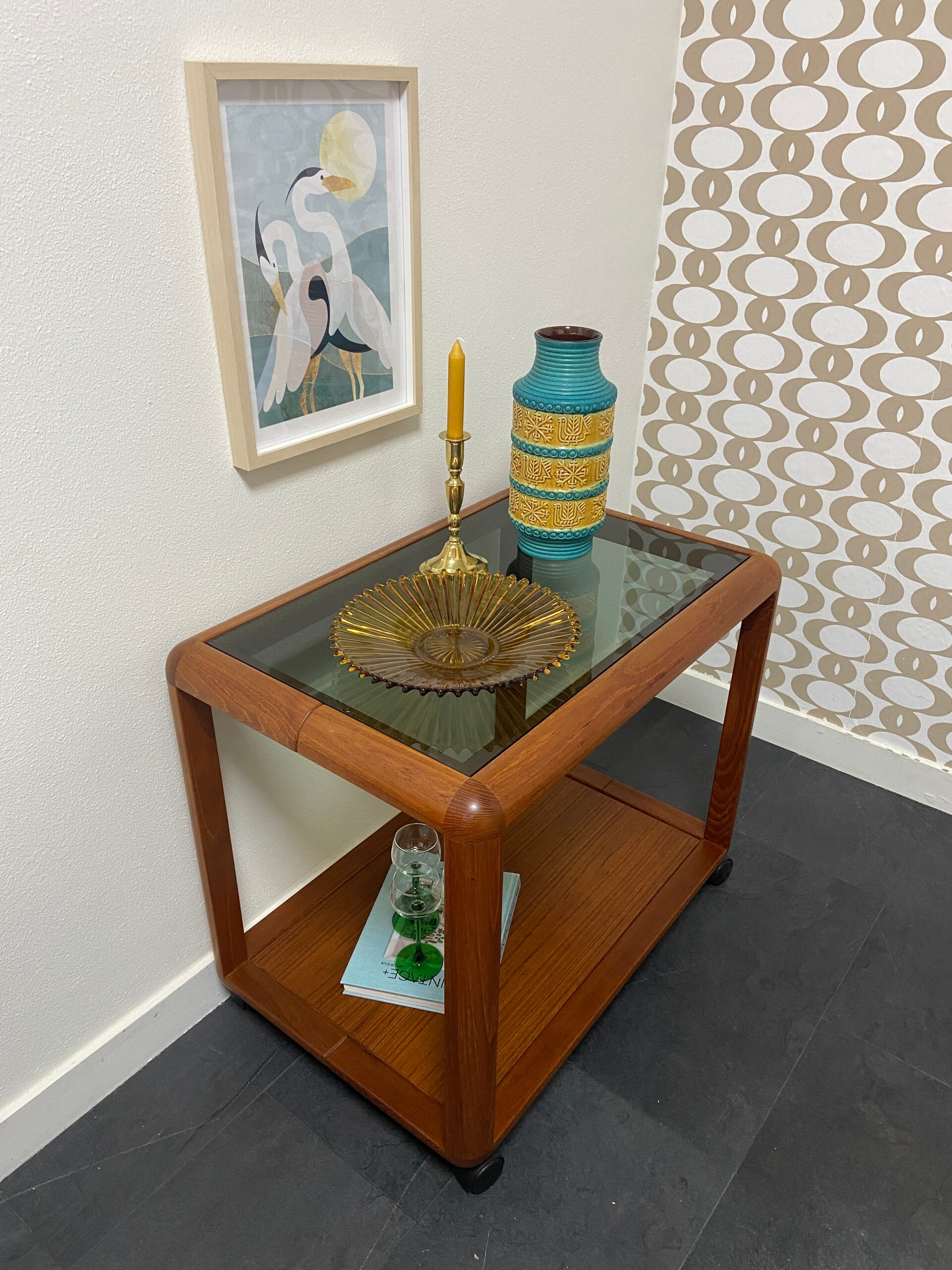Zeer mooi vormgegeven bijzettafel van deels massief teakhout. De tafel heeft een blad van rookglas en verkeert in uitstekende staat.