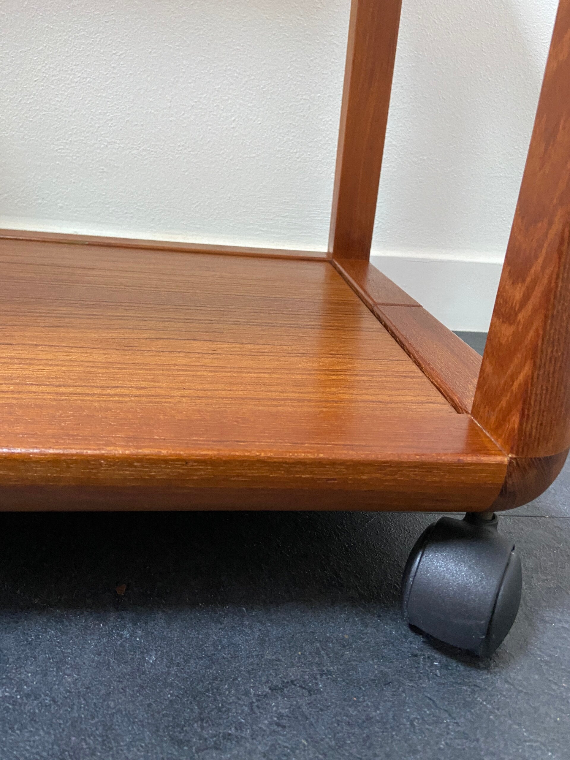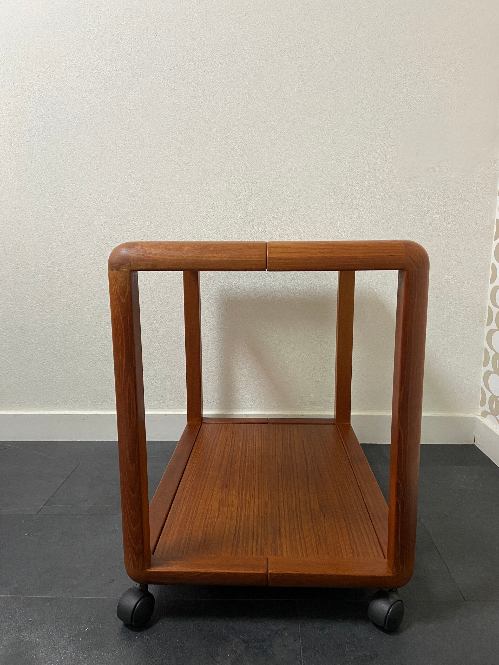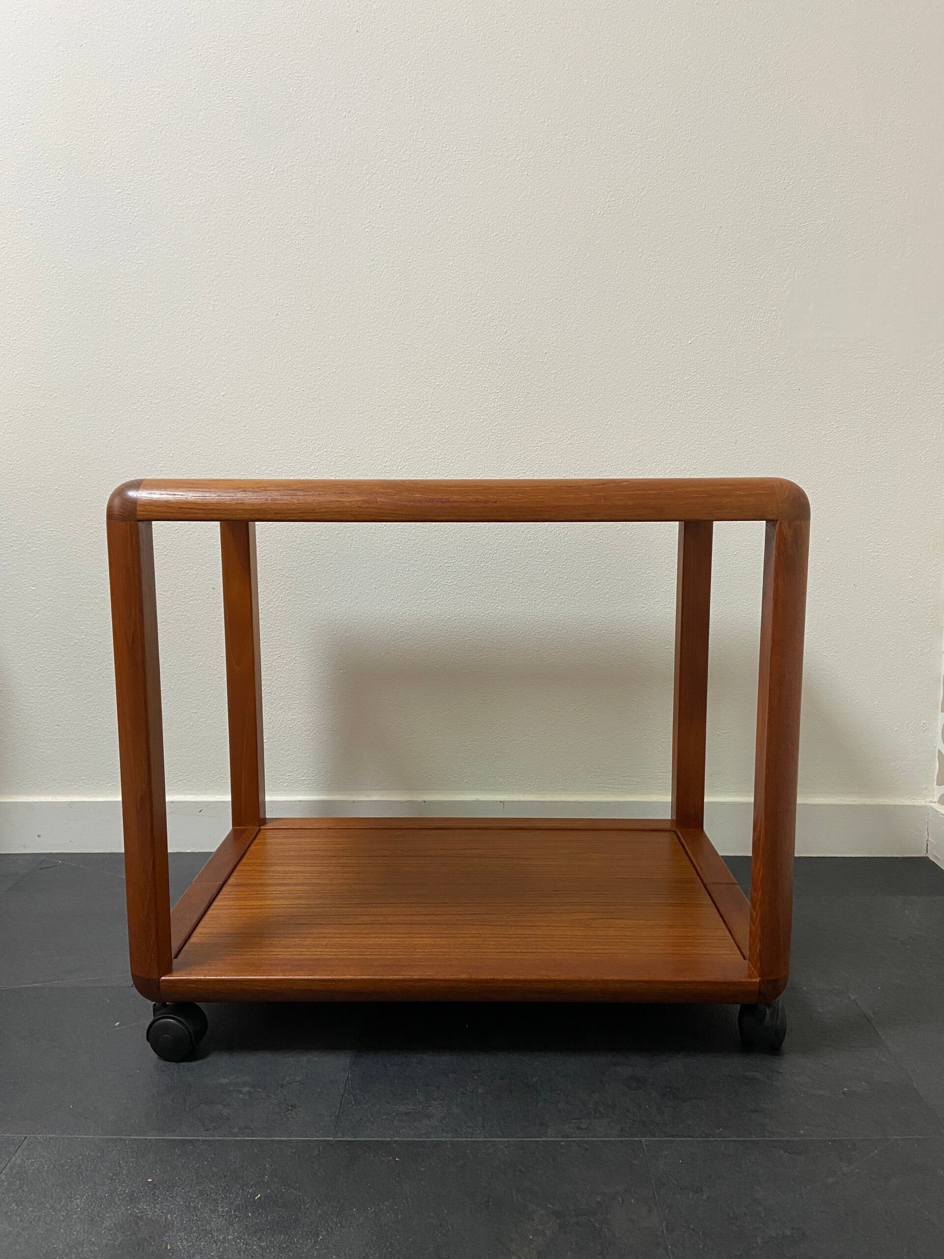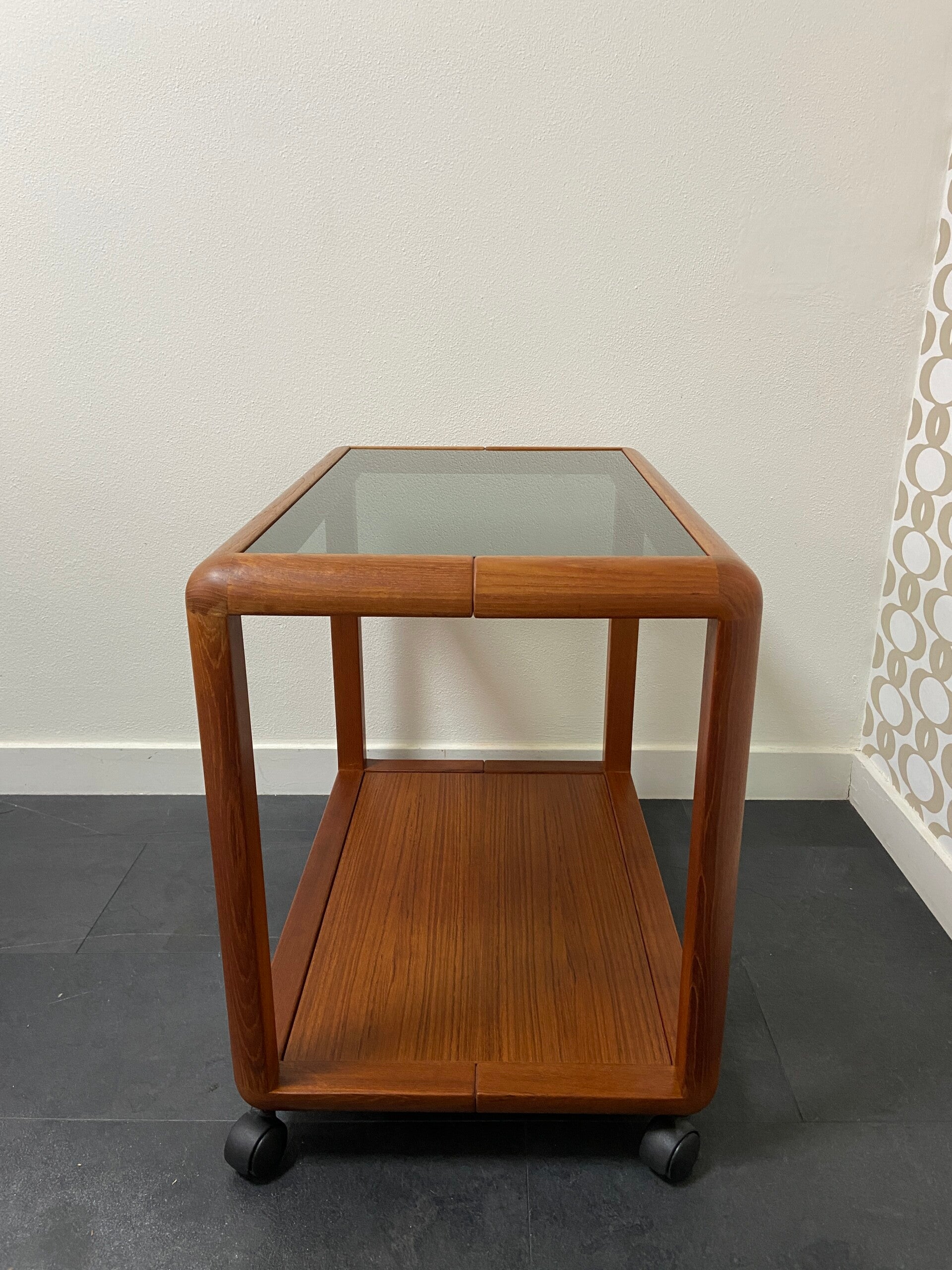 Zeer mooi vormgegeven bijzettafel van deels massief teakhout. De tafel heeft een blad van rookglas en verkeert in uitstekende staat.