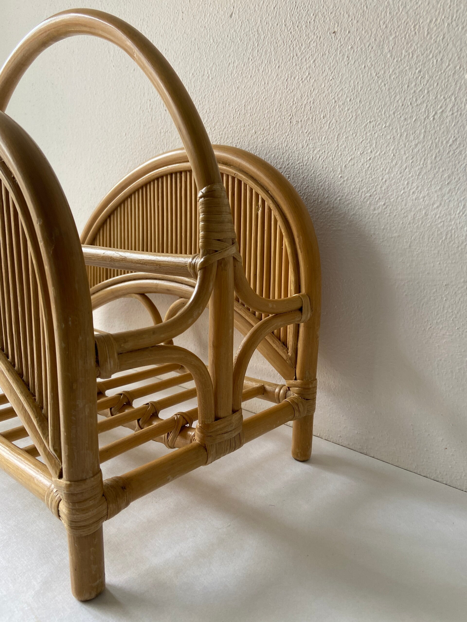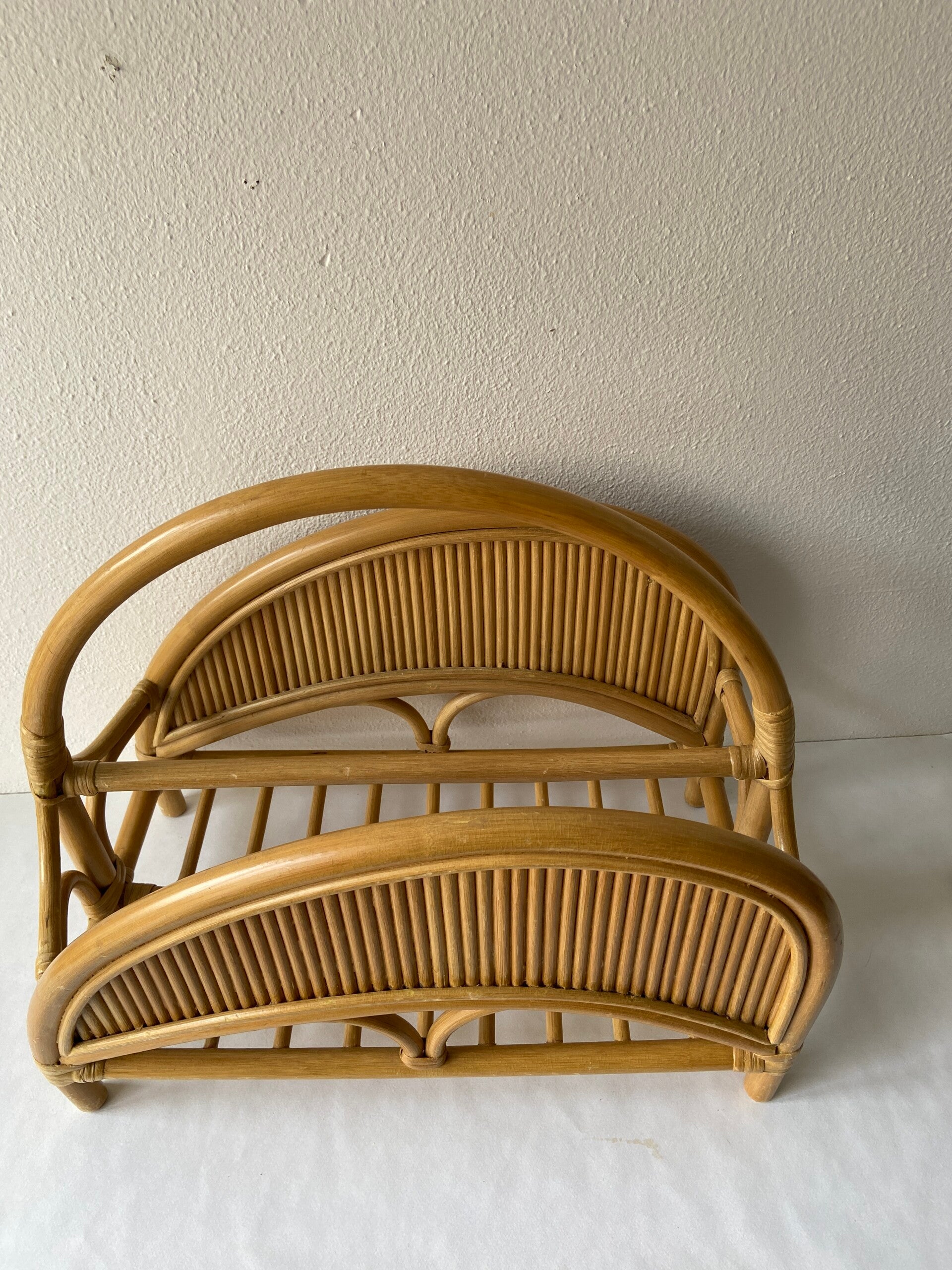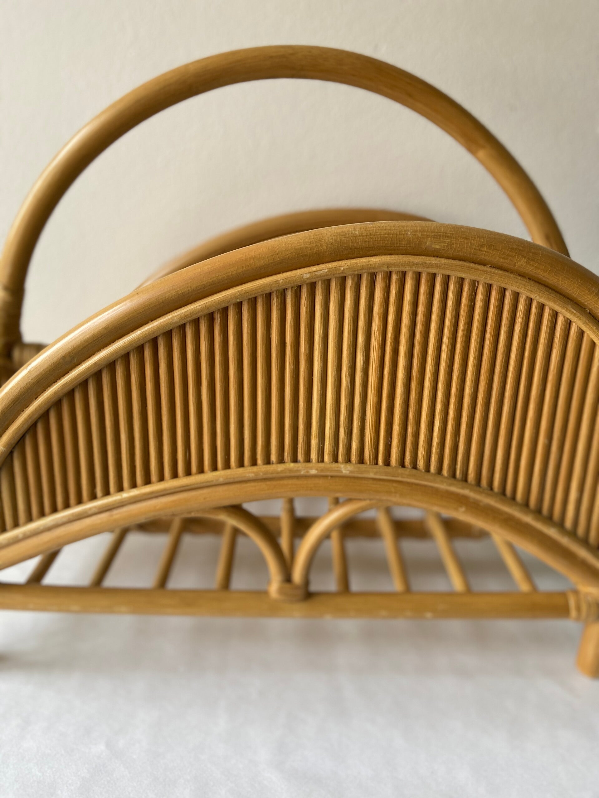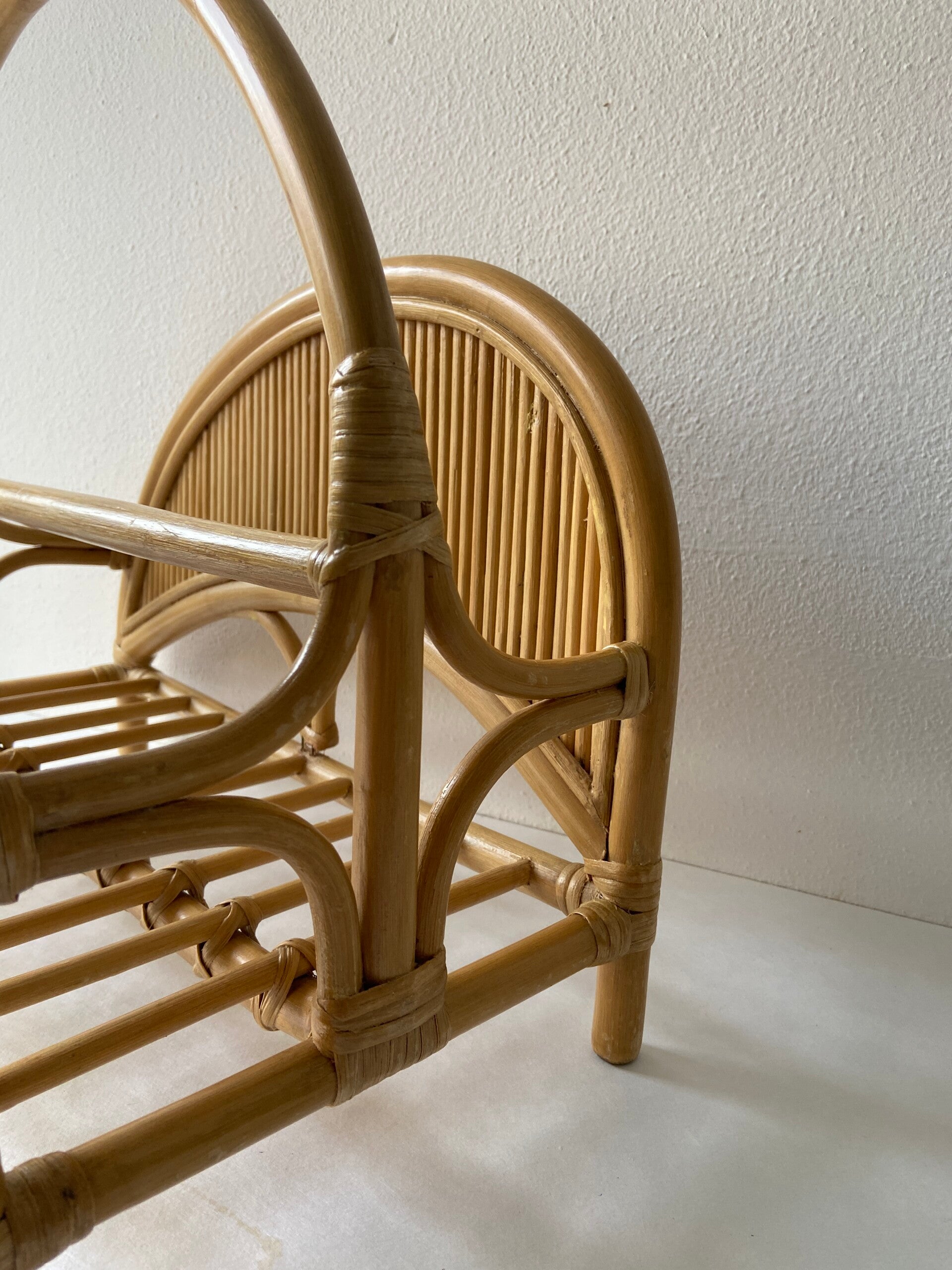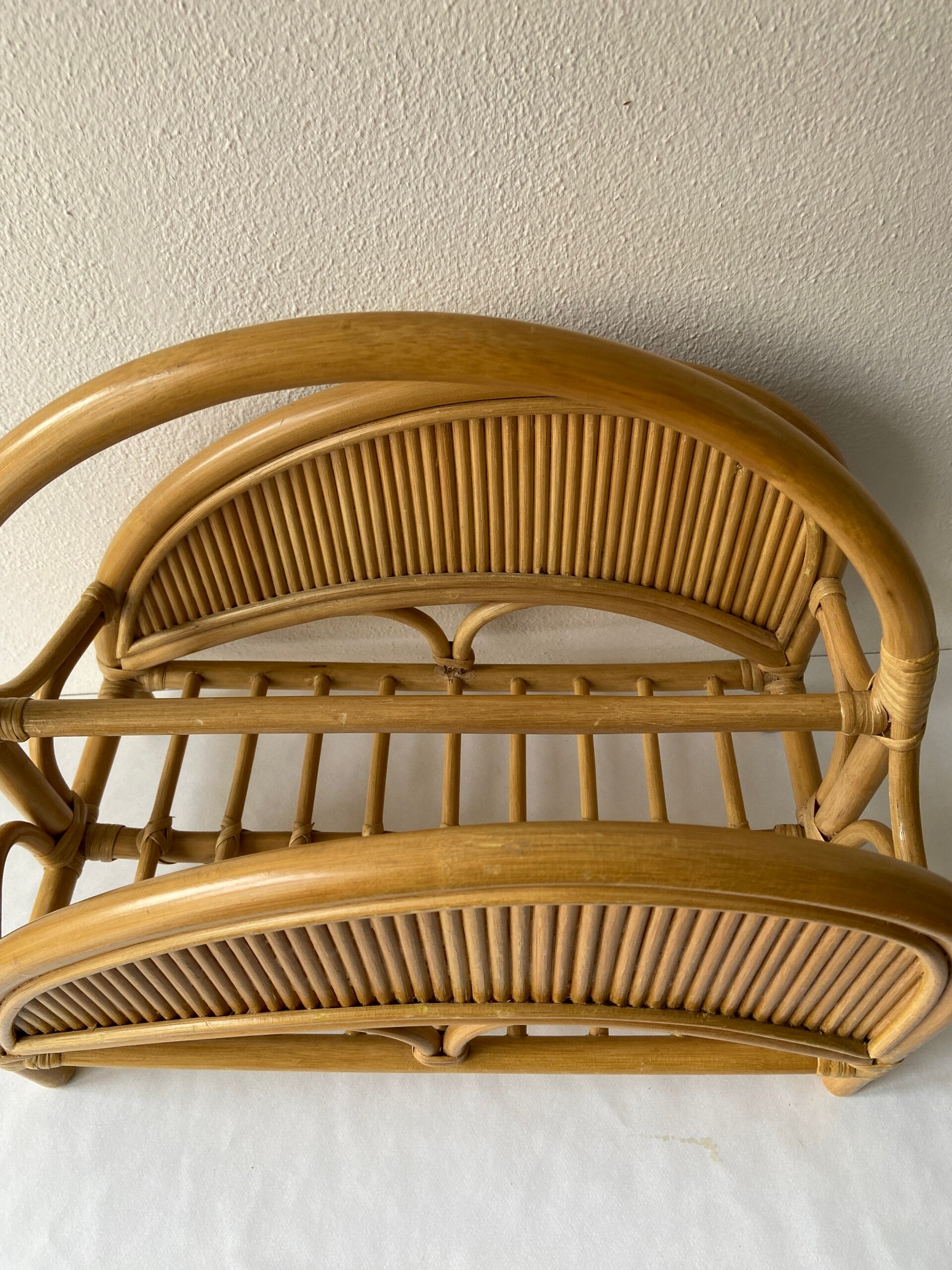 Prachtig vormgegeven tijdschriftenhouder in honingkleurig rotan en manou. De conditie is zeer goed.