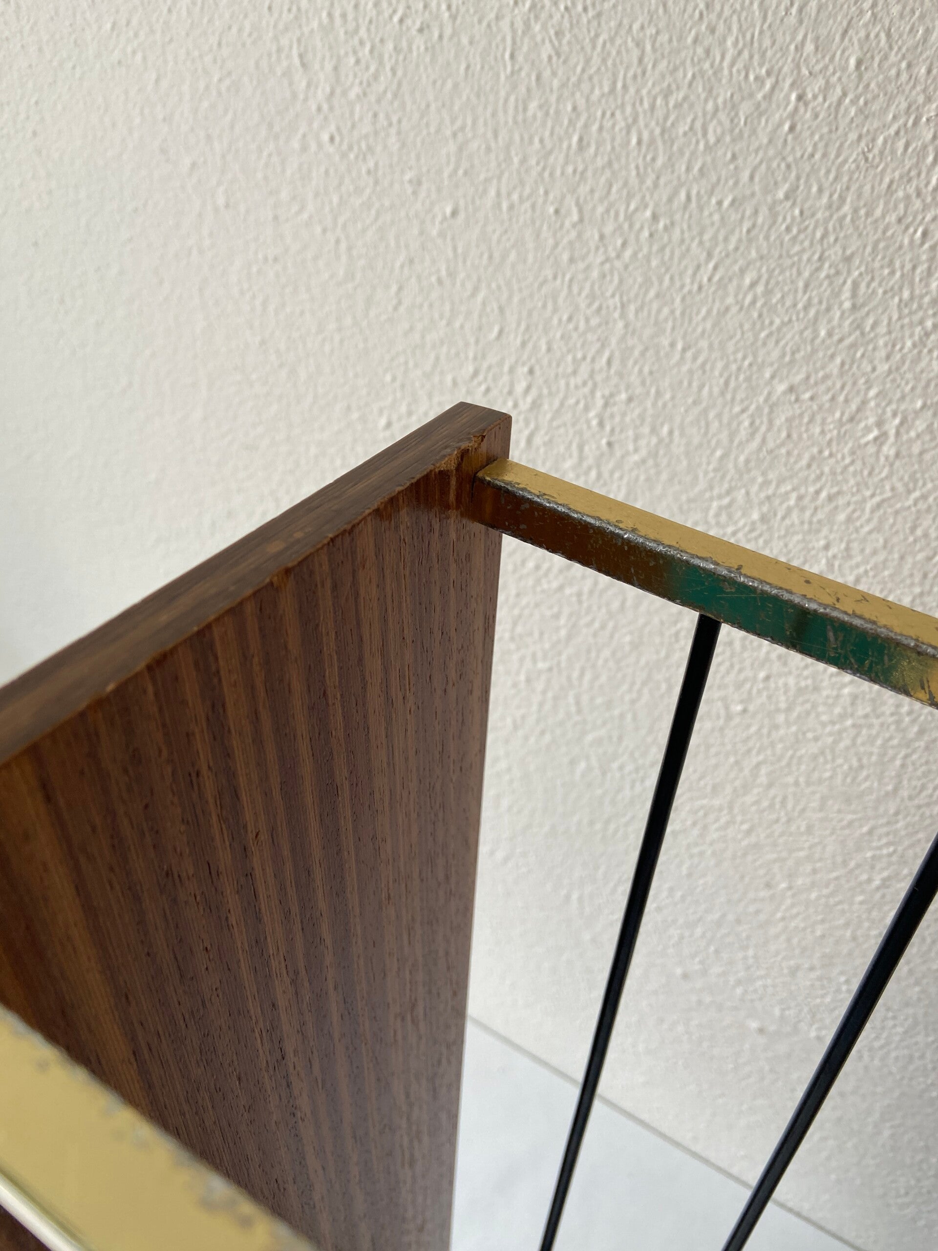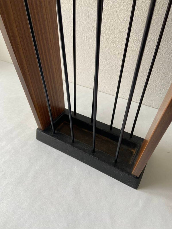 Deze stijlvolle vintage Duitse paraplubak uit de jaren '60 heeft een messing frame, zijkanten van teakfineer en een metalen lekbak. De parapluhouder verkeert in mooie staat met lichte gebruikssporen, passend bij de leeftijd.