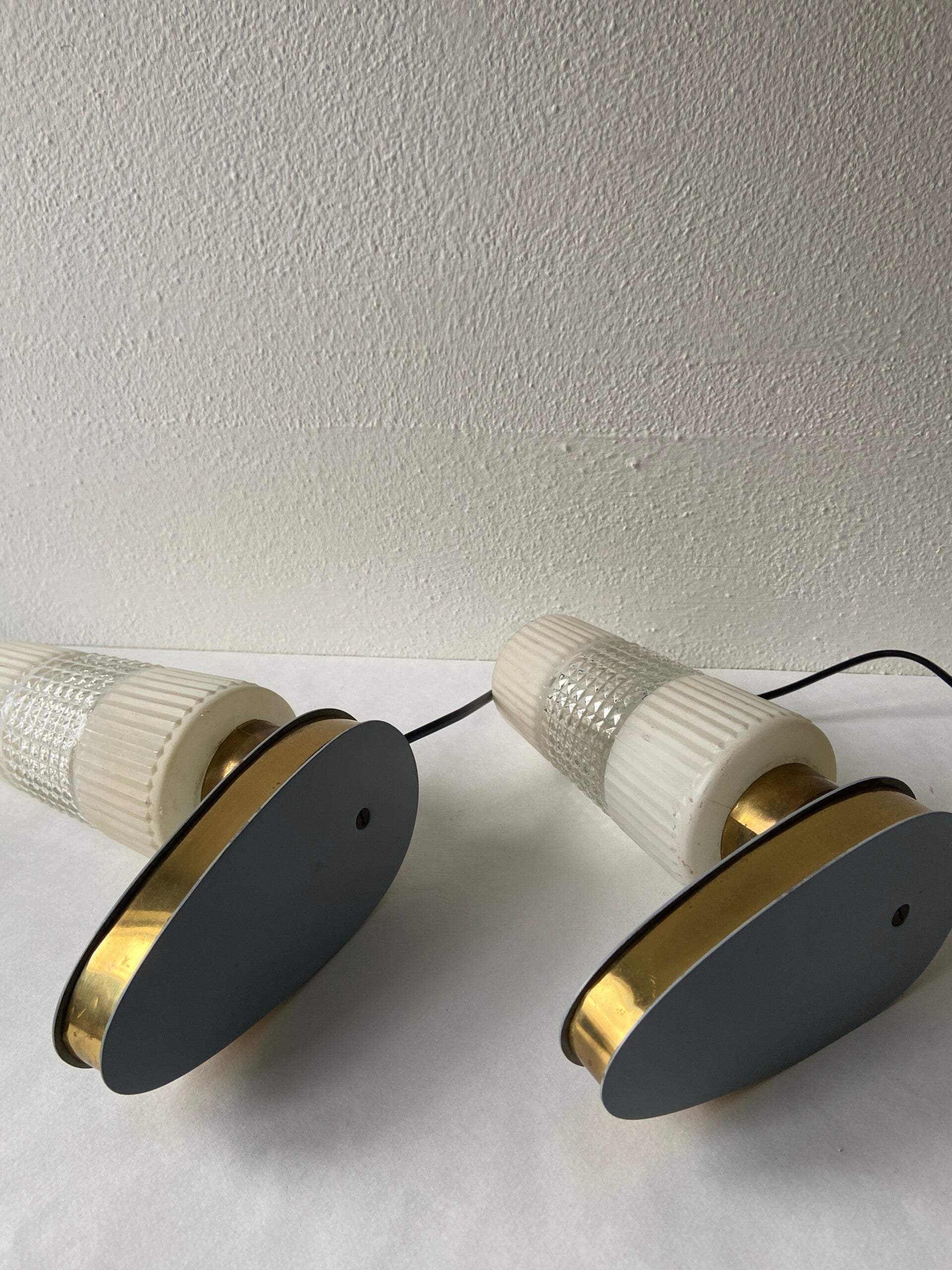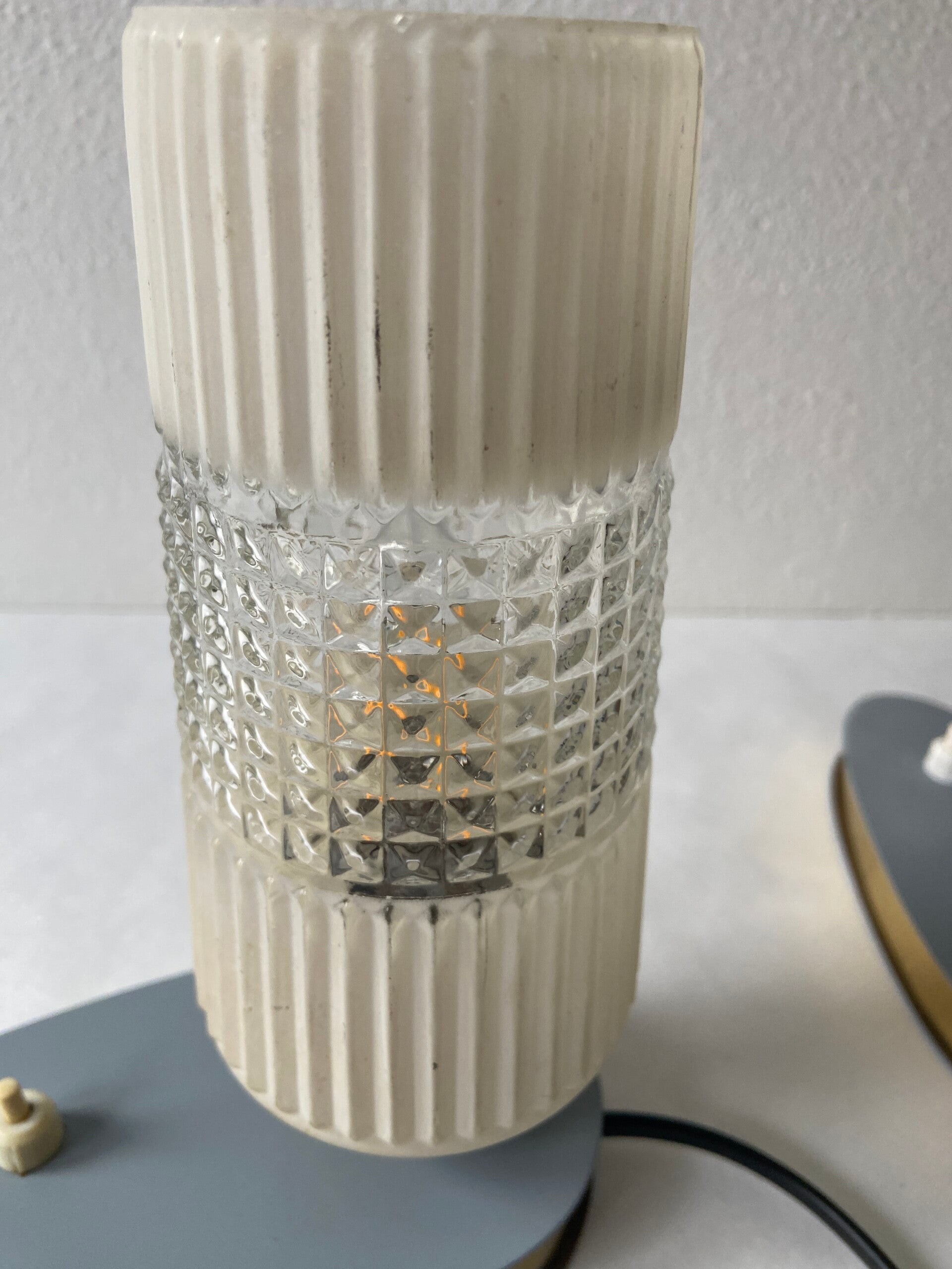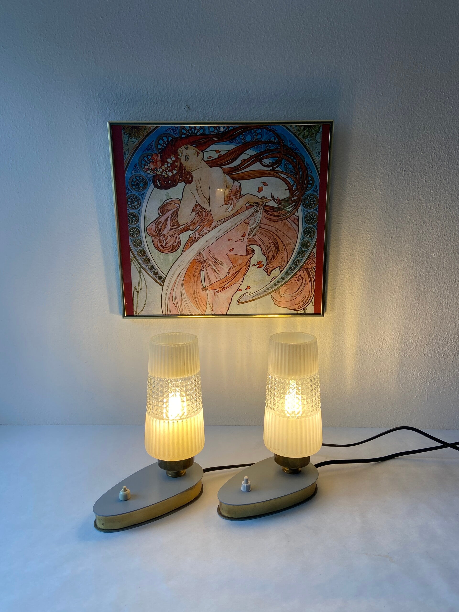 Deze geweldige set van vintage bedlampjes dateert uit de jaren '50 maar zijn volledig nagekeken en opnieuw bedraad; ze kunnen dus weer jaren mee. Kenmerkend aan het ontwerp zijn de ovale, metalen lamphouders en conische glazen kapjes van opaal- en helder bewerkt glas. De messing details geven de lampjes een chique uitstraling. De conditie is goed met gebruikssporen passend bij de leeftijd. Zie de foto's die onderdeel zijn van de beschrijving. De lampjes zijn gemaakt door Massive, België. De lampjes zijn geschikt voor E14 lampen.