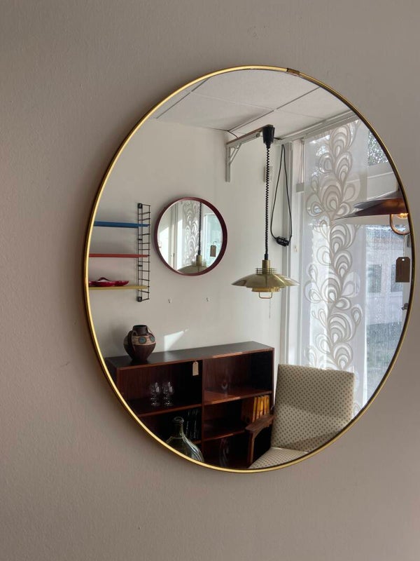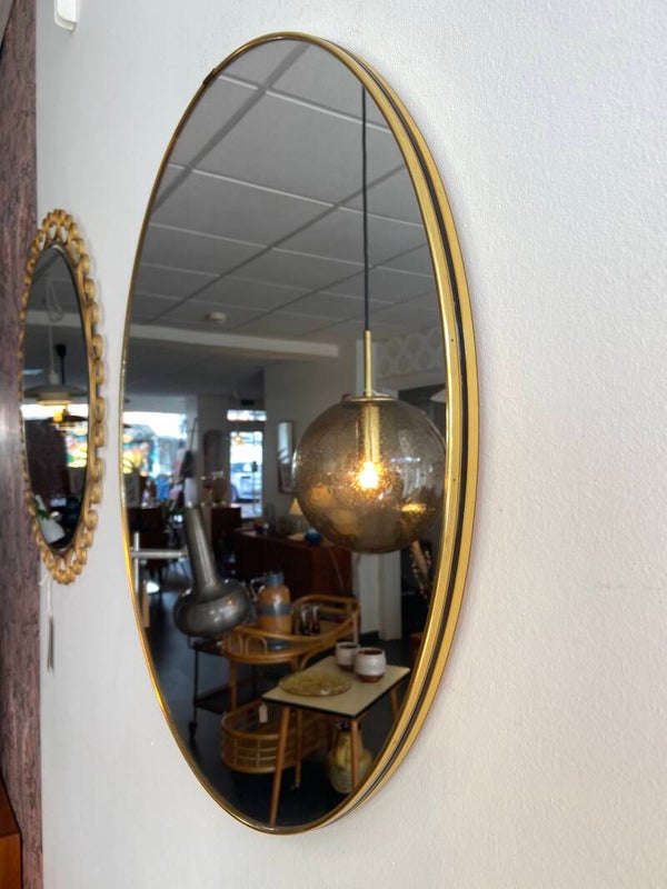 Ronde spiegel met messing rand en zwarte bies. De spiegel verkeert in mooi staat.