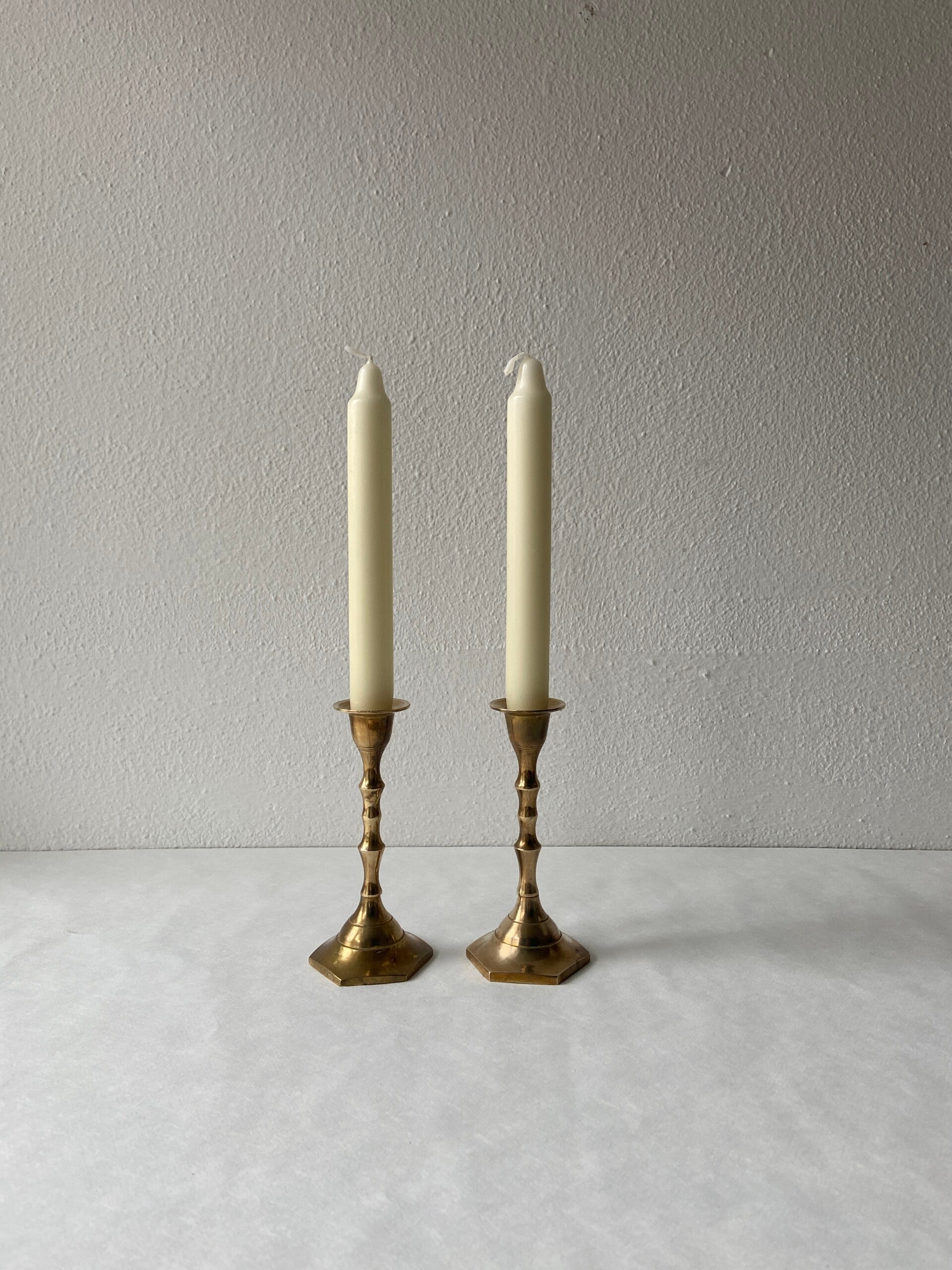 Leuke set van 2 messing kandelaren. De kandelaren verkeren in mooie staat met wat patina in het messing. Afmetingen: H13 x Diameter 5,5 cm.