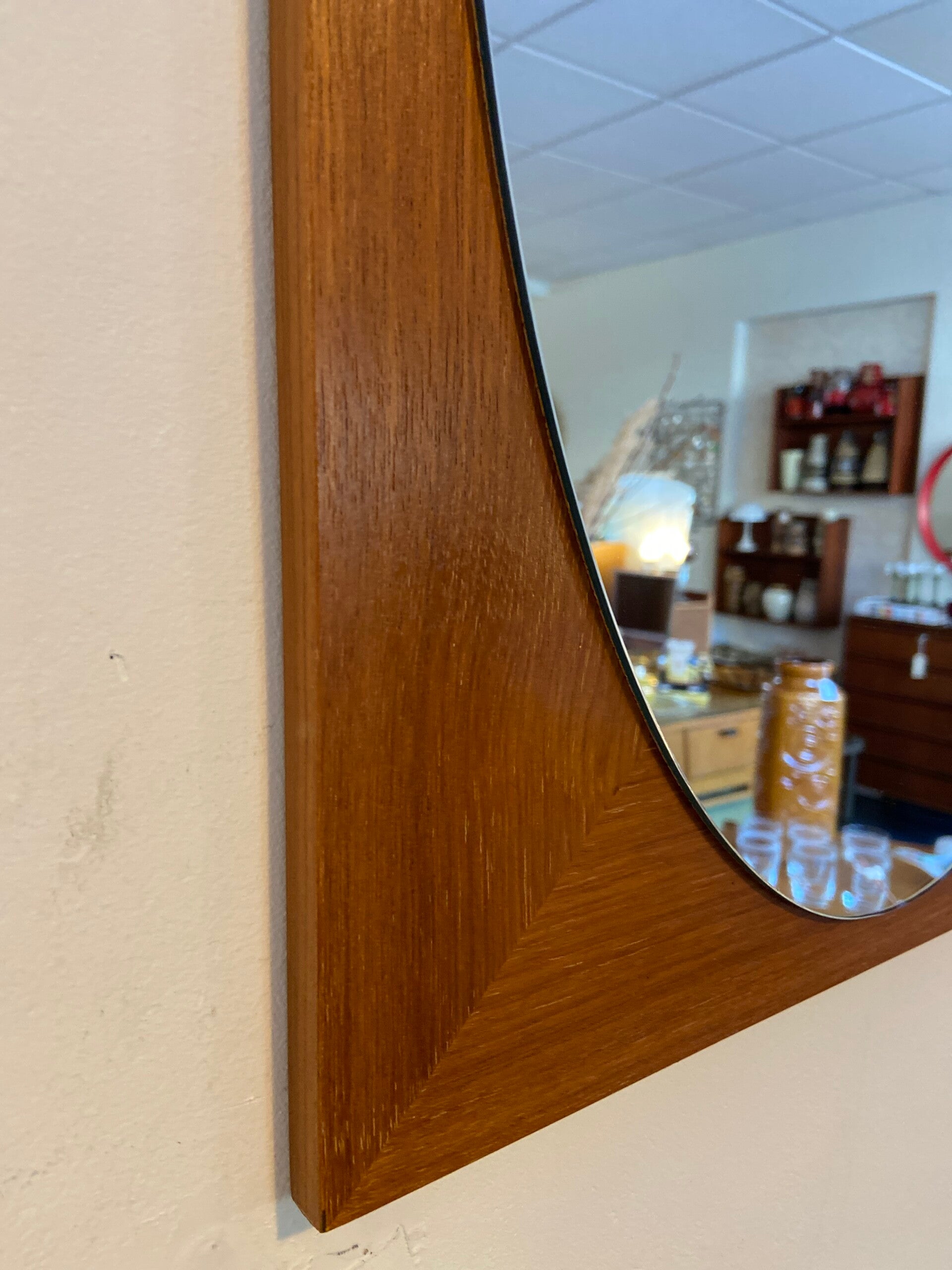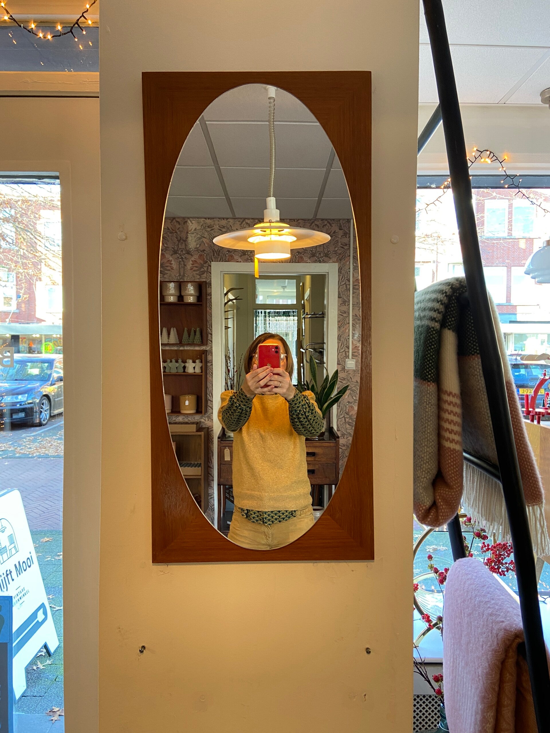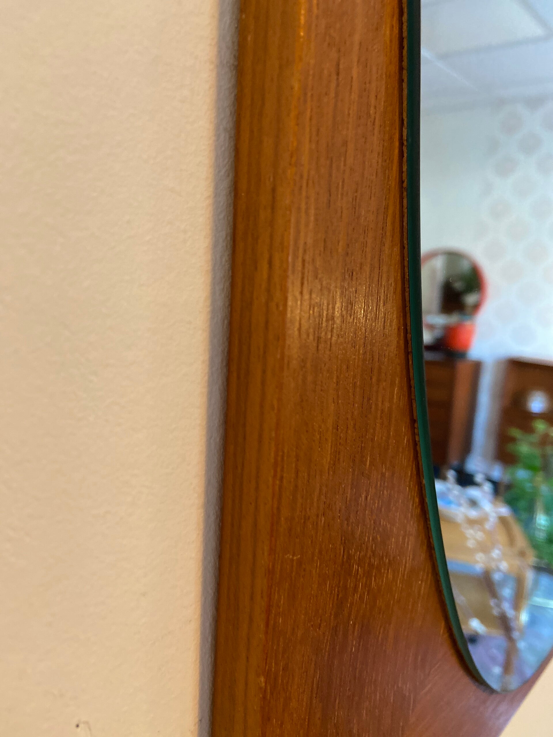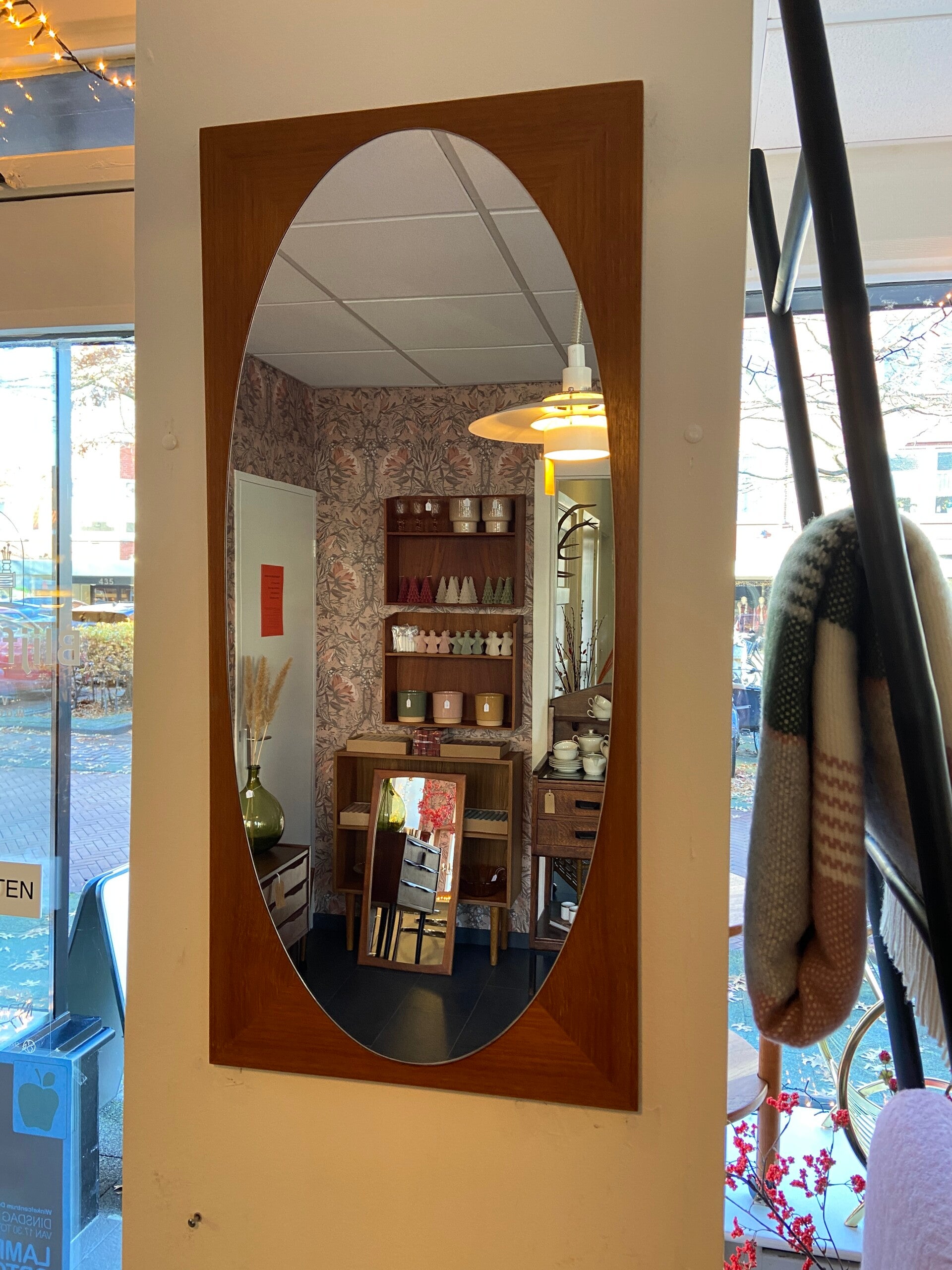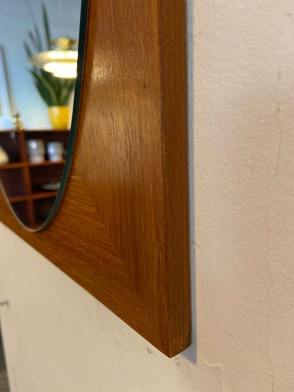 Mooi vormgegeven ovalen spiegel op een houten plaat. De spiegel verkeert in zeer goede staat. Bijzonder aan deze spiegel is dat hij zowel verticaal als horizontaal kan worden opgehangen.