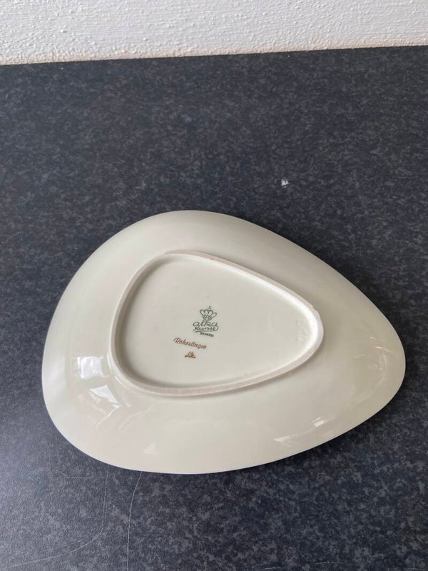 Verfijnd schaaltje van porselein met een afbeelding van een vogel en lisdodde in goukleur. De schaal is gemerkt aan de onderkant.