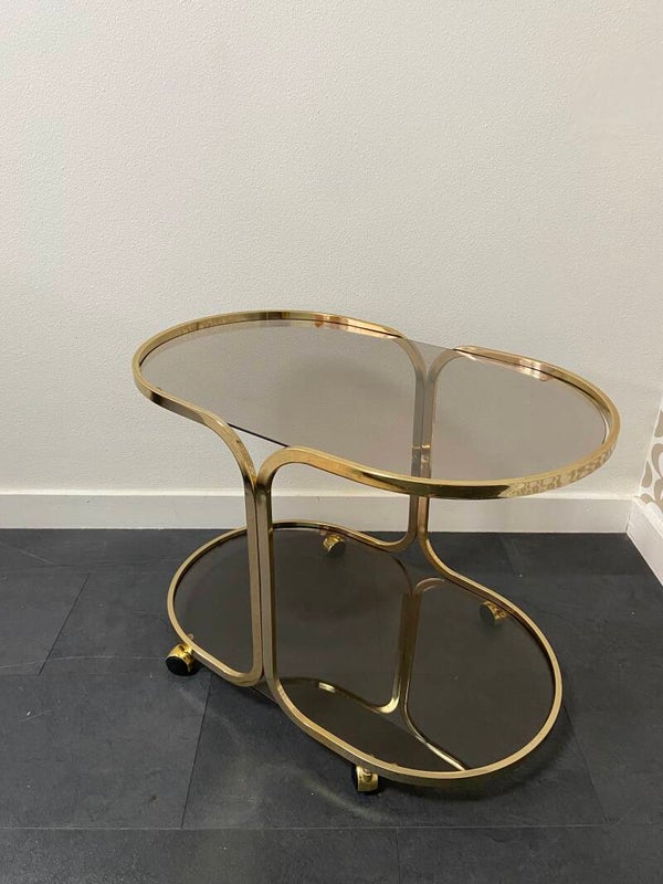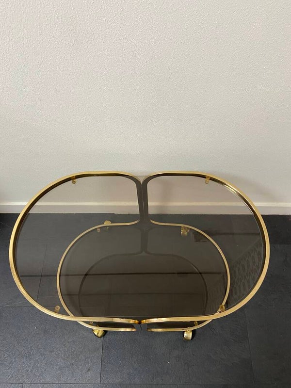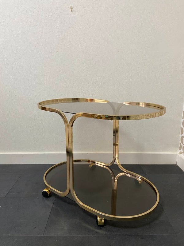 Wat een mooi gevormde serveerwagen is dit! De ovale vorm in combinatie met het rookglas geeft hem een chique look. De wagen verkeert in mooie vintage staat; het metaal heeft hier en daar wat verkleuring opgedaan evenals de wielen. Het glas is in goede staat; geen chips e.d.