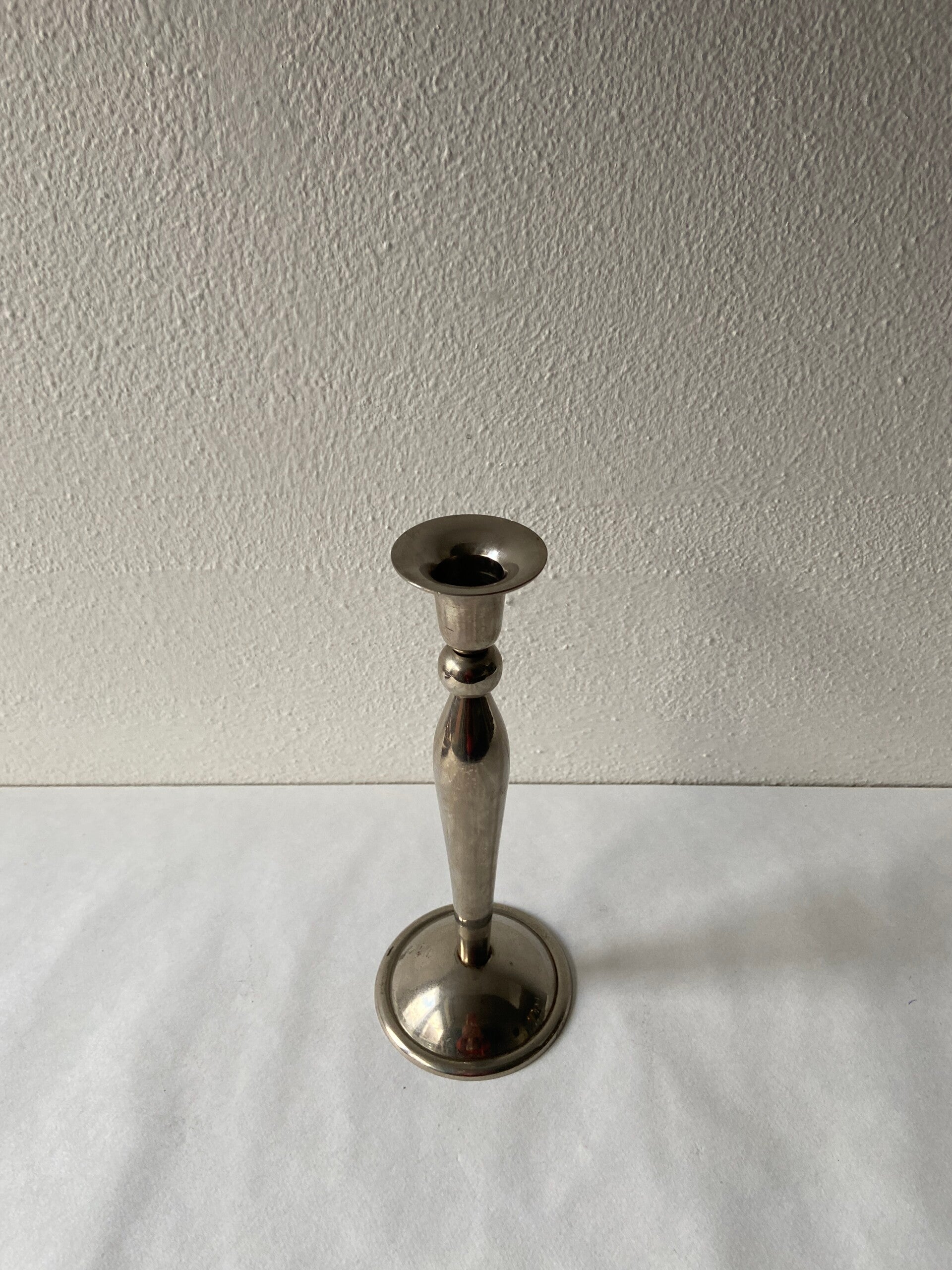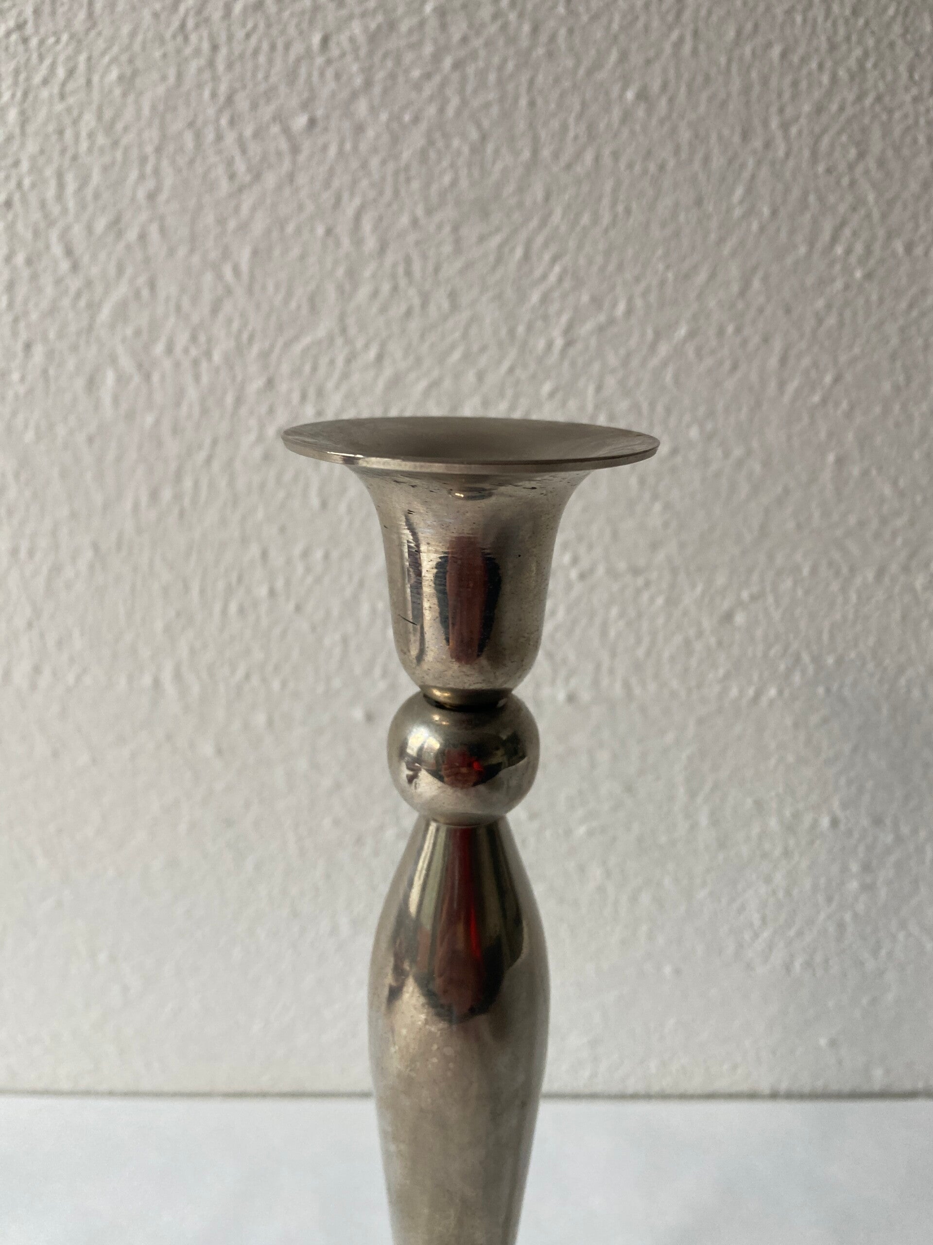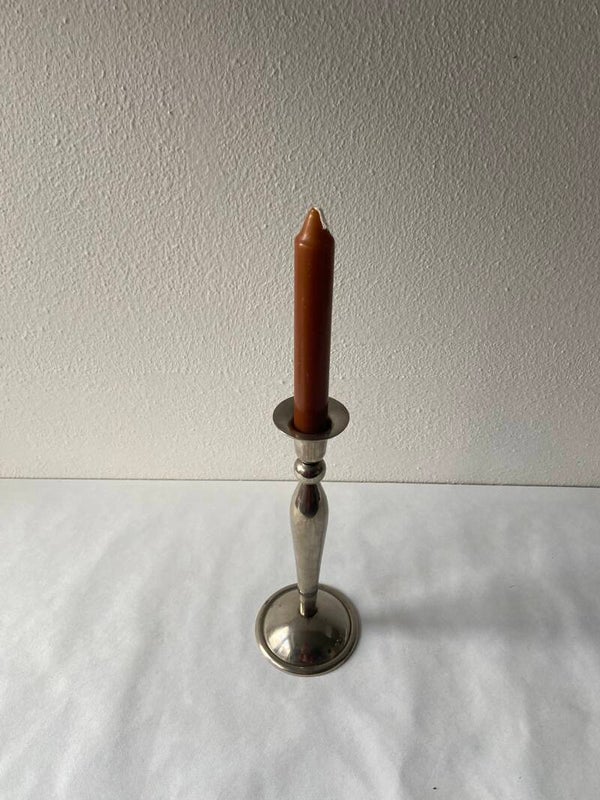 Mooi vormgegeven zilverkleurige kandelaar met ronde vormen bij de voet en steel.