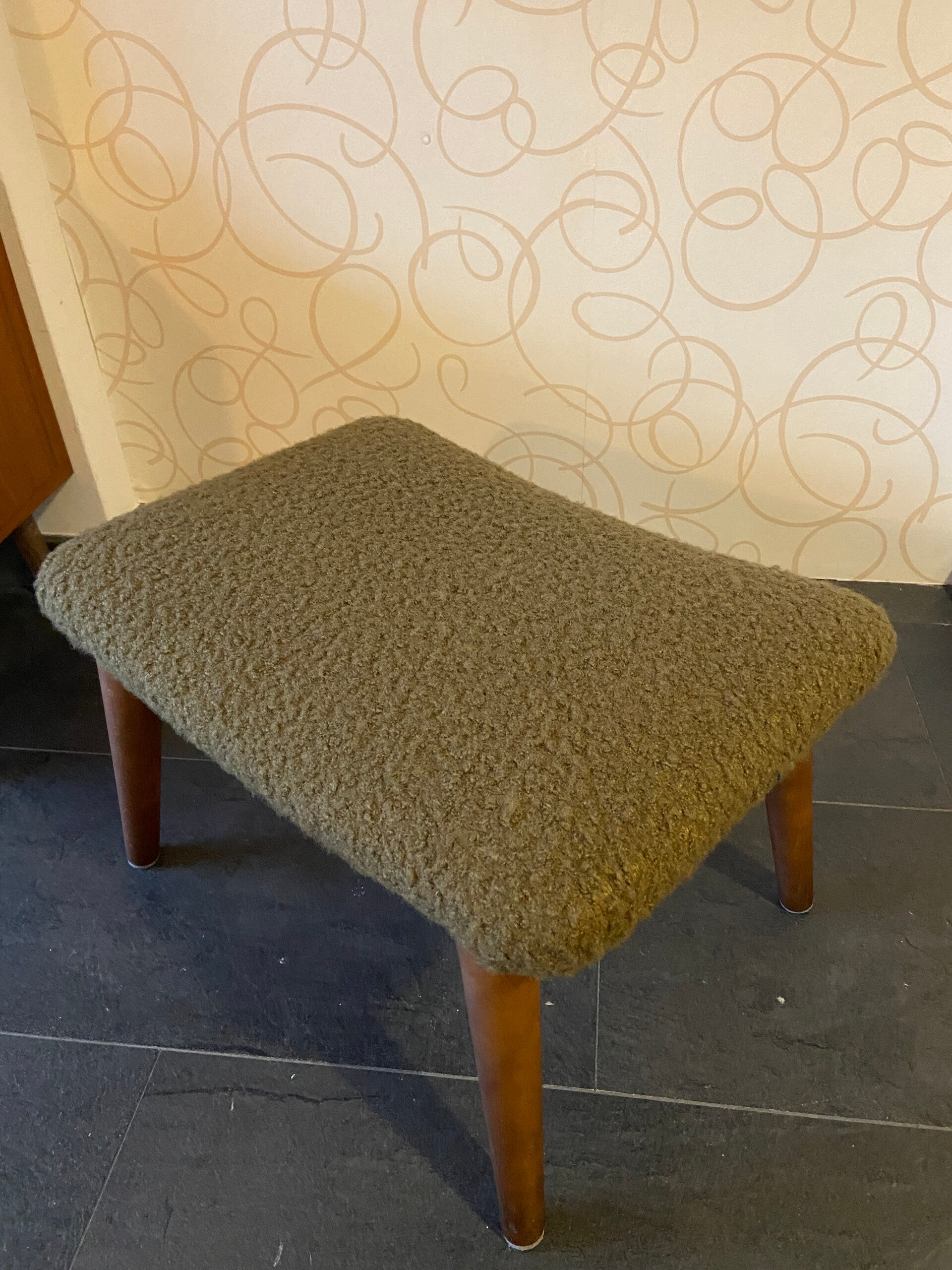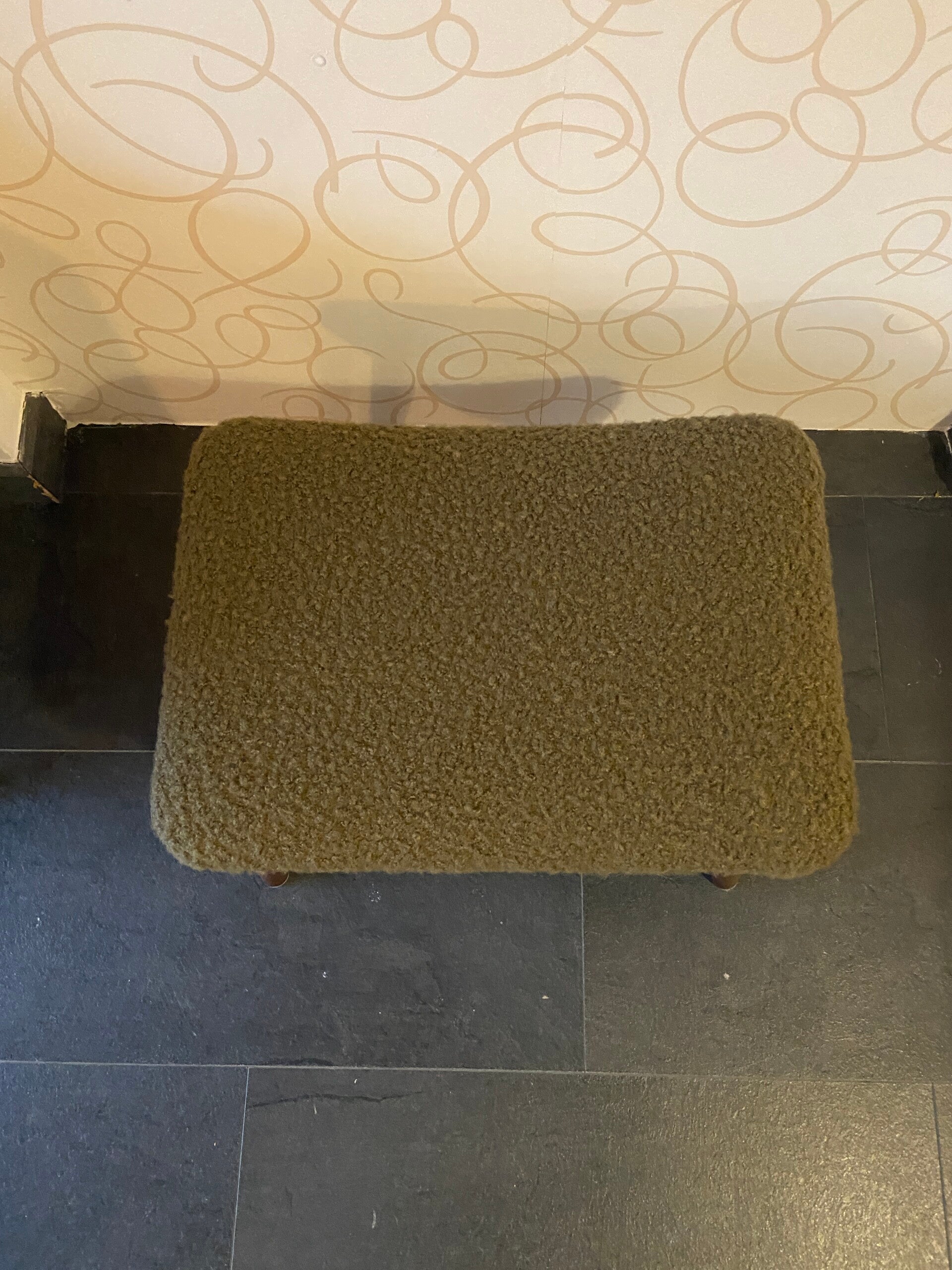 Voetenbankje, uitgevoerd met een nieuwe zachte boucléstof in olijfgroen. De posten kunnen er af voor vervoer of verzending.