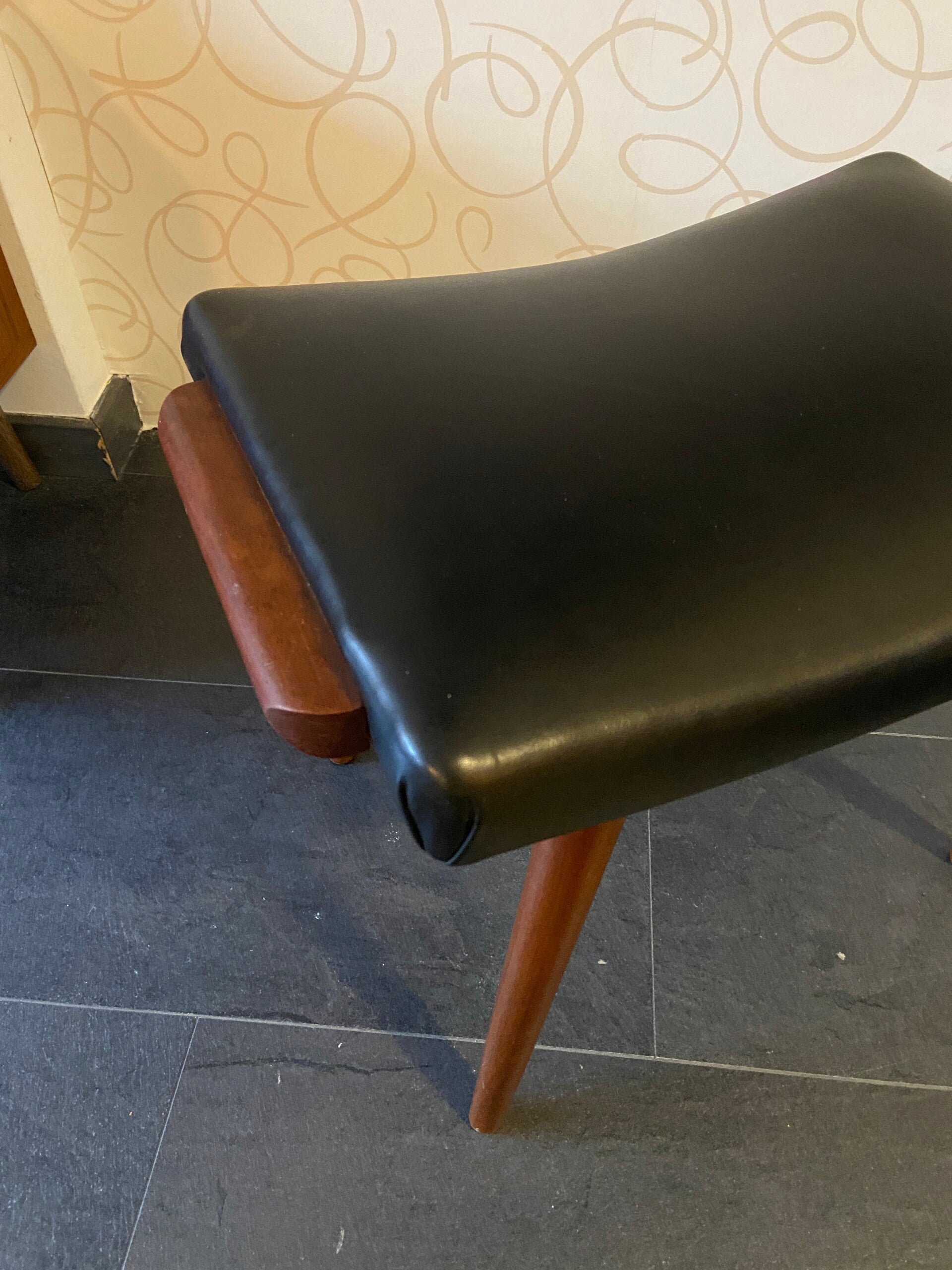 Vintage Deens voetenbankje met originele zwarte kunstlederen bekleding