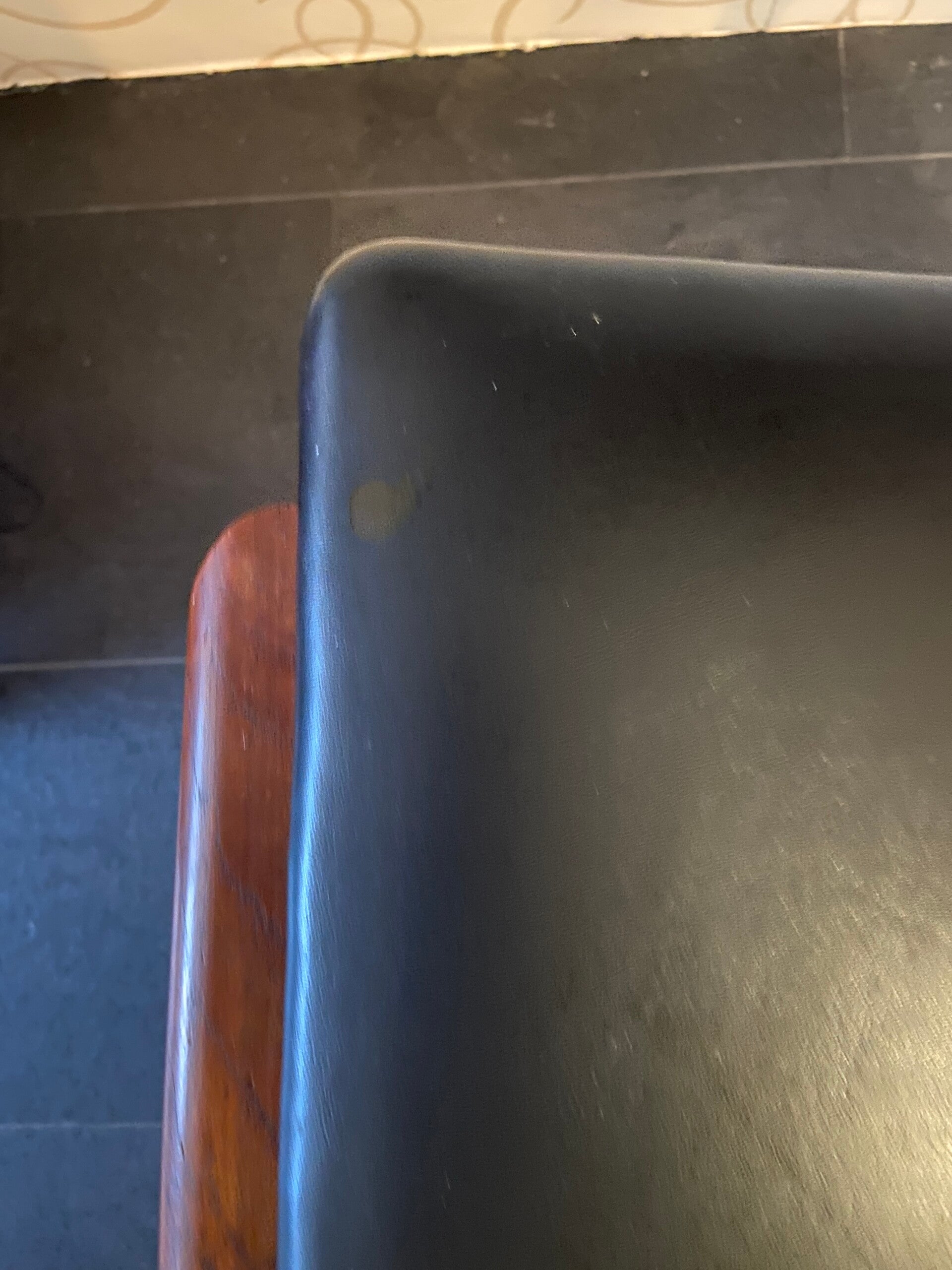Deens voetenbankje in een klassieke kleurencombinatie van een zwart kunstlederen bekleding (skai) en een roodbruin houten frame. De conditie is goed met een klein plekje op het leer; zie de detailfoto.