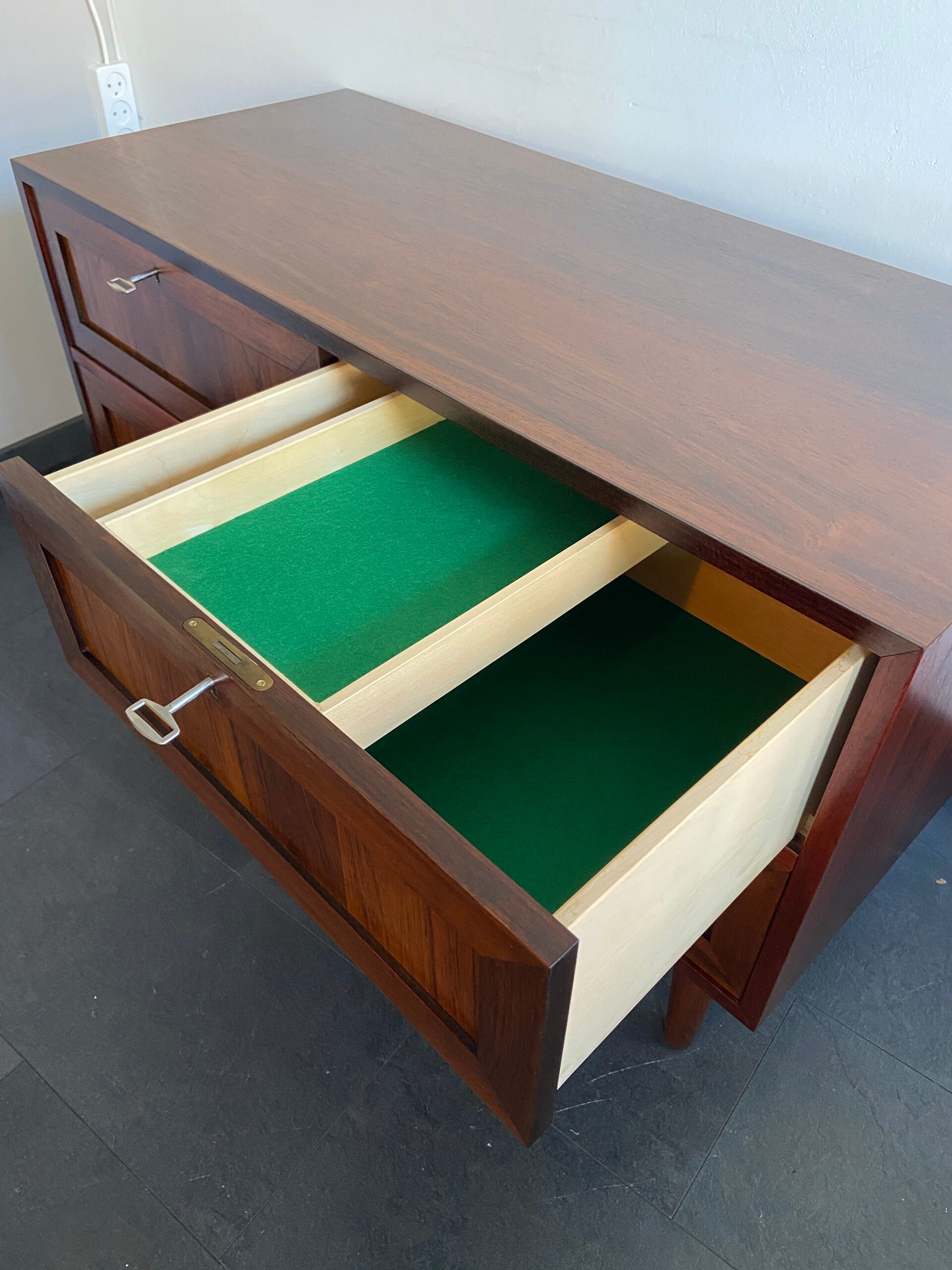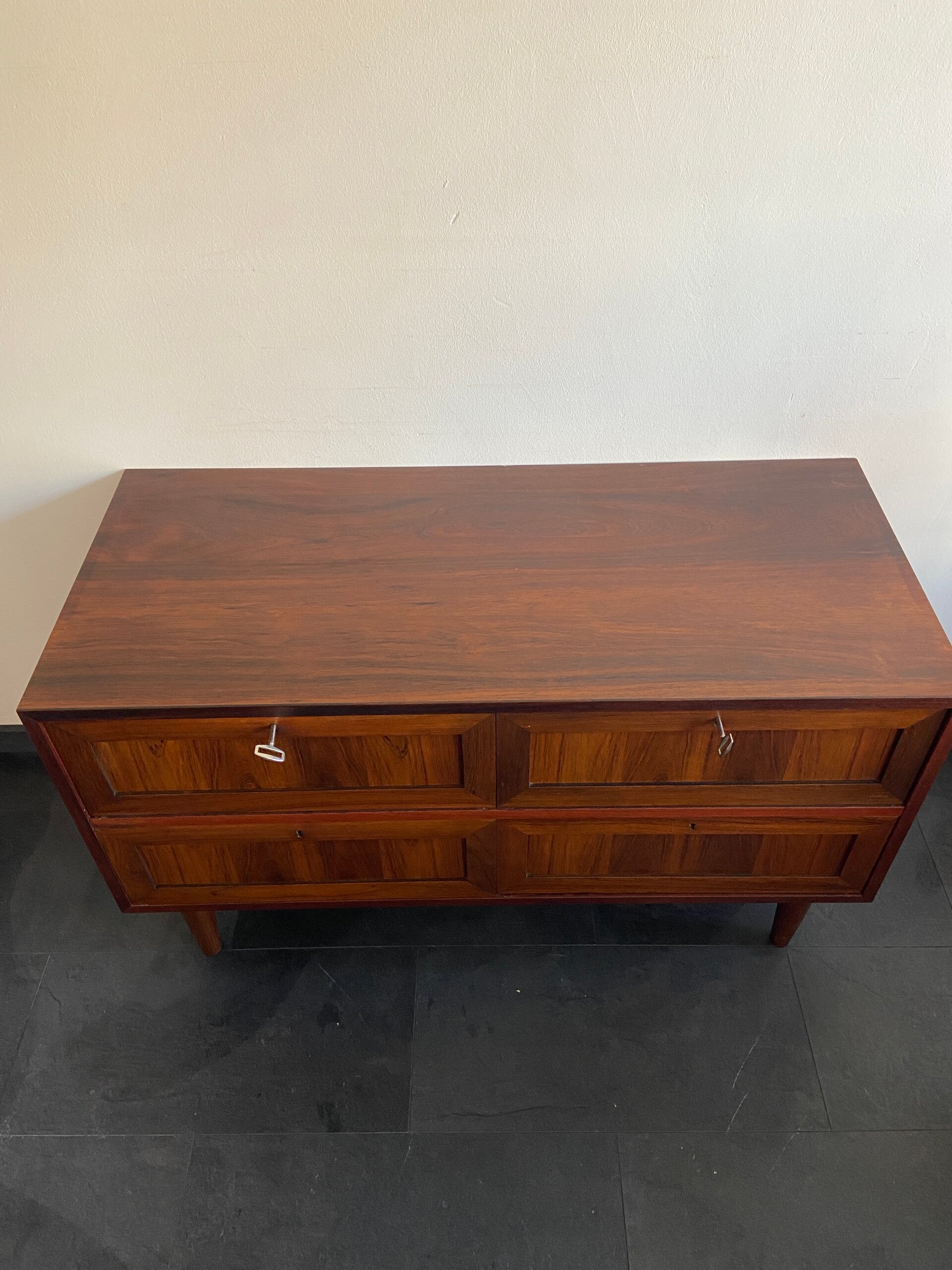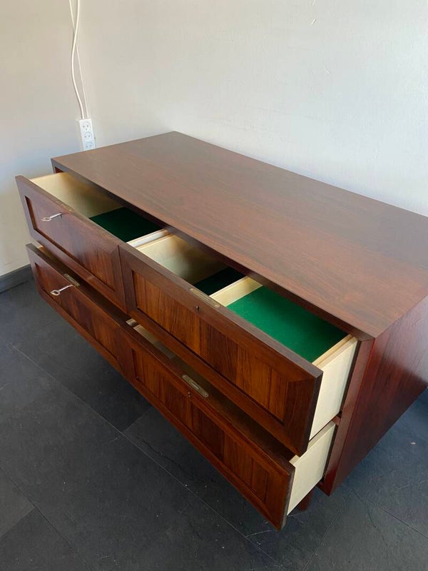 Bijzonder mooie wandkast/dressoir van palissander met 4 laden. De twee bovenste laden hebben een vilten bekleding, waarbij de rechterlade nog een dubble inzet heeft. De laden kunnen elk afzonderlijk worden afgesloten. De kast verkeert in mooie staat met minimale gebruikssporen.