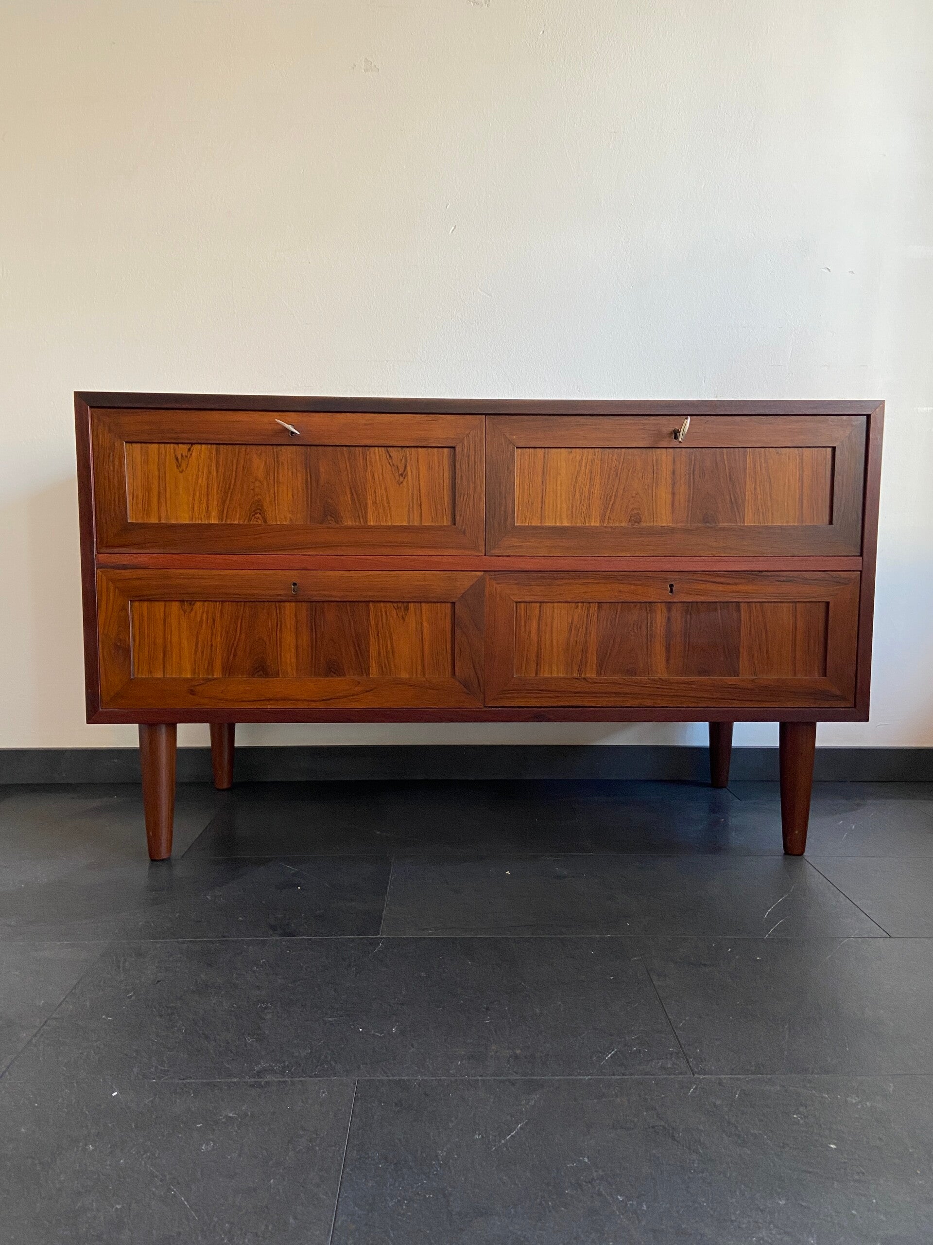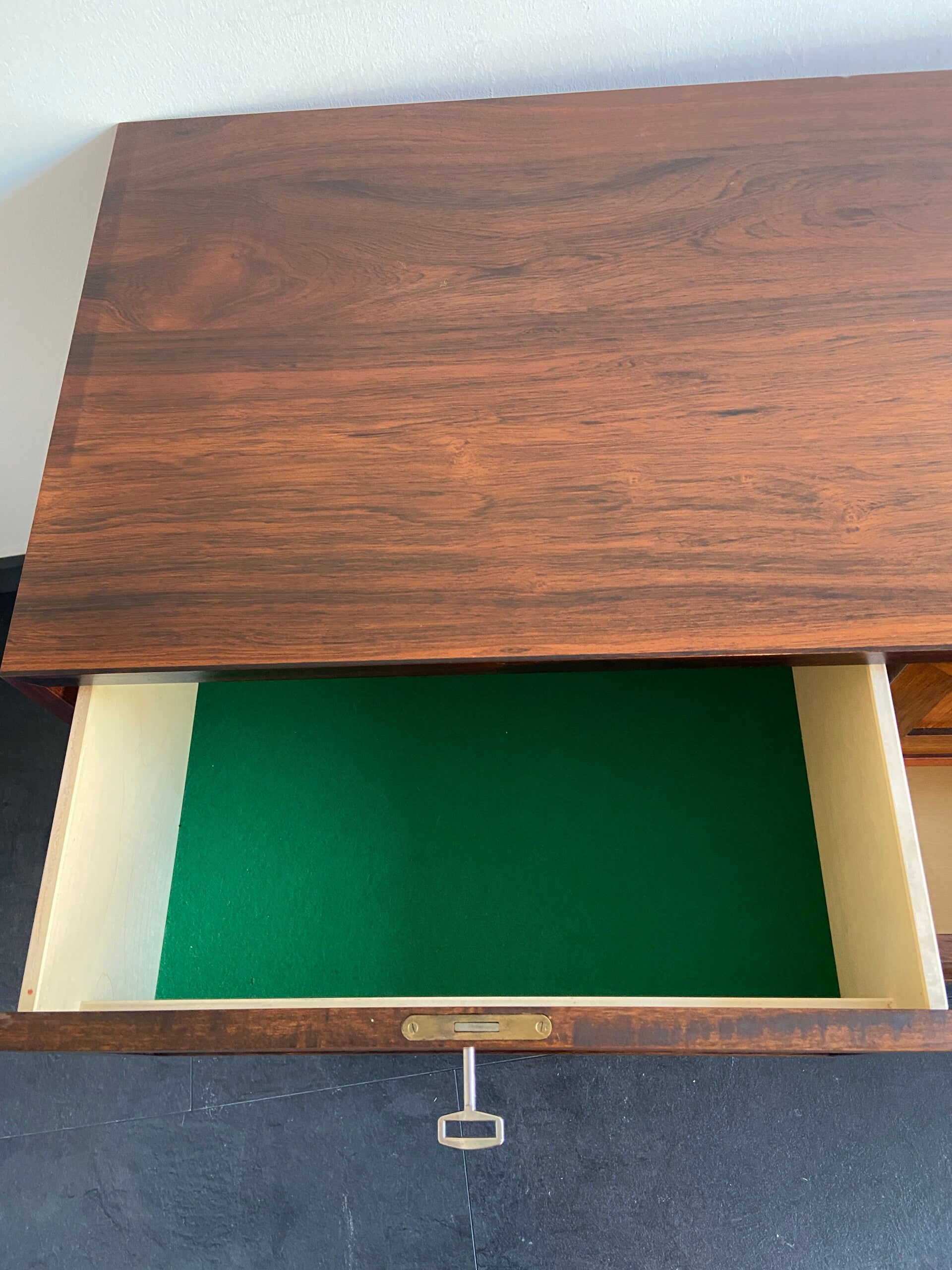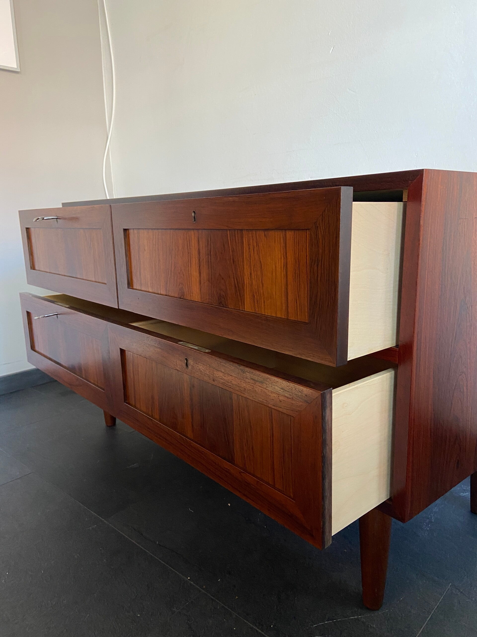 Bijzonder mooie wandkast/dressoir van palissander met 4 laden. De twee bovenste laden hebben een vilten bekleding, waarbij de rechterlade nog een dubble inzet heeft. De laden kunnen elk afzonderlijk worden afgesloten. De kast verkeert in mooie staat met minimale gebruikssporen.