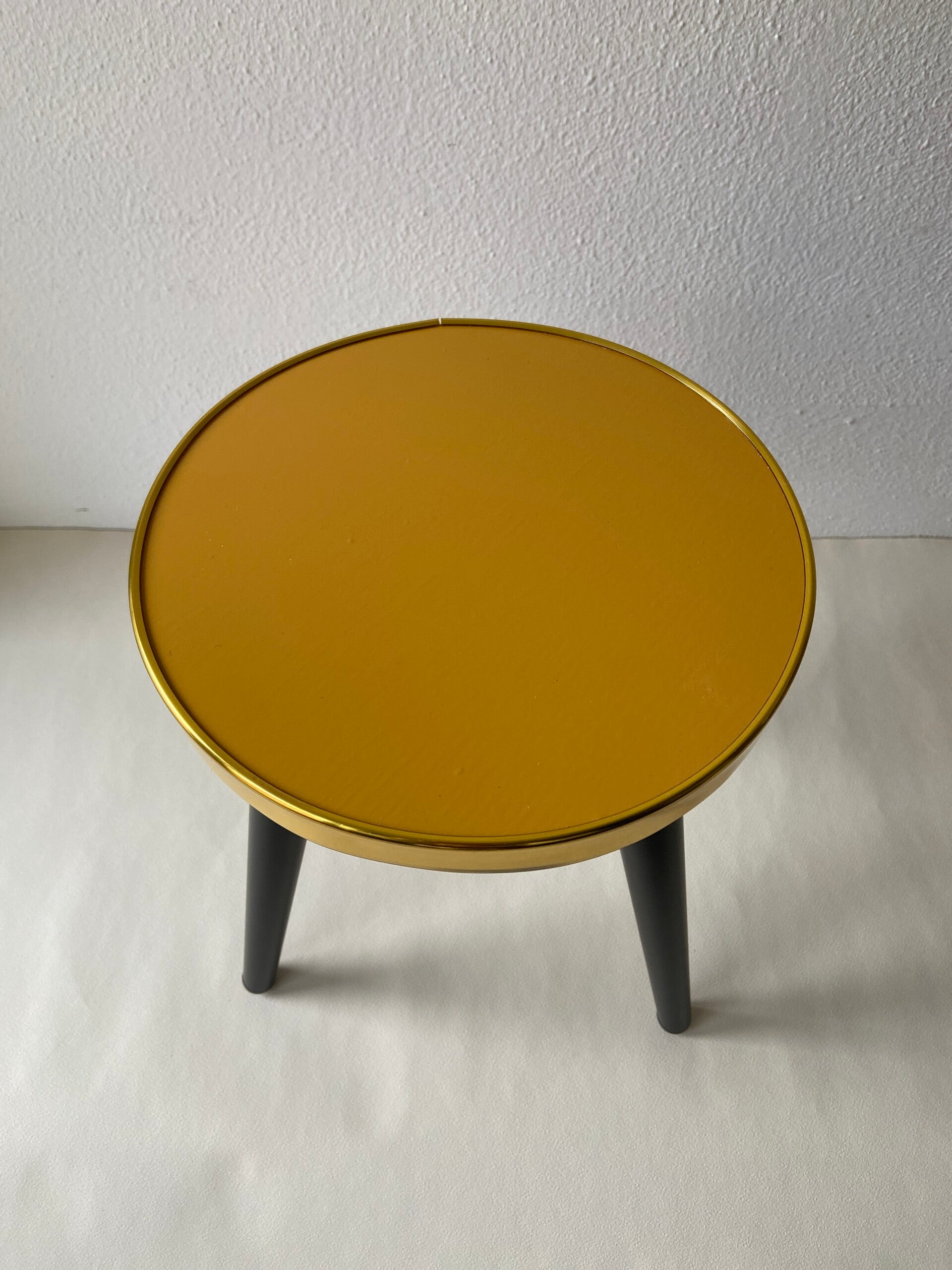 Dit retro plantentafeltje/bijzettafeltje is duurzaam handgemaakt met een tafelblad van hergebruikt hout. Het gele tafelblad heeft een goudkleurige band. Het tafeltje staat op zwart metalen poten.