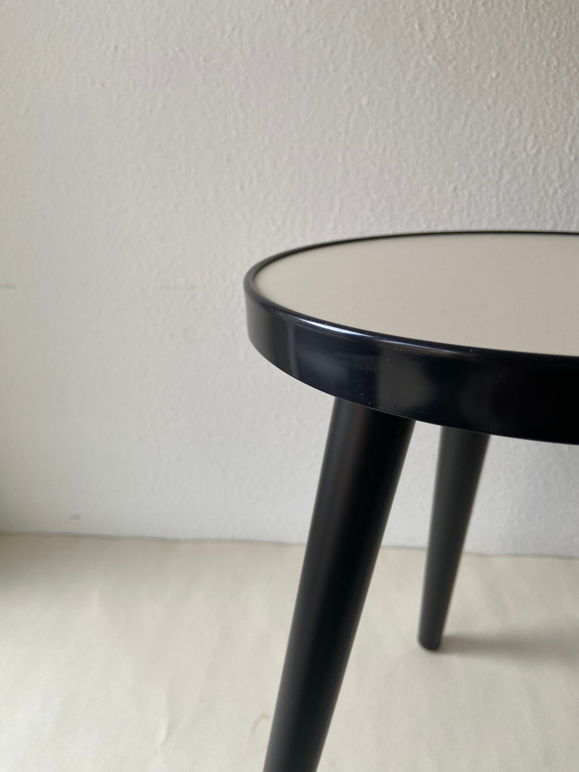 Dit retro plantentafeltje/bijzettafeltje is duurzaam handgemaakt met een tafelblad van hergebruikt hout. Het roomwitte tafelblad heeft een zwarte band. De tafel staat op zwart metalen poten.
