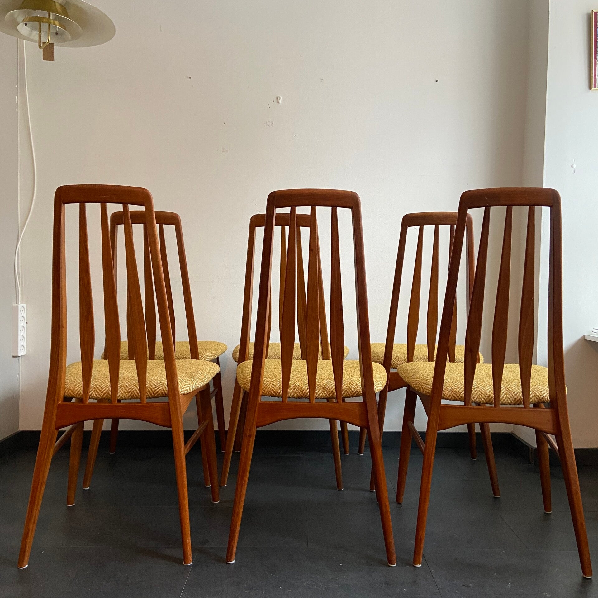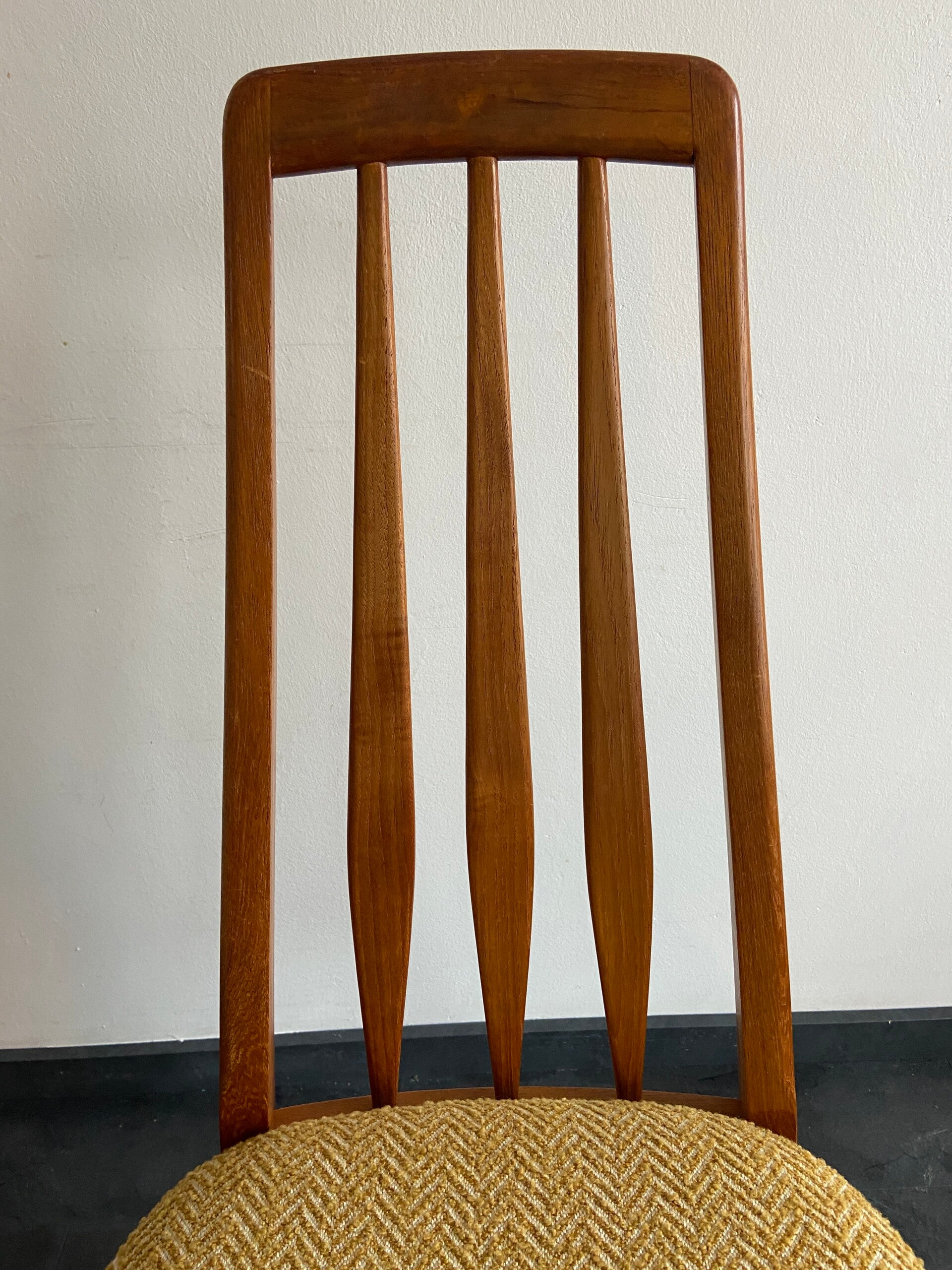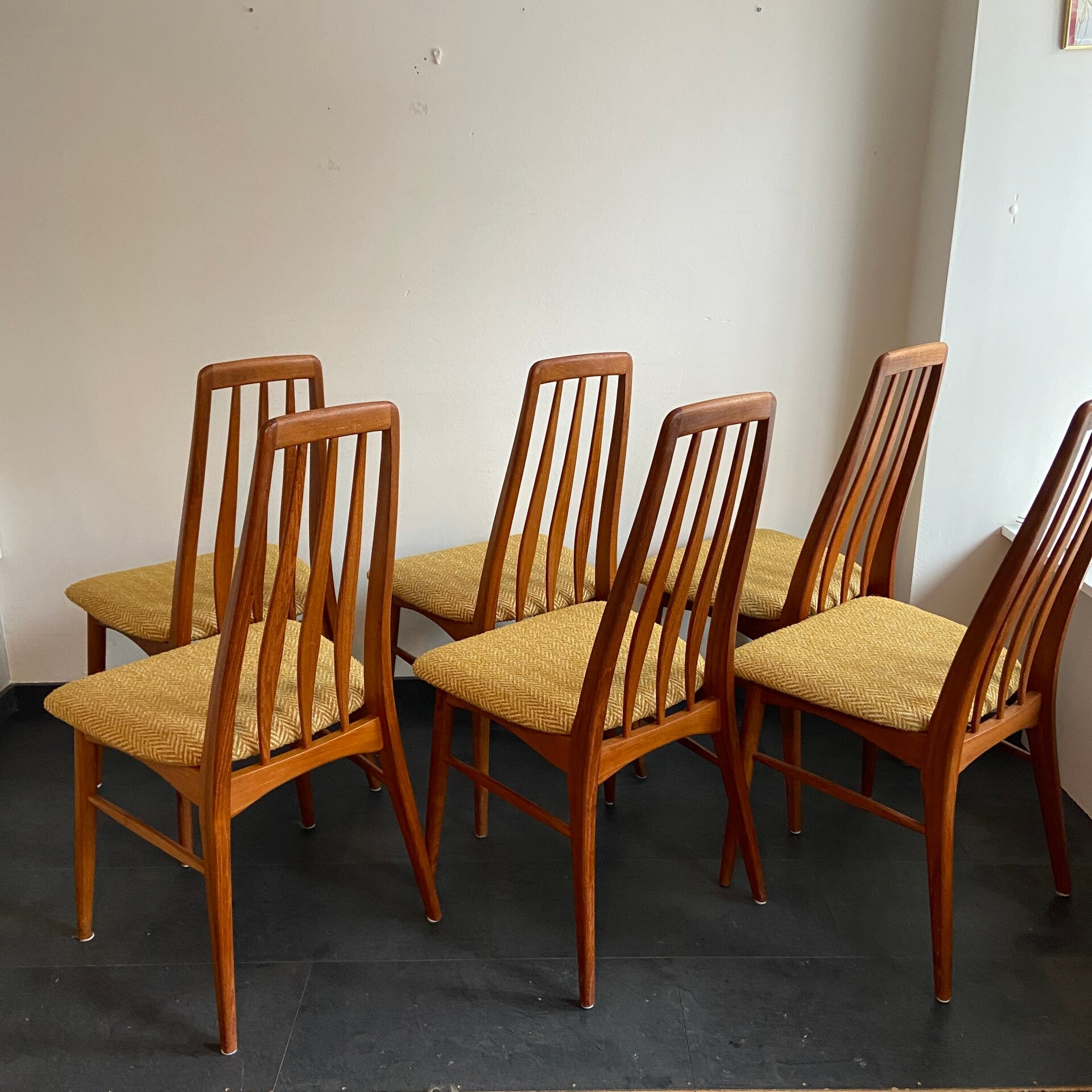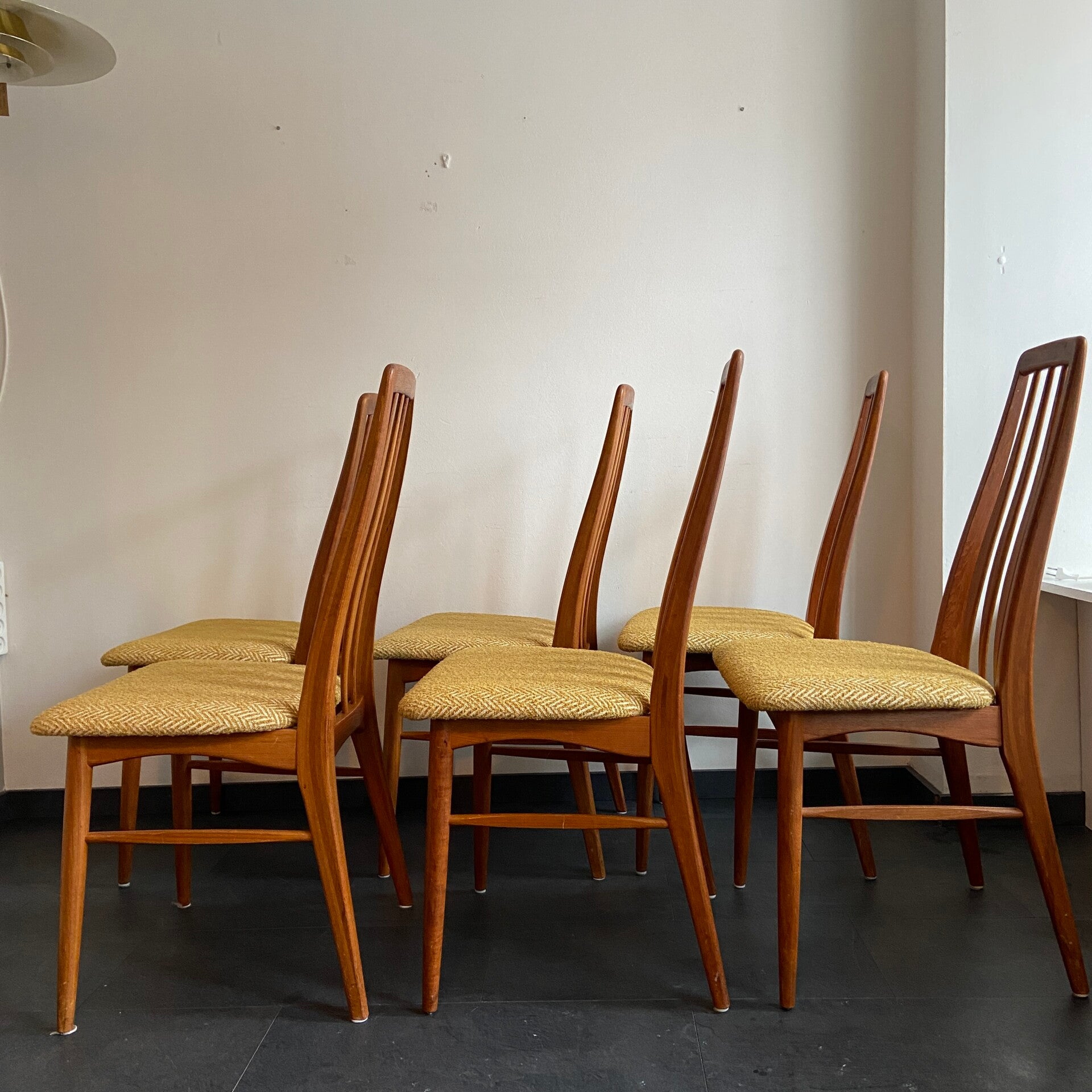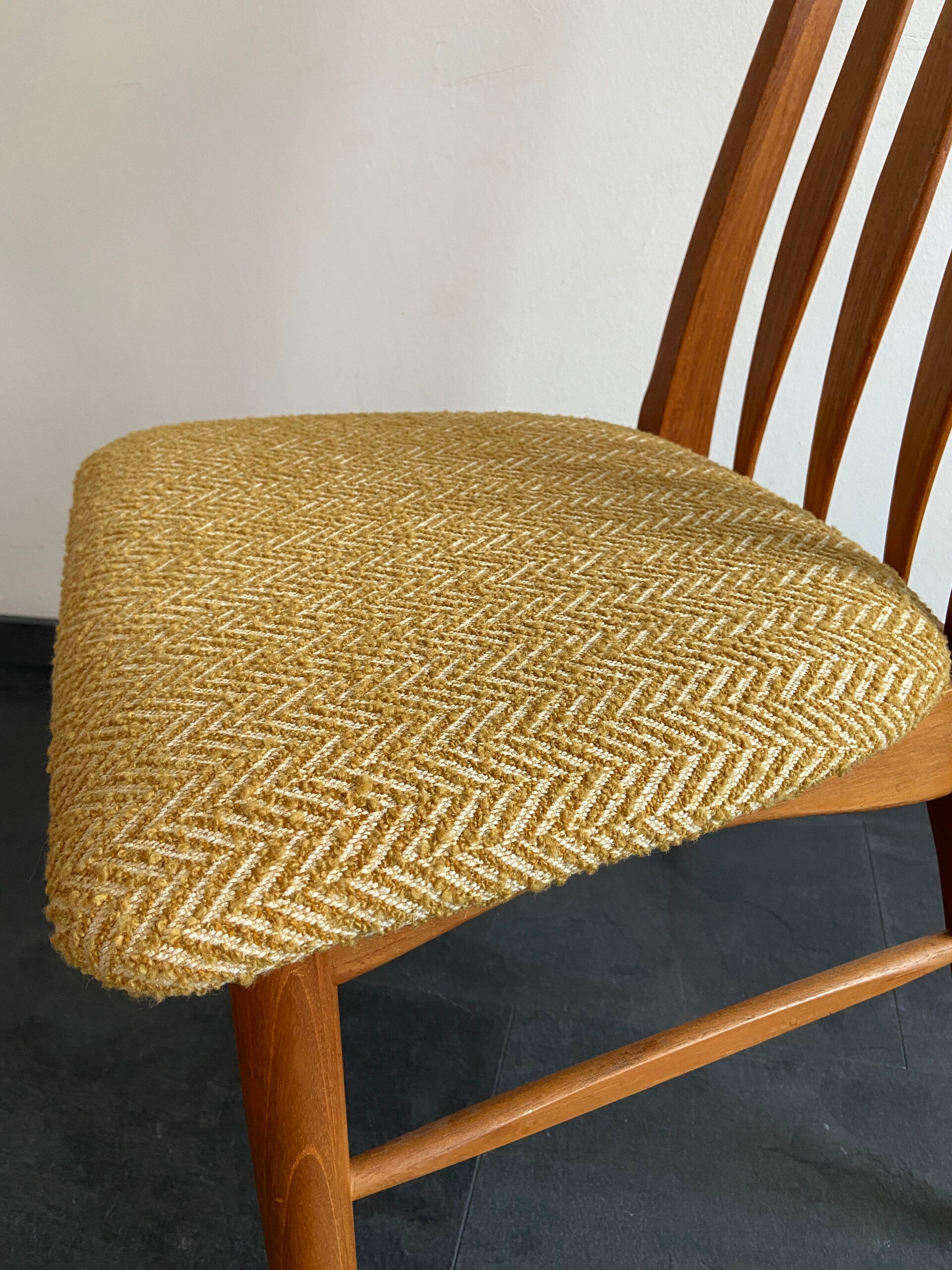 Prachtige set van maar liefst 6 Deense eetkamerstoelen, model Eva, ontworpen door Niels Kofoed voor Hornslet. De stoelen hebben een teakhouten frame en zijn nieuw gestoffeerd met een gemêleerde, gele boucléstof.