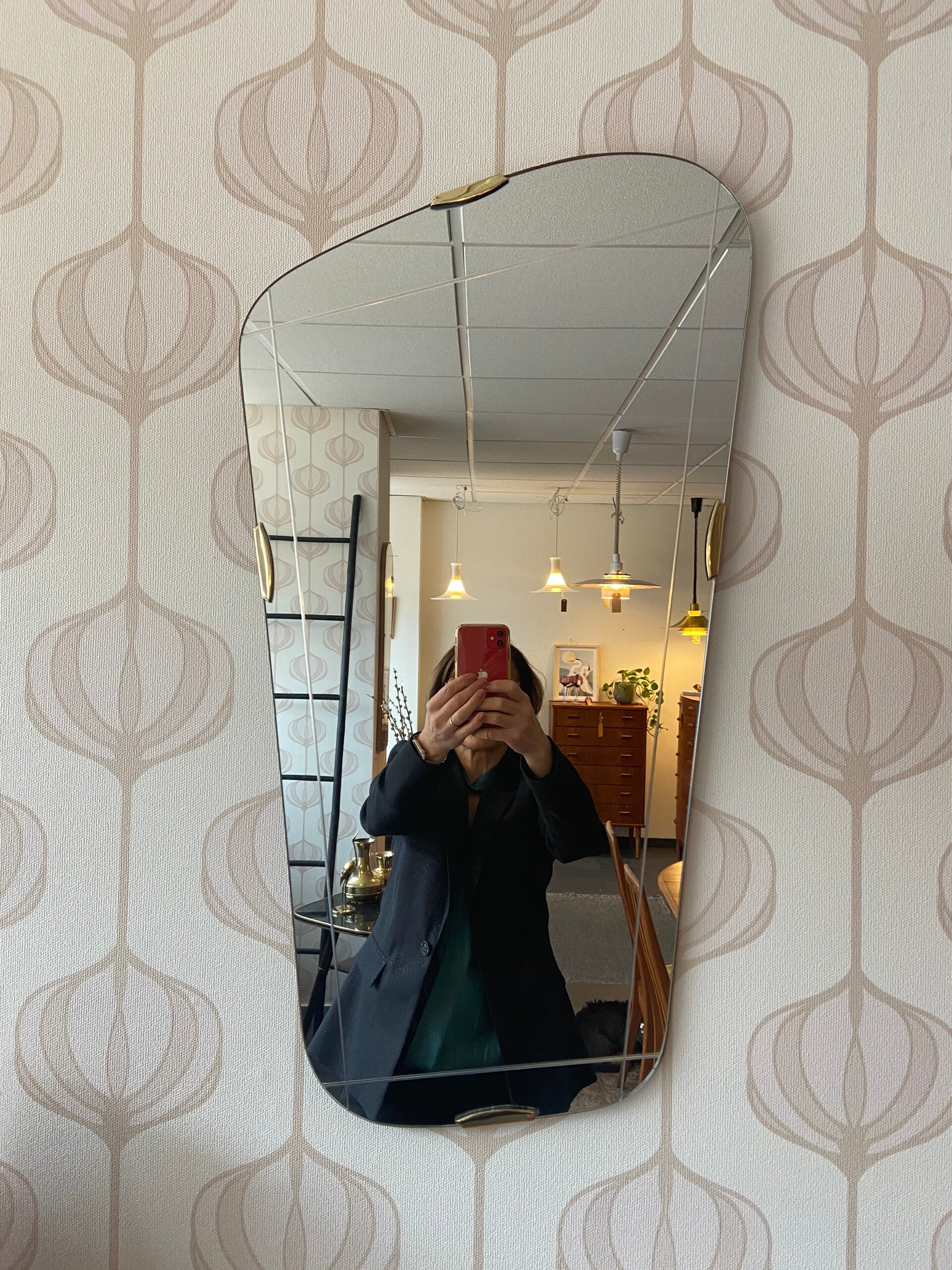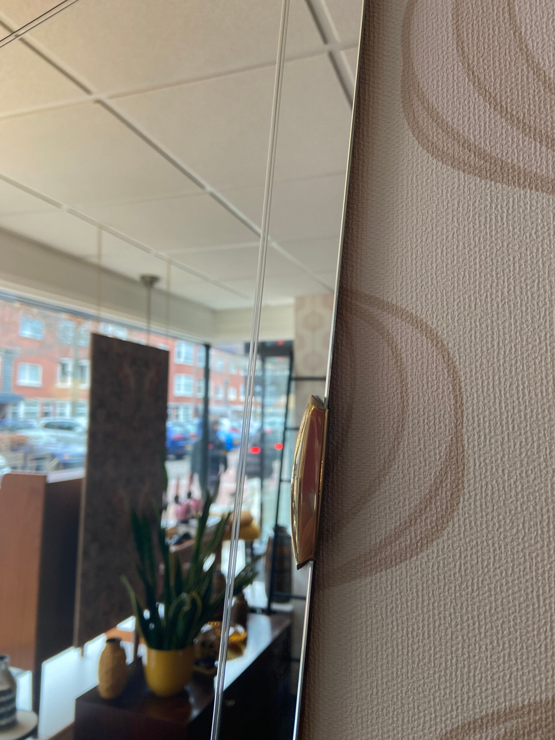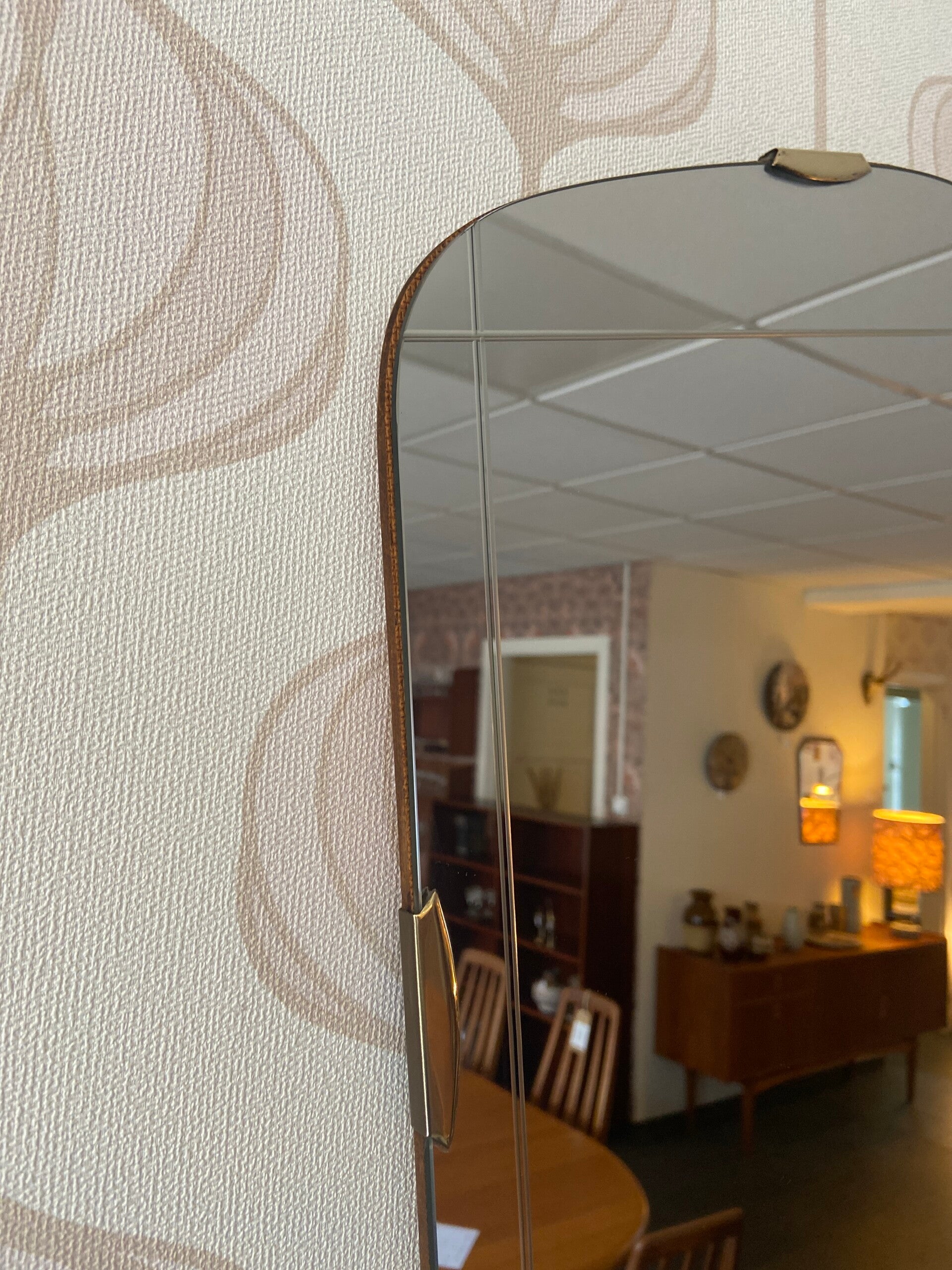 Bijzonder gevormde spiegel met messing details en ingeslepen patroon aan de rand van de spiegel De spiegel verkeert in mooie staat.