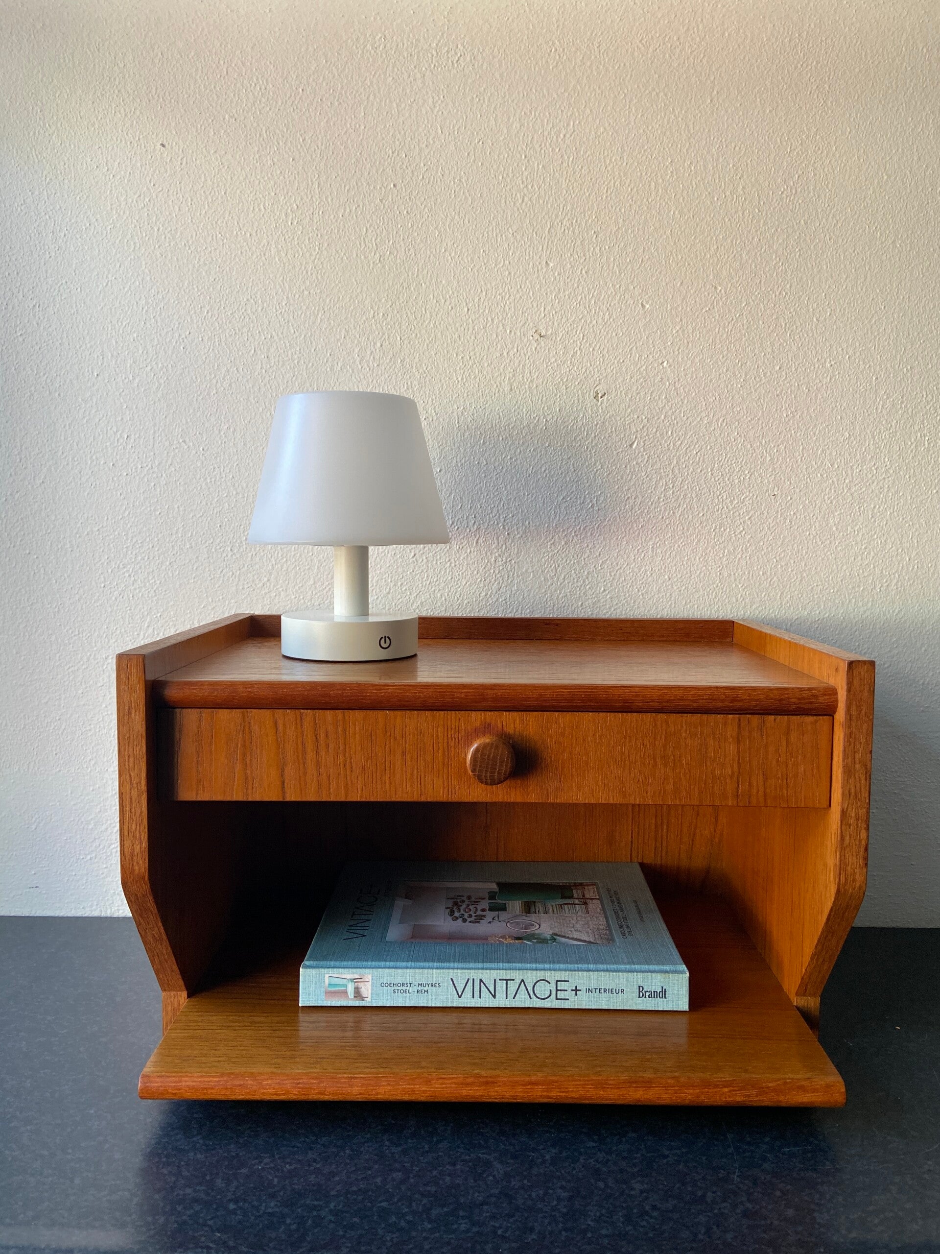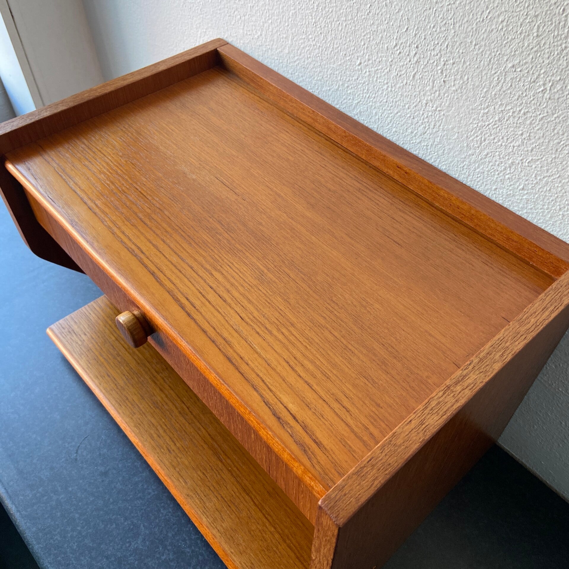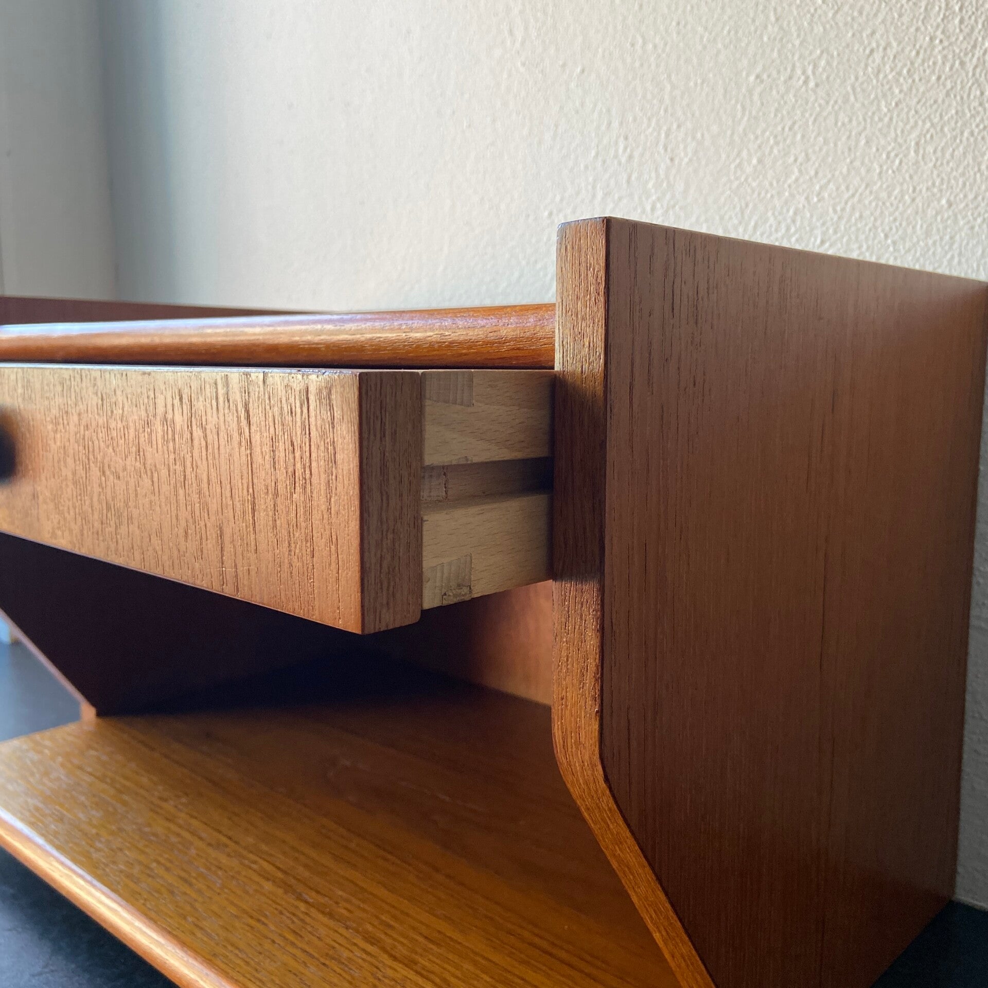 Zeer mooi zwevend kastje met lade en open vak. Het kastje is gemaakt van honingkleurig teakfineer en verkeert in mooie staat.