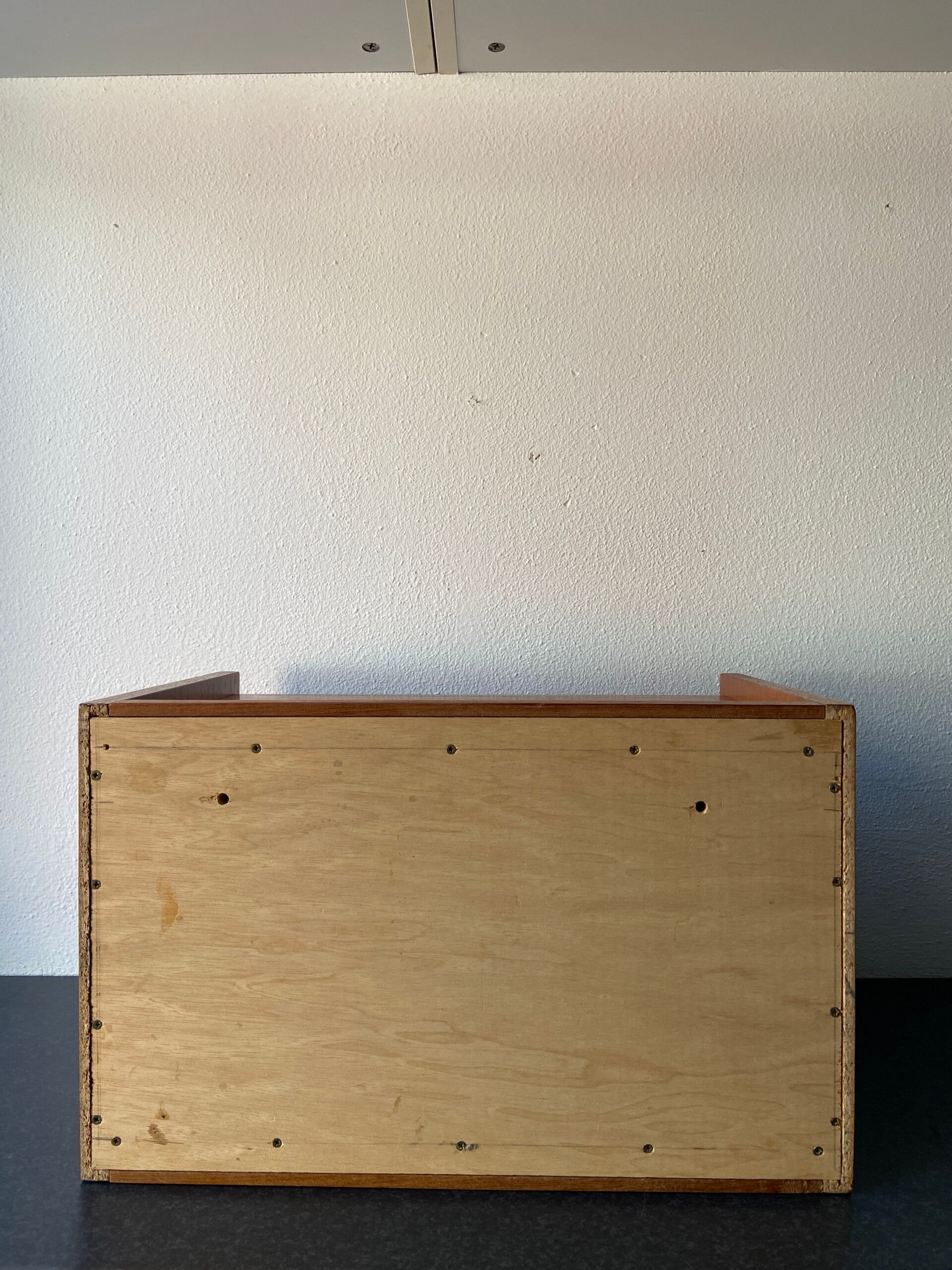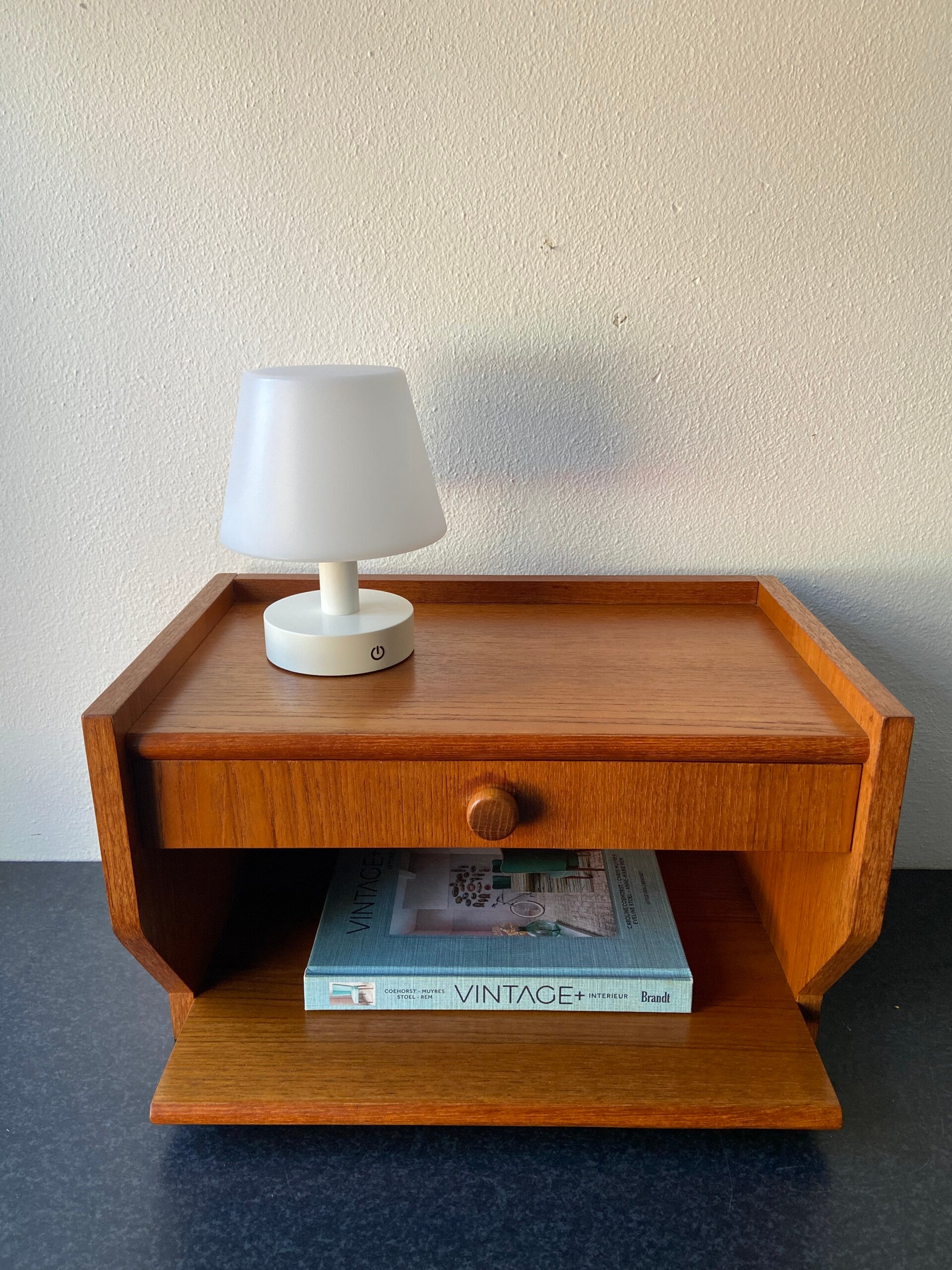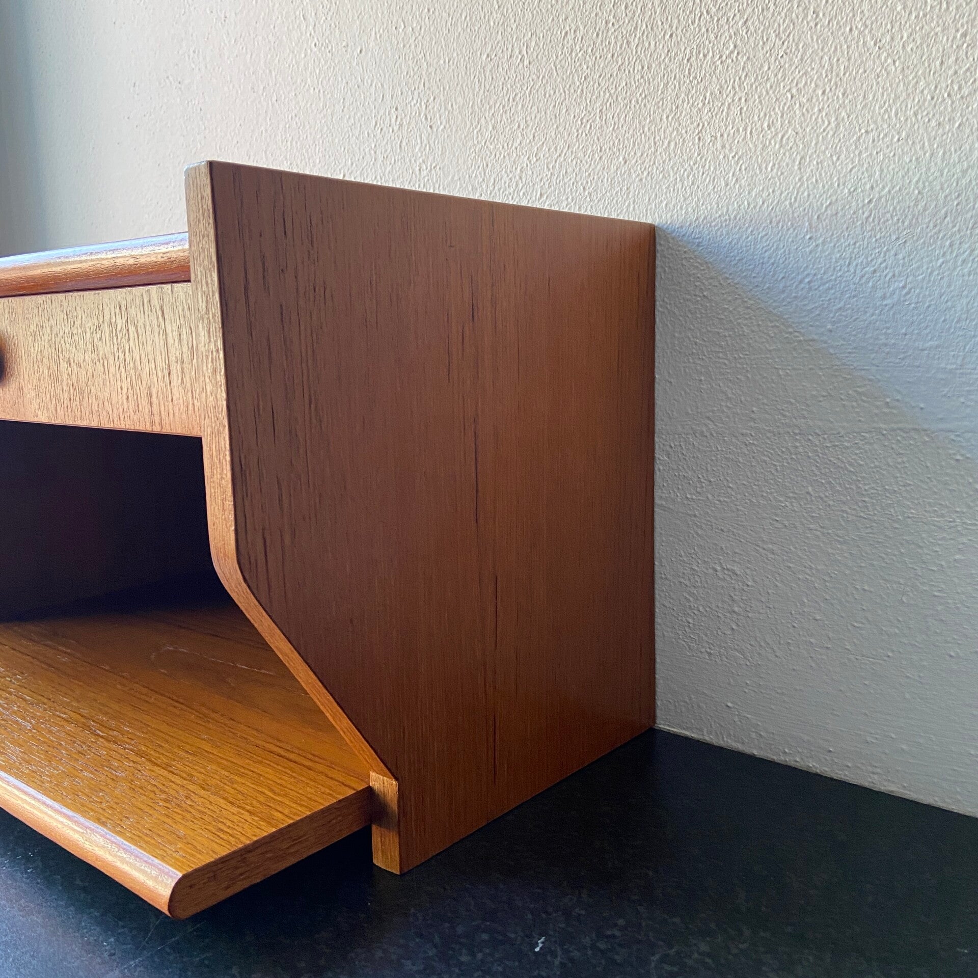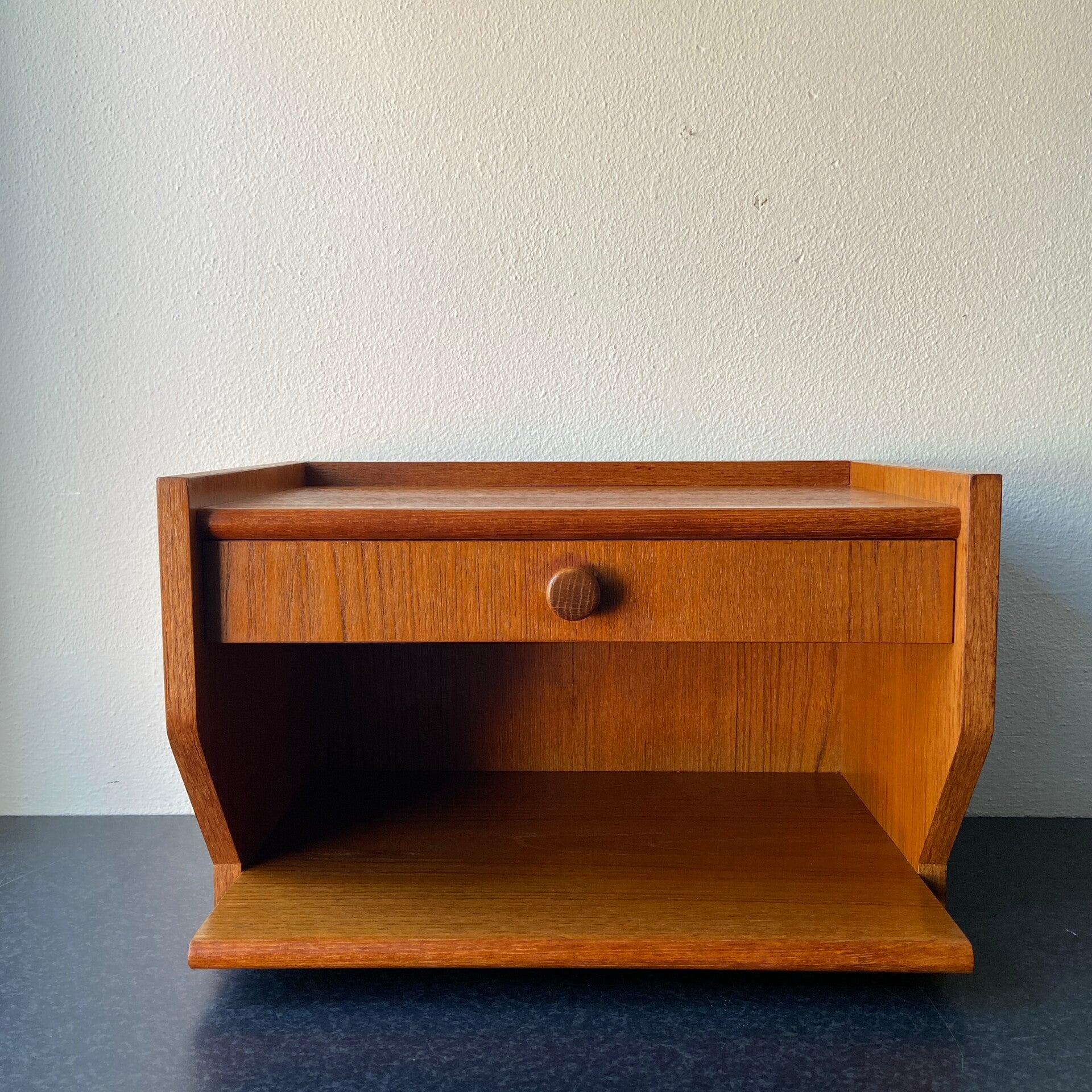 Zeer mooi zwevend kastje met lade en open vak. Het kastje is gemaakt van honingkleurig teakfineer en verkeert in mooie staat.