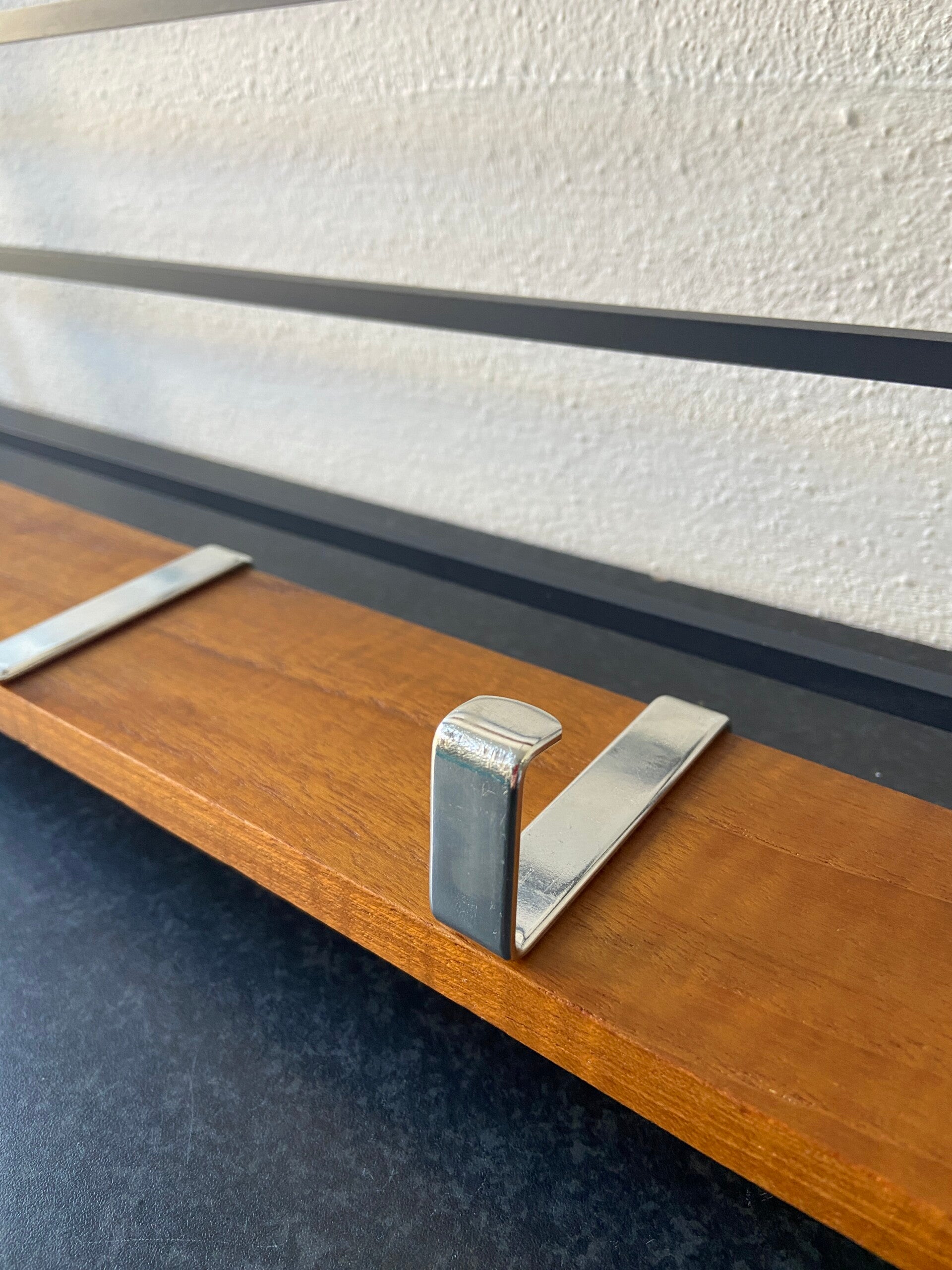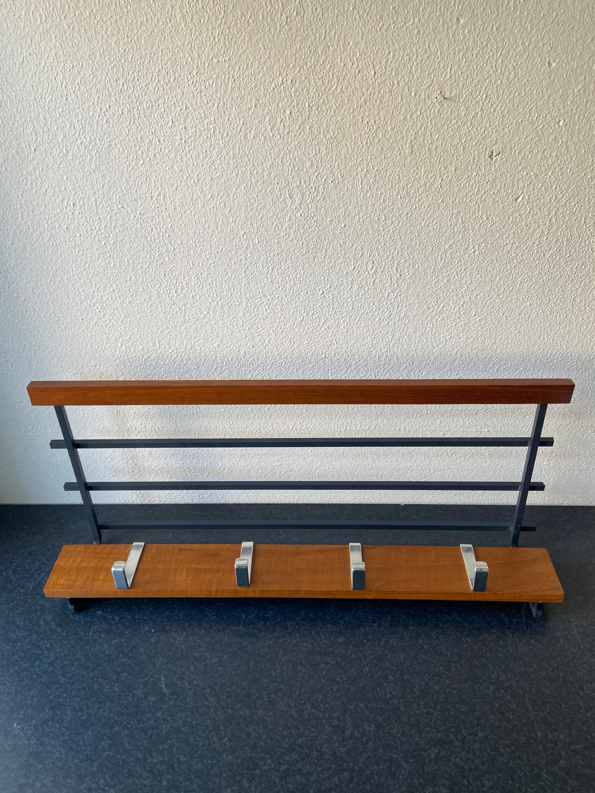 Vintage kapstok in een tijdloze combinatie van warm hout en zwart metaal. De kapstok heeft 4 haken van chroom en een rek voor hoeden e.d. De kapstok verkeert in mooie staat met lichte gebruikssporen.
