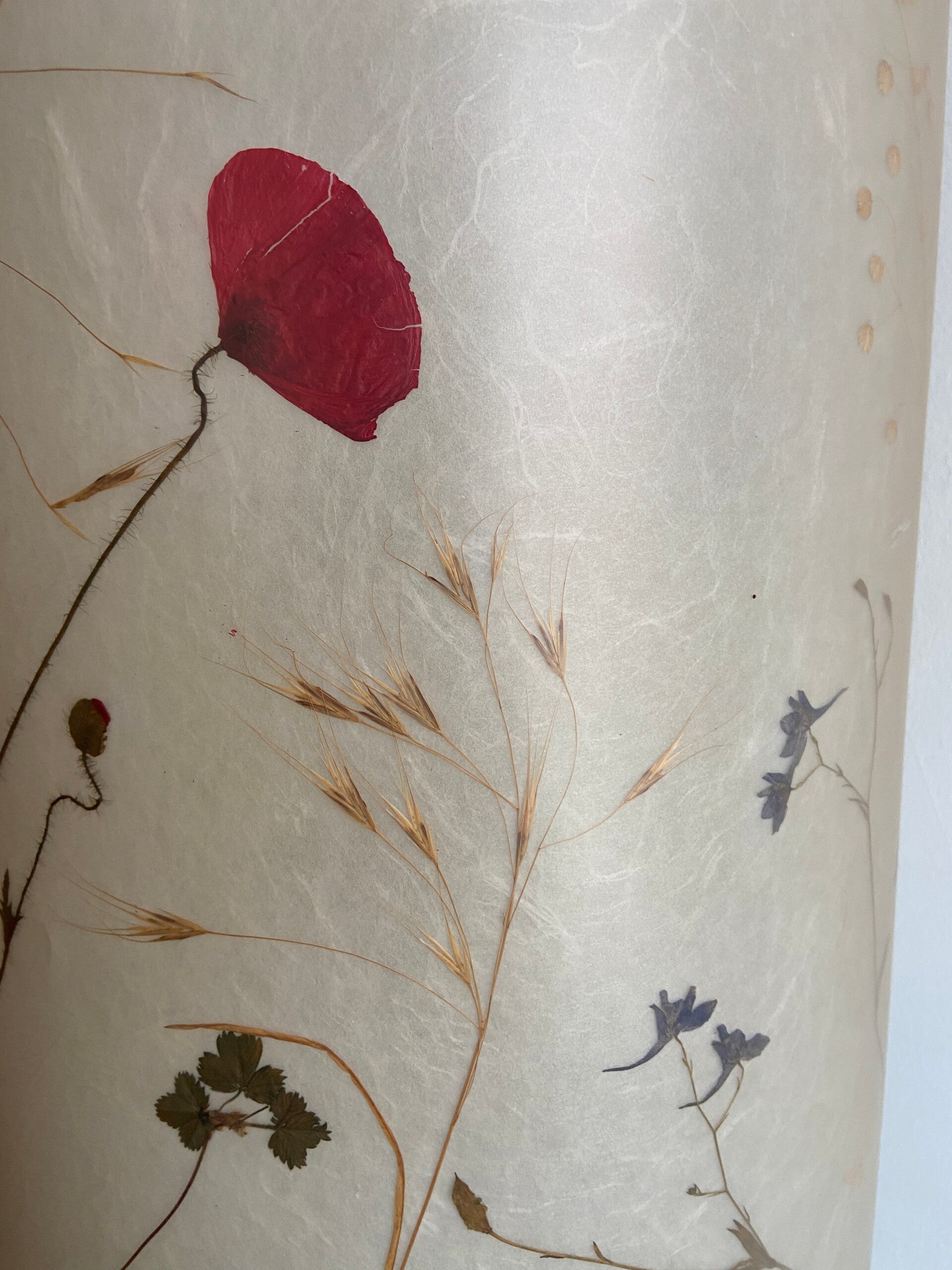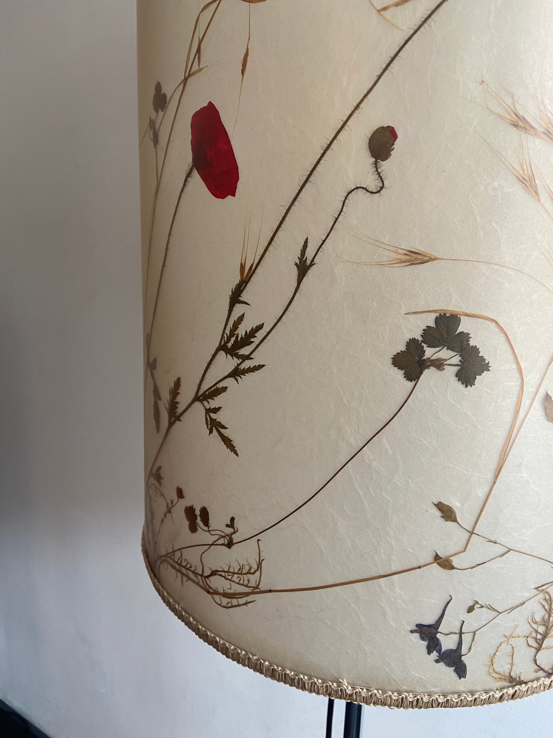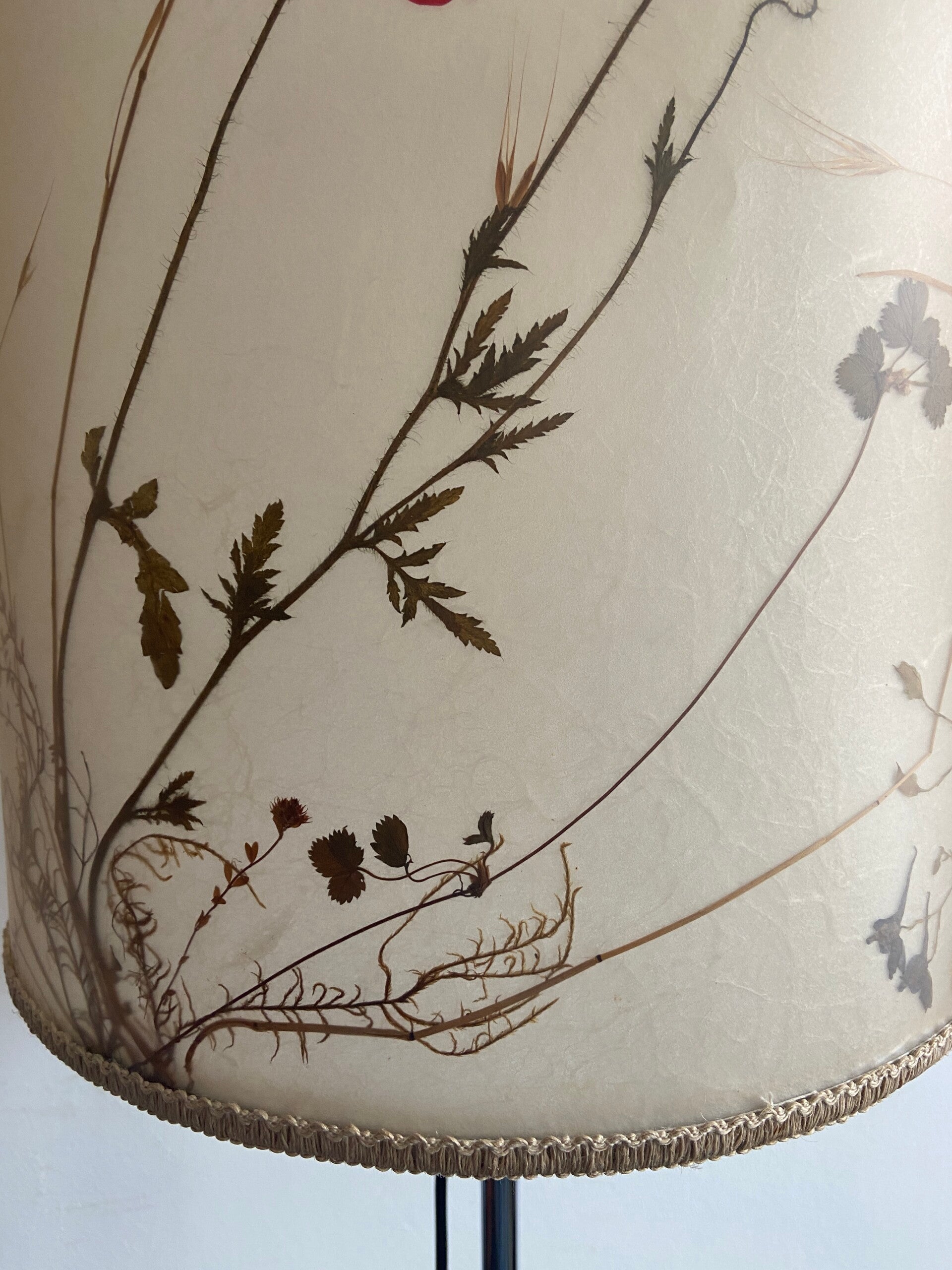 Zeer bijzondere vloerlamp van het Duitse Staff Leuchten design merk, jaren '60. De kap heeft een dubbele wand waartussen een patroon van echte droogbloemen is verwerkt. De kap is in hoogte verstelbaar en voorzien van een armatuur voor 2 E27 lampen. In mooie staat met wat minimale gebruikssporen op het metaal.